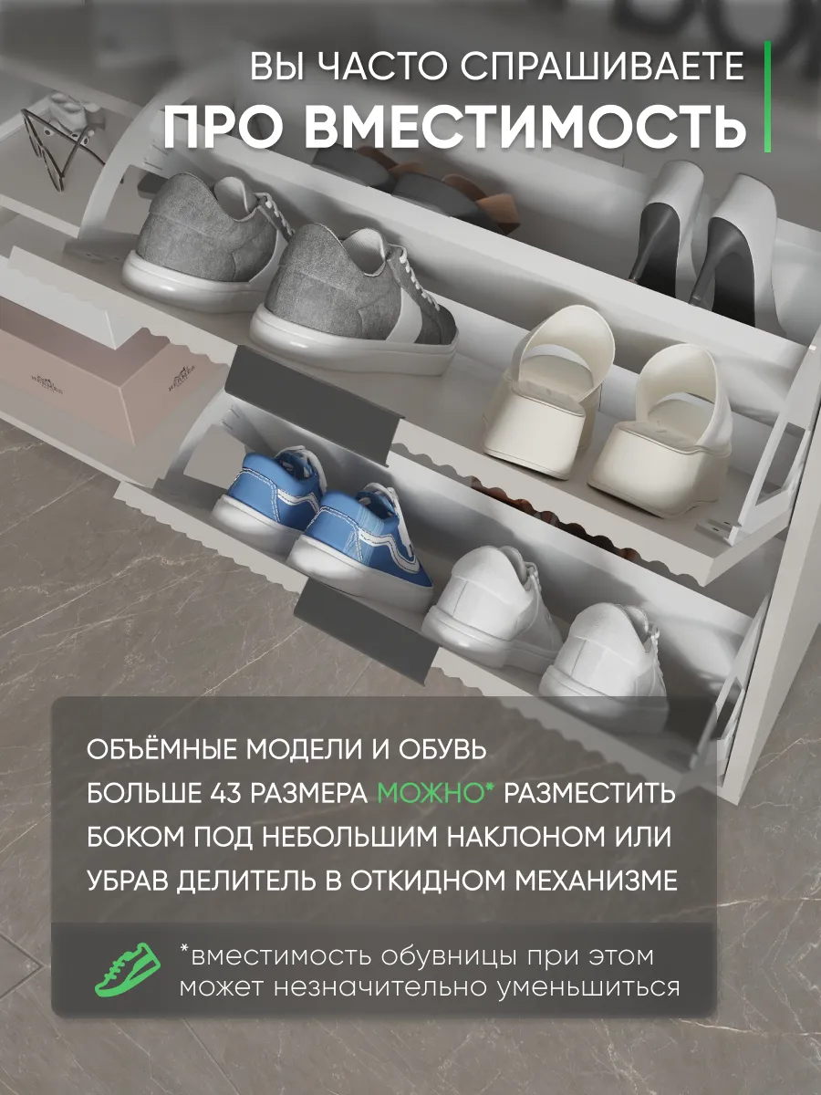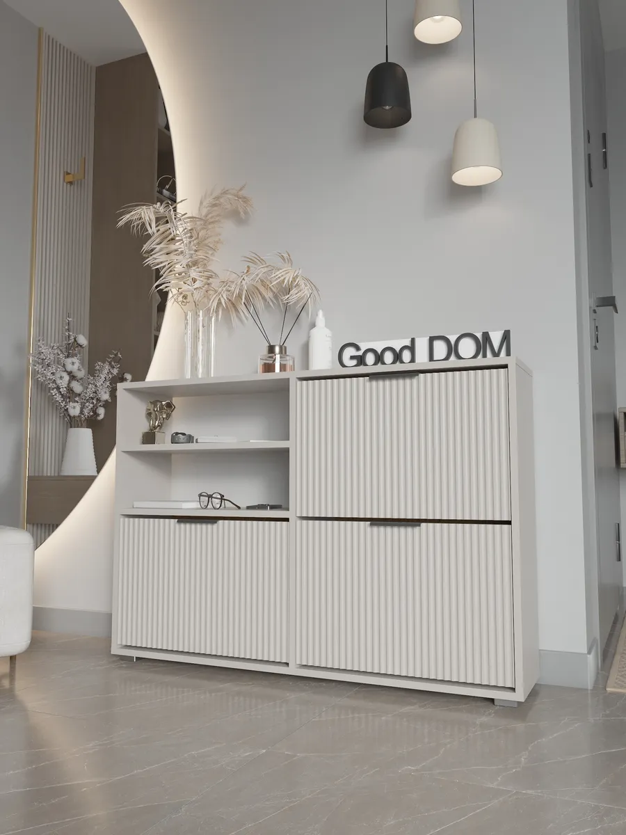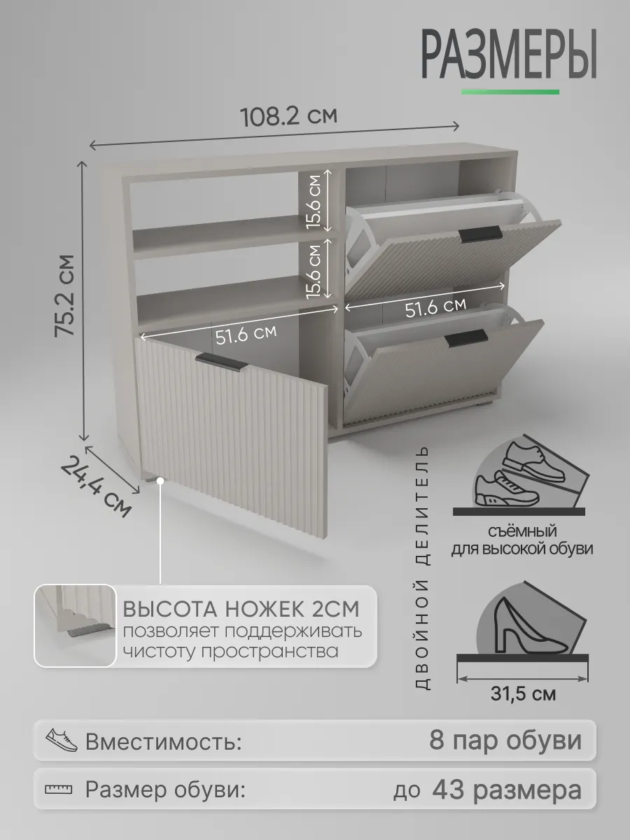 Вместительный и компактный деревянный стеллаж для хранения обуви станет отличным решением для прихожей или коридора дома. Эта небольшая обувная этажерка с закрытым фасадом и откидной дверцей позволяет аккуратно разместить пары различной высоты — от низких моделей до сапог. Благодаря дизайнерскому стилю в бежевом цвете с пленочным покрытием и лаком изделие органично впишется в интерьер в стиле лофт или soft touch. Настенный вариант поможет сэкономить пространство, а глубокий задний ящик обеспечит дополнительное место для мелочи и аксессуаров. Такой гардеробный предмет мебели легко поддерживать в чистоте, а его практичная конструкция с полками и подставками обеспечивает удобное хранение обуви, позволяя быстро ориентироваться в гардеробе. Этот стильный и компактный стеллаж станет хорошим выбором для любого дома, предлагая удобство и порядок, которые особенно ценятся в небольших прихожих и на балконе.