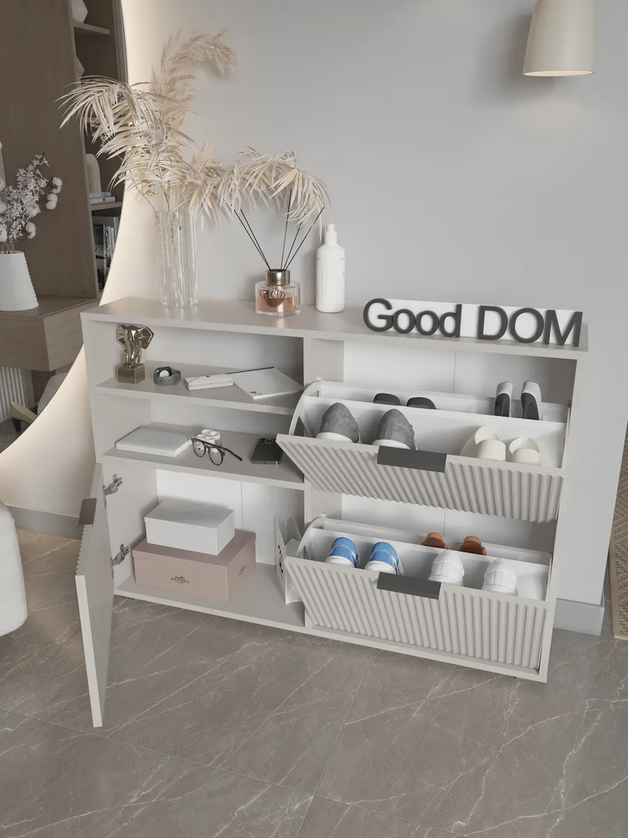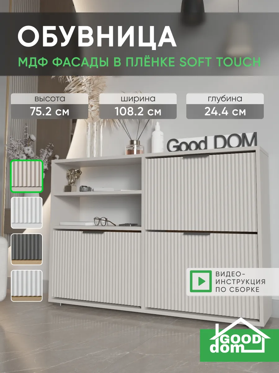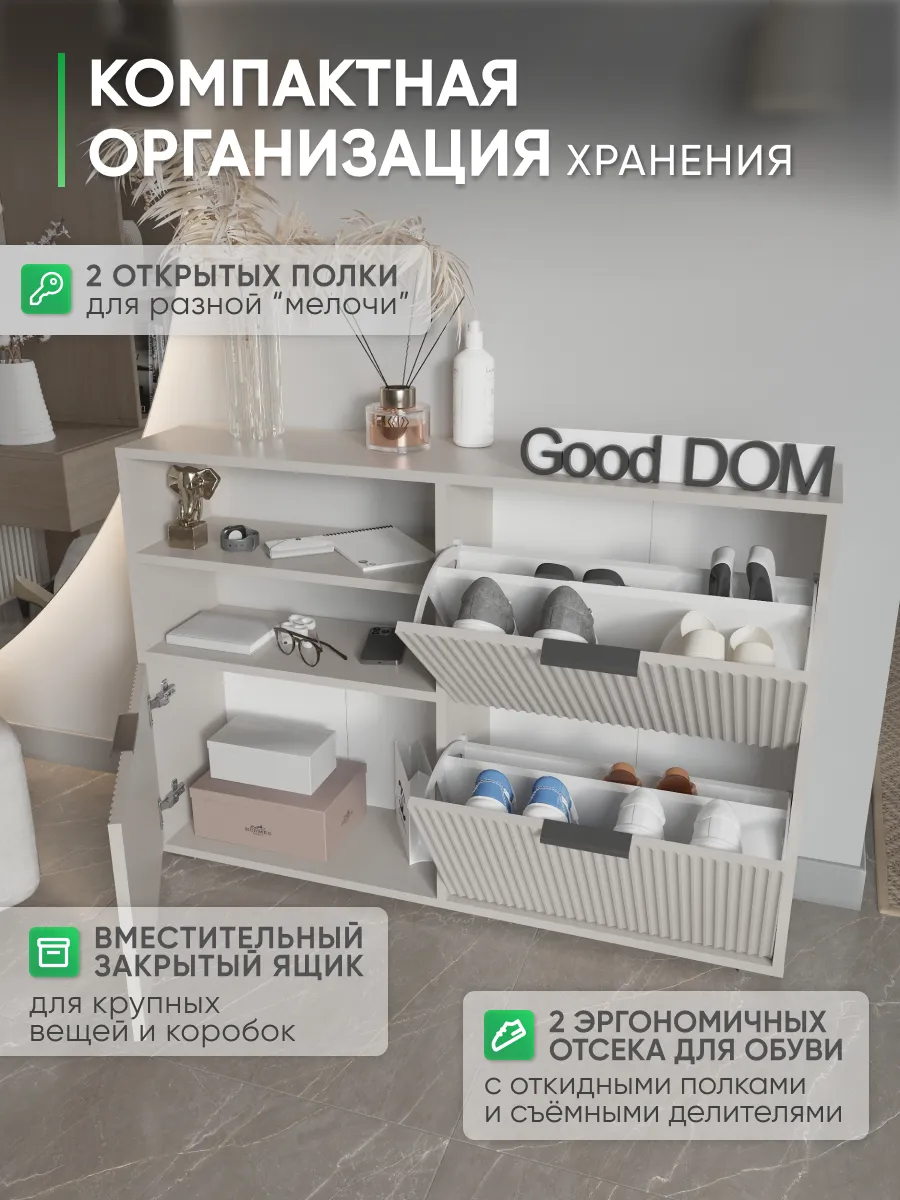 Вместительный и компактный деревянный стеллаж для хранения обуви станет отличным решением для прихожей или коридора дома. Эта небольшая обувная этажерка с закрытым фасадом и откидной дверцей позволяет аккуратно разместить пары различной высоты — от низких моделей до сапог. Благодаря дизайнерскому стилю в бежевом цвете с пленочным покрытием и лаком изделие органично впишется в интерьер в стиле лофт или soft touch. Настенный вариант поможет сэкономить пространство, а глубокий задний ящик обеспечит дополнительное место для мелочи и аксессуаров. Такой гардеробный предмет мебели легко поддерживать в чистоте, а его практичная конструкция с полками и подставками обеспечивает удобное хранение обуви, позволяя быстро ориентироваться в гардеробе. Этот стильный и компактный стеллаж станет хорошим выбором для любого дома, предлагая удобство и порядок, которые особенно ценятся в небольших прихожих и на балконе.
