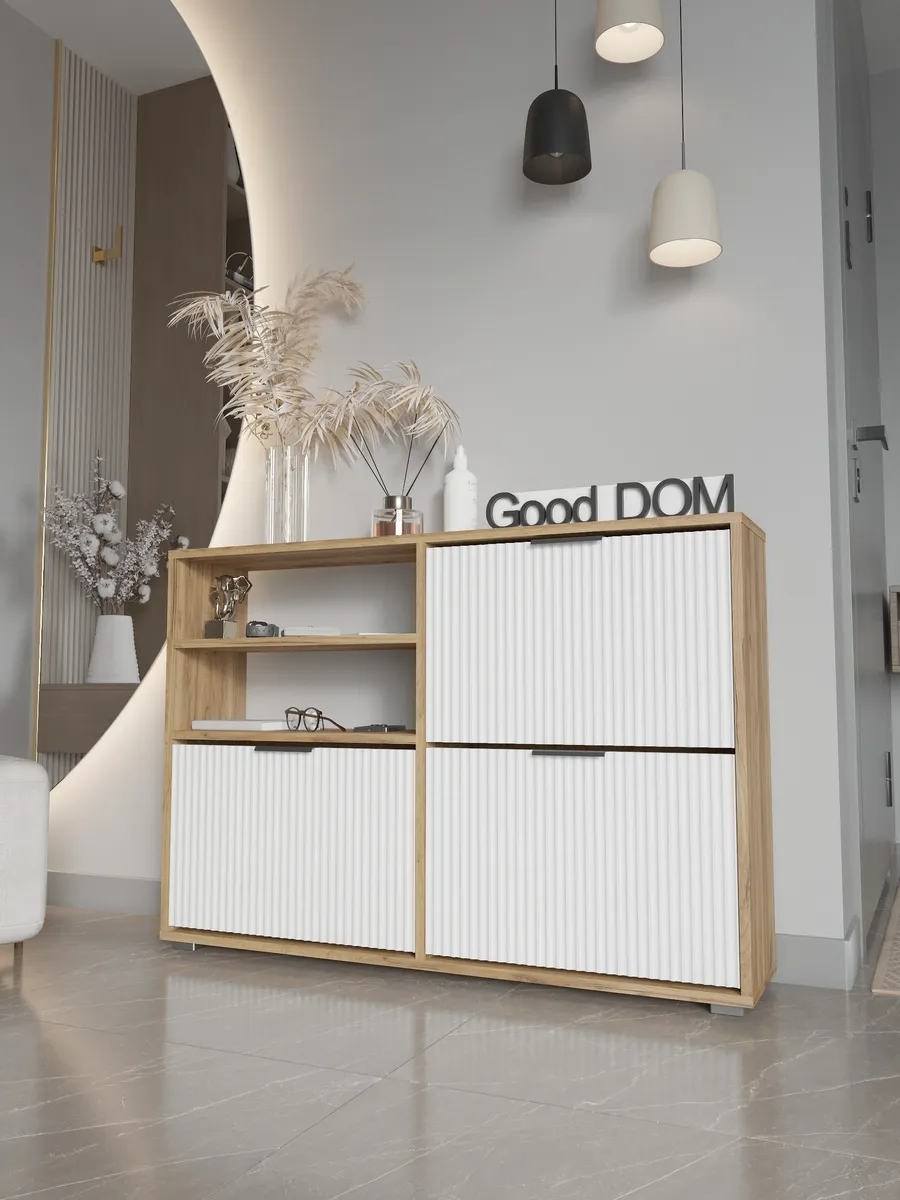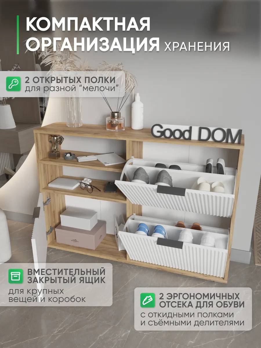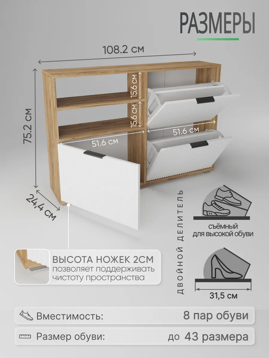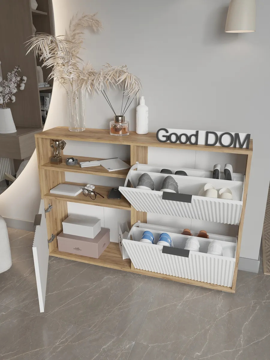 Обувница - необходимый предмет мебели для прихожей, коридора, балкона или гардеробной. Упорядочив хранение с помощью обувницы для прихожей закрытой, Вы можете несколько разгрузить пространство - даже в небольшой семье обуви получается не мало. Особенно, если учесть, что одна часть обуви активно используется, а вторая - находится на хранении в ожидании сезона. Наша этажерка для обуви создает приемлемые условия для хранения, что позволит продлить срок эксплуатации обуви. В пользу обувницы закрытой выступает и тот факт, что хранение обуви в “родных” коробках занимает чрезмерное количество места. Верхнюю поверхность стеллажа можно использовать как дополнительную полочку для ключей, сумок и прочей мелочи, которую всегда необходимо держать под рукой. Открыте полки позволят вместить еще больше нужных вещей, а вместительный ящик под ними позволяет удобно хранить коробки из под обуви и другое. Тумба под обувь с двумя откидными дверцами поможет сэкономить полезное пространство и не займет много места. У дверцы использованы удобные и эргономичные ручки, которыми приятно пользоваться. Еще одно преимущество нашей обувницы - Фрезерованные МДФ фасады в пленке soft touch. Софт тач фасады приятные на ощупь и не оставляют следов. Так же у обувницы есть задняя стенка, что позволяет защитить вашу стену от грязи. Обувница для прихожей деревянная из лдсп. Обувница в прихожую комфортного размера, но очень вместительная, что позволяет хранить обувь даже в самой маленькой прихожей. Размеры обувница для обуви закрытая: вместимость: 8 пар обуви. Разделитель в отделениях двойной! Если убрать съемный разделитель - то влезет и более высокая обувь, обувница для сапог. Обувница лофт или в современном стиле впишется в любой интерьер из-за своего универсального дизайна. Обувница в актуальном оттенке подходит к большинству интерьеров. Обувница деревянная в отличие от металлических и пластиковых смотрится основательно, презентабельно. Обувница так же имеет преимущество перед низкими аналогами. Наша для обуви обувница вмещает два отделения, а это значит что вместиться вся необходимая обувь. Обувница закрытая для прихожей подойдет как в прихожую, так и в гардеробную, и в кладовую. Обувная полка впишется в любой интерьер, станет прекрасной помощницей по соблюдению порядка не только в квартире, но и в загородном доме, на даче или в офисе. Обувница лдсп не прихотлива в уходе, достаточно протирать её от пыли и грязи. Обувница этажерка для обуви модель ОБВ-96. Выбирая продукцию отечественного производителя Good Дом, все в Дом Вы обеспечиваете себя гарантией на продукцию сроком в 1 год, Вы выбираете качество и комфорт.