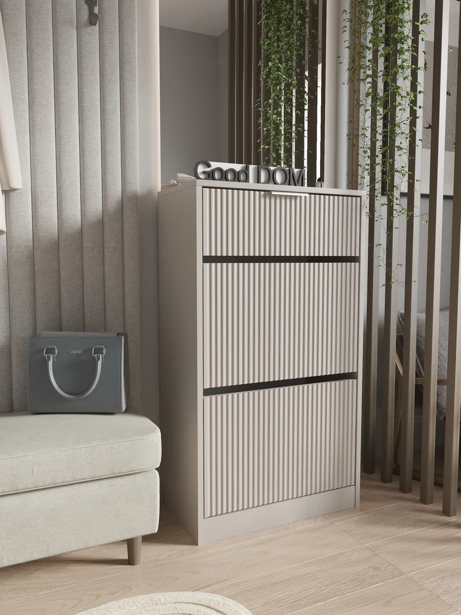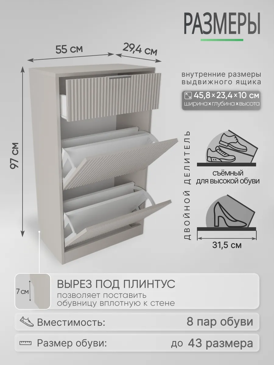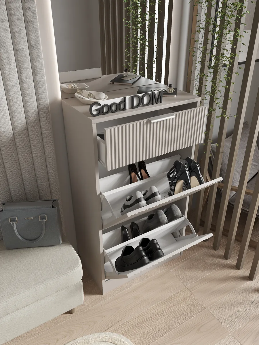 Обувница — это компактный и дизайнерский вариант мебели для хранения обуви дома. Такой обувной шкафчик отлично подходит для небольшой прихожей или коридора и помогает поддерживать уют и порядок в интерьере. Стеллаж с выдвижным ящиком и дверцей с вырезом для удобства открывания позволяет легко разместить необходимое количество обуви. Лаконичный закрытый фасад скрывает содержимое и защищает его от пыли, а высокий или узкий вариант обеспечивает экономию пространства даже в небольших комнатах. Благодаря продуманной конструкции обувного шкафа предусмотрен вырез под плинтус, что позволяет вплотную установить его к стене. Настенный способ крепления делает размещение мебели еще более рациональным, сохраняя свободную площадь на полу. Уютный бежевый цвет гармонирует с различными стилями интерьера, создавая приятную атмосферу и чувствуя себя как дома. Легкий лаковый блеск придает приятную деталь, а тонкий профиль подчеркивает современный вид конструкции.