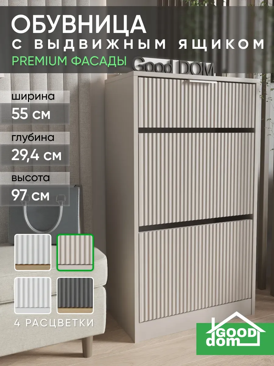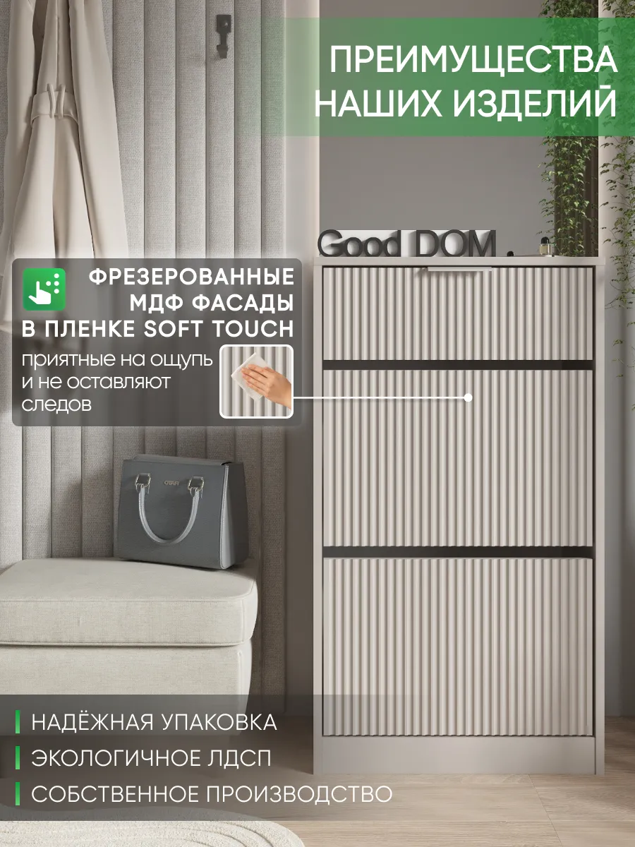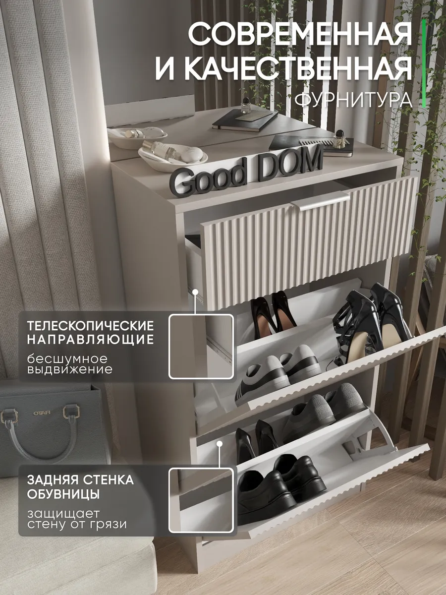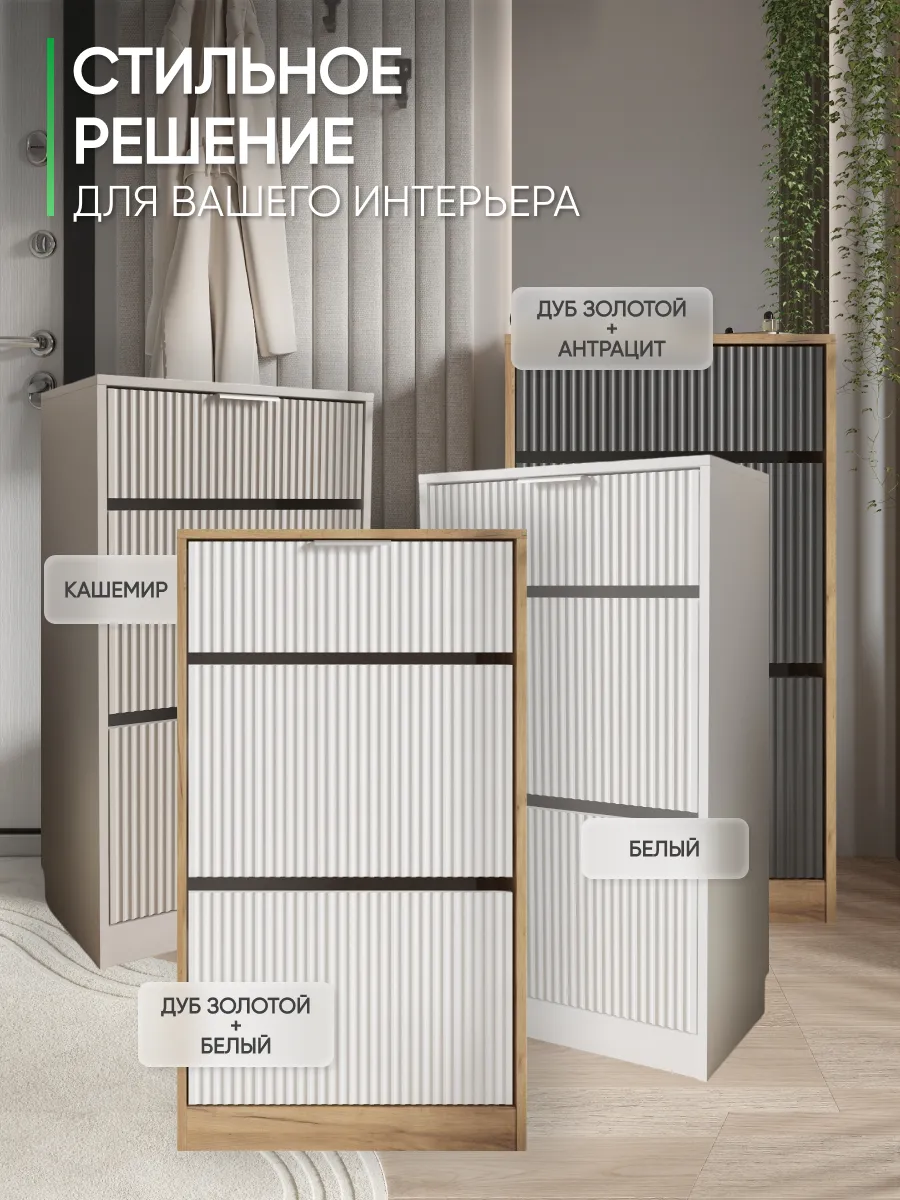 Обувница — это компактный и дизайнерский вариант мебели для хранения обуви дома. Такой обувной шкафчик отлично подходит для небольшой прихожей или коридора и помогает поддерживать уют и порядок в интерьере. Стеллаж с выдвижным ящиком и дверцей с вырезом для удобства открывания позволяет легко разместить необходимое количество обуви. Лаконичный закрытый фасад скрывает содержимое и защищает его от пыли, а высокий или узкий вариант обеспечивает экономию пространства даже в небольших комнатах. Благодаря продуманной конструкции обувного шкафа предусмотрен вырез под плинтус, что позволяет вплотную установить его к стене. Настенный способ крепления делает размещение мебели еще более рациональным, сохраняя свободную площадь на полу. Уютный бежевый цвет гармонирует с различными стилями интерьера, создавая приятную атмосферу и чувствуя себя как дома. Легкий лаковый блеск придает приятную деталь, а тонкий профиль подчеркивает современный вид конструкции.