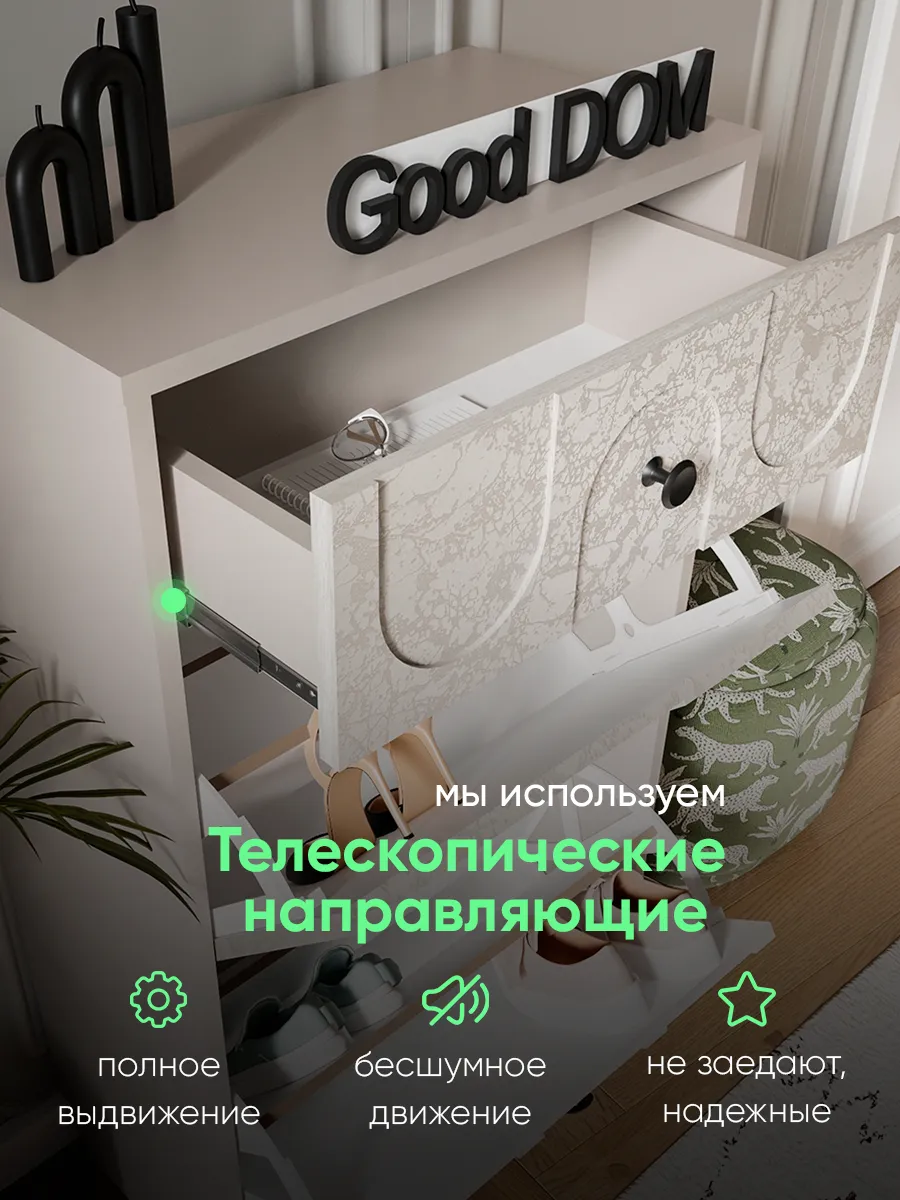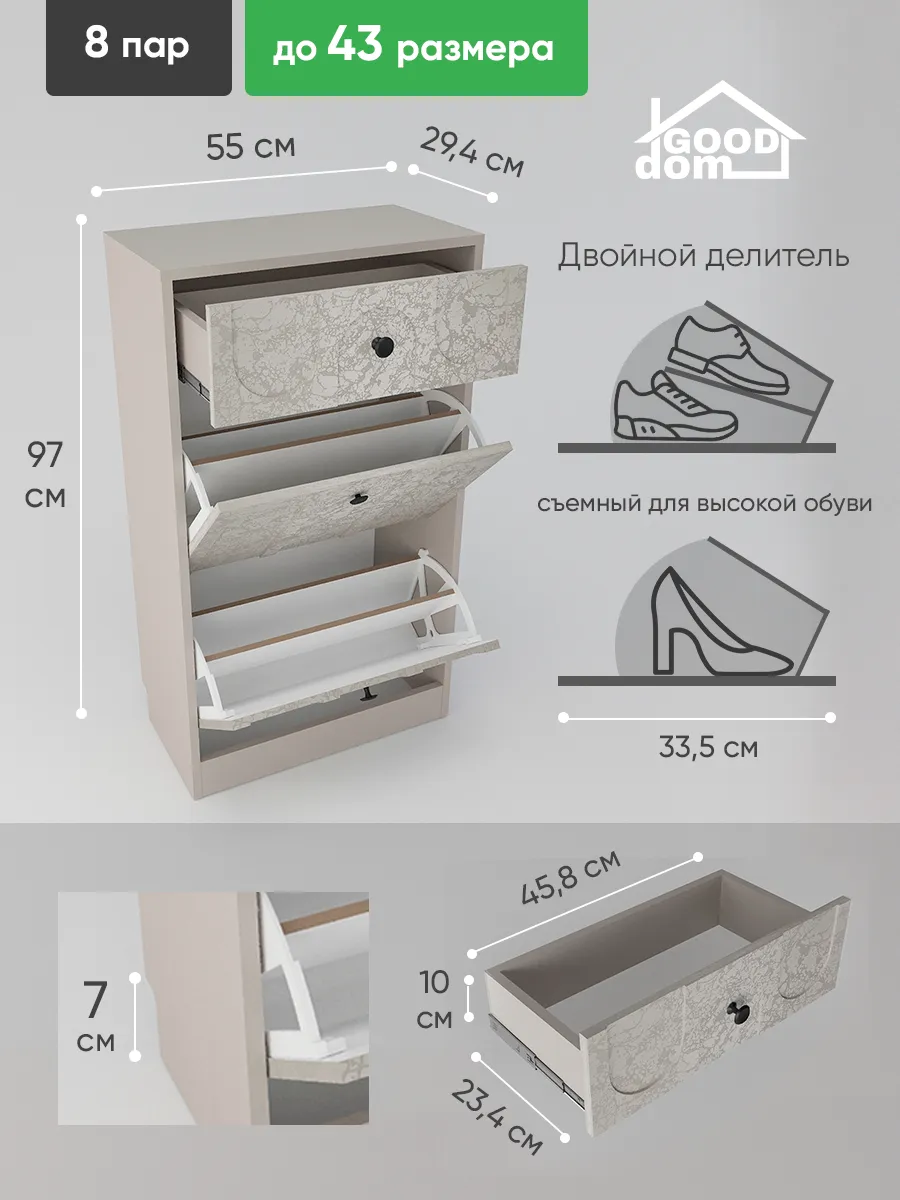 В изделии предусмотрена несколько полок для аккуратного размещения разной обуви. Благодаря высокому корпусу, шкаф позволяет хранить не только обувь, но и одежду в небольших ящиках и на настенных вешалках, если они используются совместно. Особенность конструкции – встроенный выдвижной ящик, который удобно использовать для хранения мелочей.