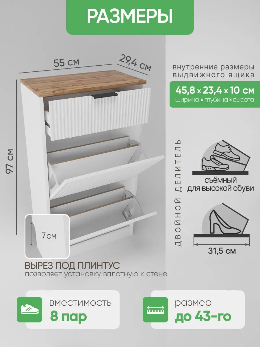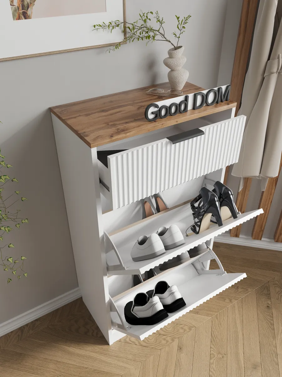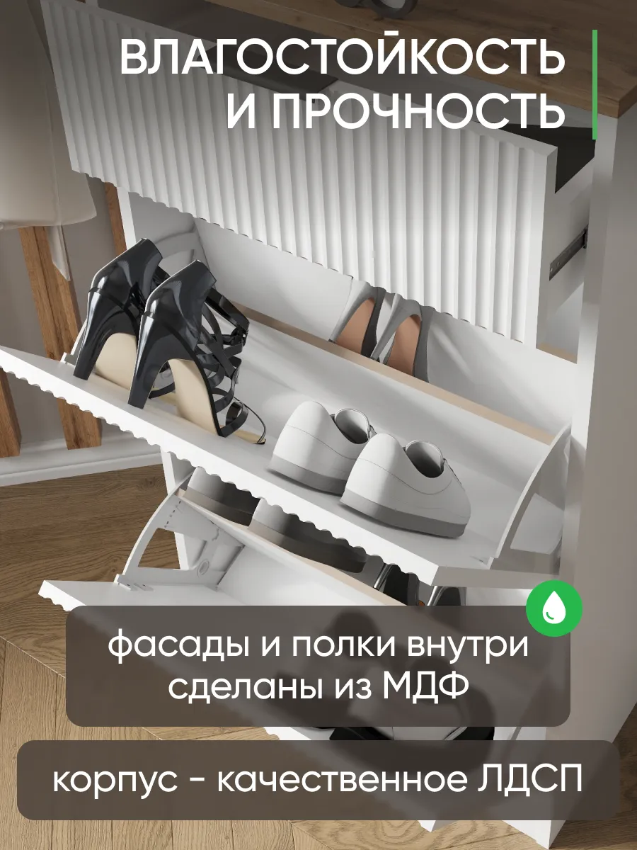 Закрытый обувной стеллаж оснащен амортизирующими дверцами и выдвижными ящиками, которые делают хранение обуви и одежды максимально эргономичным и аккуратным. Откидная дверь с плинтусом предотвращает попадание пыли и сохраняет порядок. Узкий и высокий корпус позволяет экономить пространство, а угловое размещение выгодно использует даже небольшие помещения.