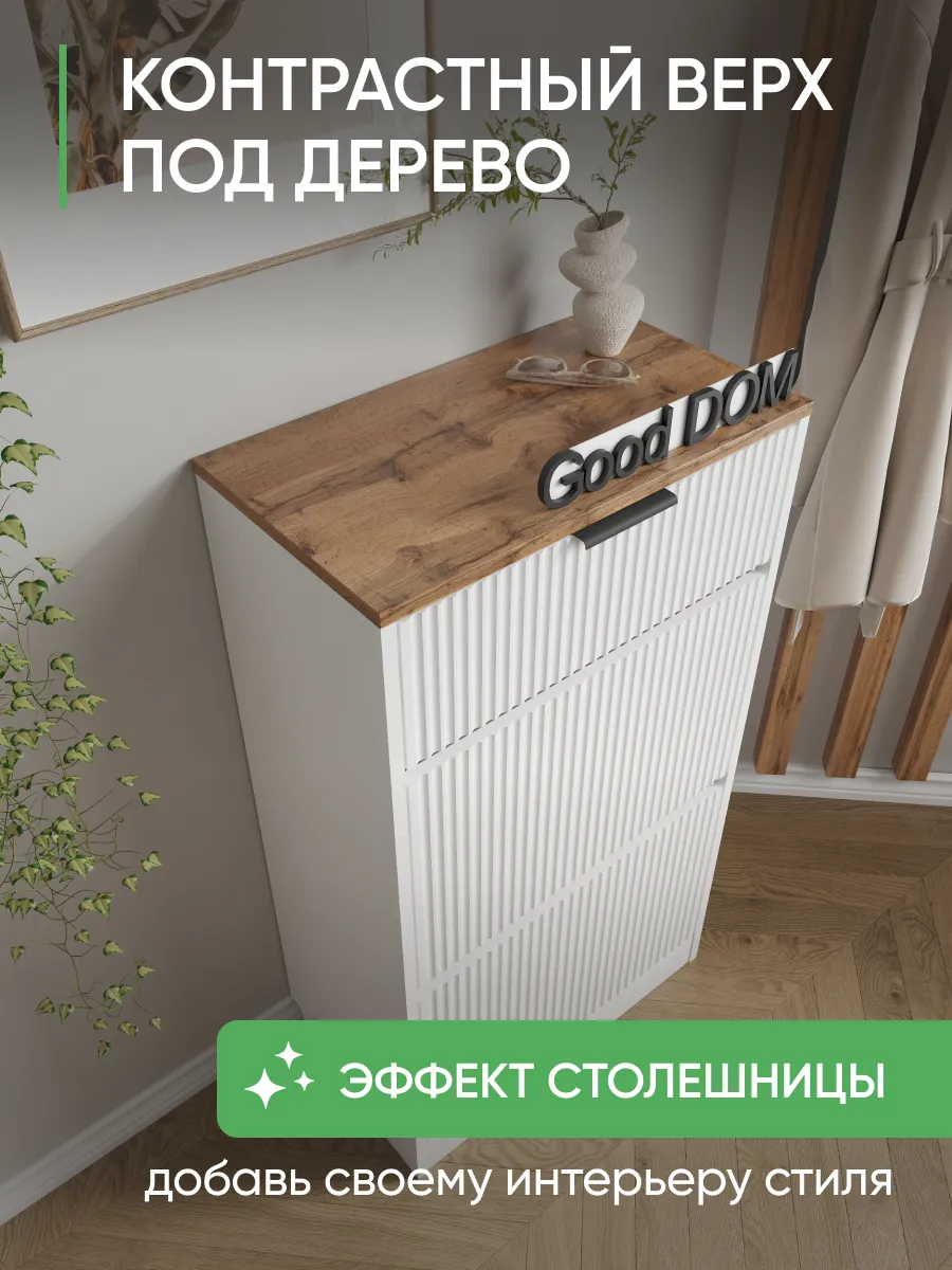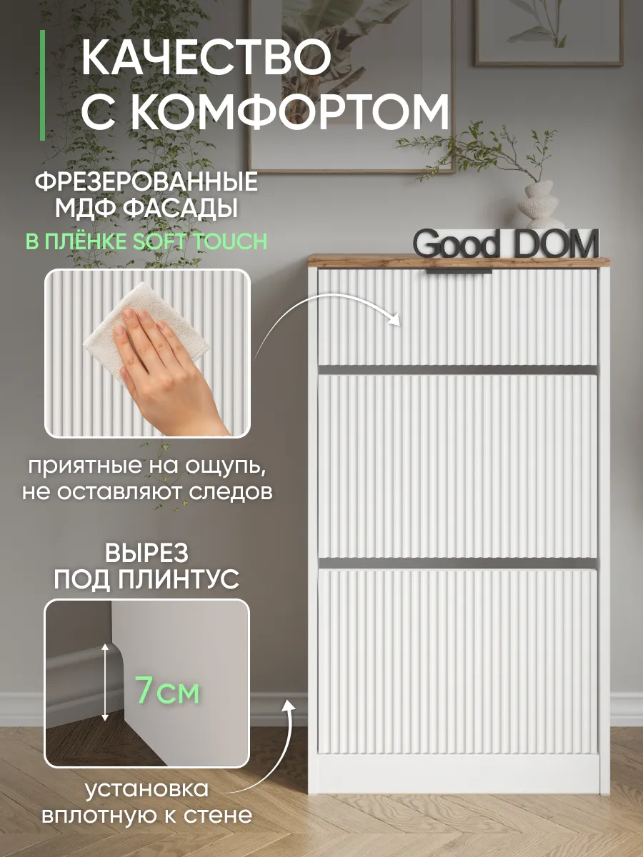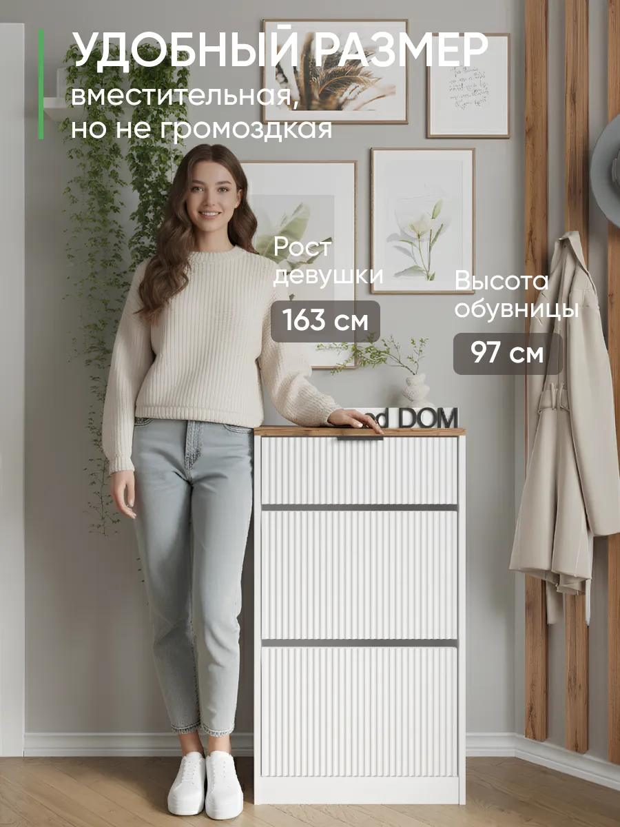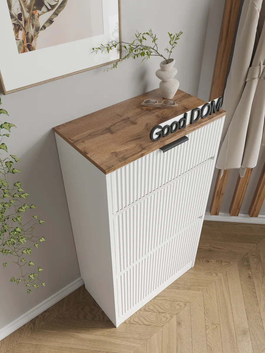Закрытый обувной стеллаж оснащен амортизирующими дверцами и выдвижными ящиками, которые делают хранение обуви и одежды максимально эргономичным и аккуратным. Откидная дверь с плинтусом предотвращает попадание пыли и сохраняет порядок. Узкий и высокий корпус позволяет экономить пространство, а угловое размещение выгодно использует даже небольшие помещения.
