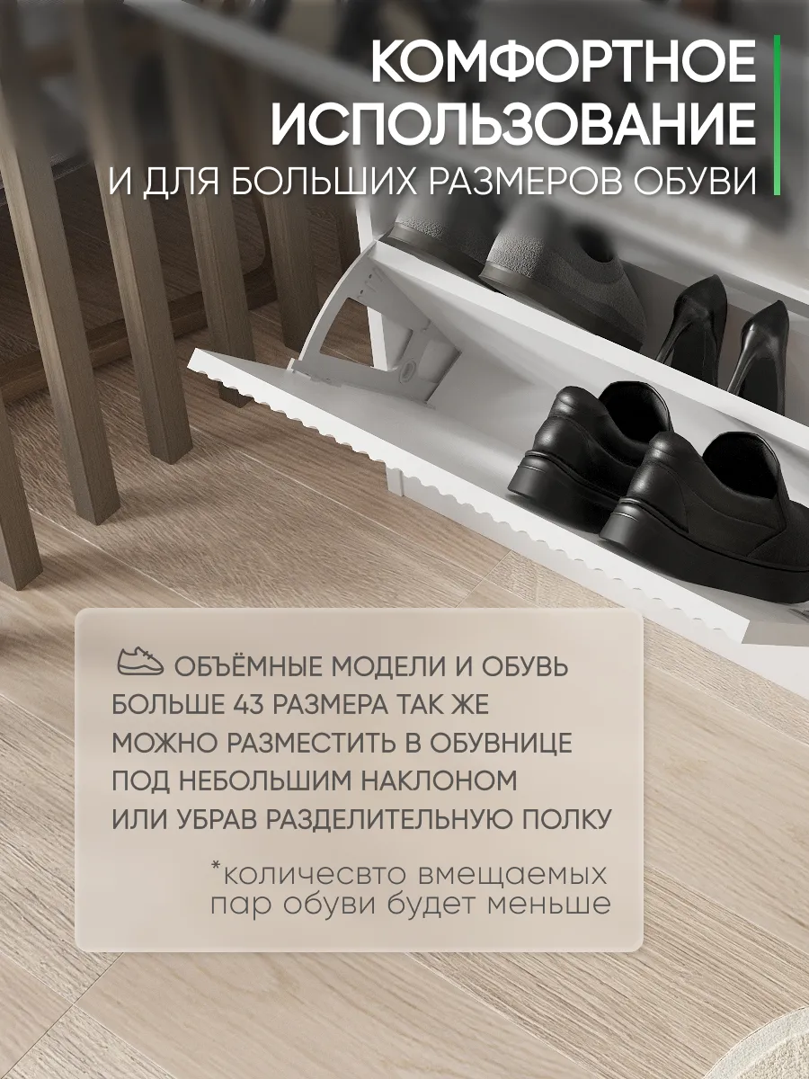 Настенный и угловой варианты исполнения делают хранение обуви удобным и функциональным, а встроенное зеркало и вешалка дополняют комплект, создавая единый дизайнерский образ. Мебель в белом цвете с деревянными деталями гармонично впишется в стильный интерьер, добавляя легкости и свежести. Высокий стеллаж с полками можно использовать не только для обуви, но и для одежды, мелких аксессуаров и прочей домашней мелочи.