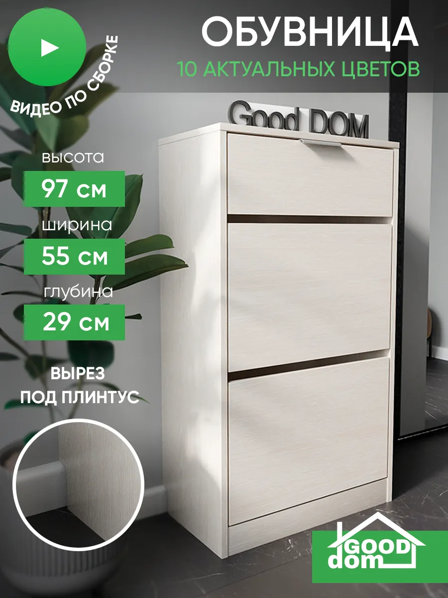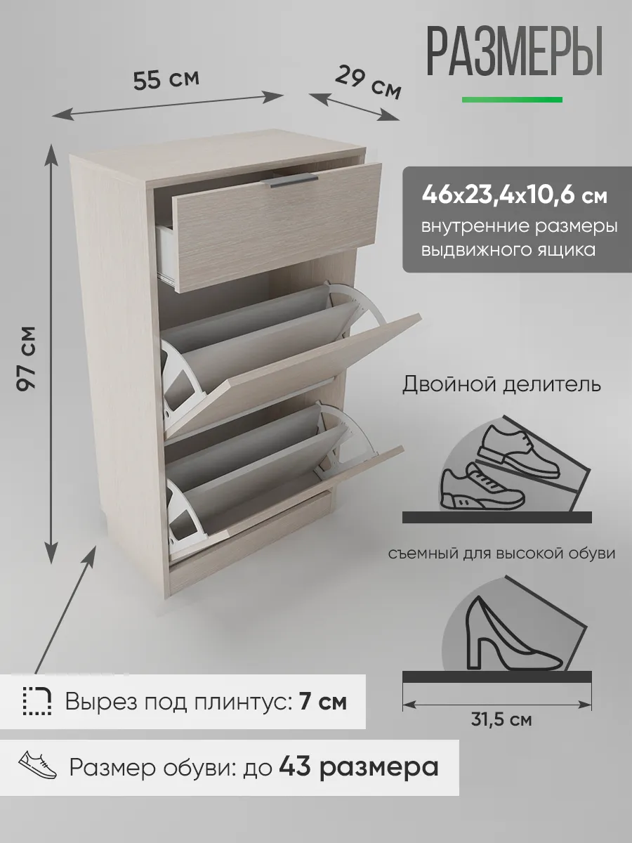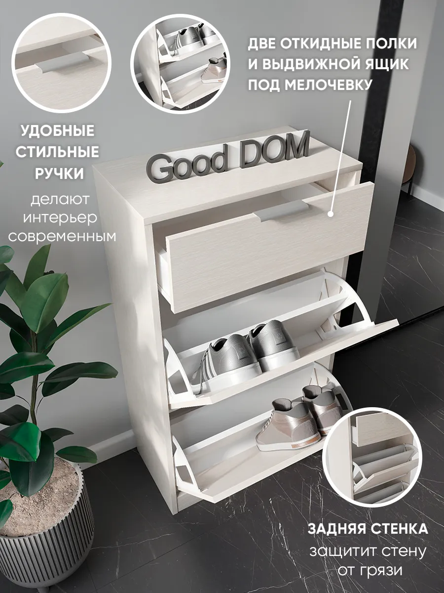 Обувница закрытая с выдвижными ящиками - удобная мебель в прихожую для функционального и удобного хранения обуви и вещей в коридоре. Тумба под обувь с выдвижным ящиком и откидными дверцами поможет сэкономить полезное пространство и не займет много места. Полка для обуви узкая влезет даже в маленький коридор, уместиться в небольшой гардеробной. Этажерка закрытая защитит обувь от попадания пыли, к тому же закрытая конструкция выглядит аккуратно и не перегружает пространство. Стеллаж из ЛДСП не ржавеет и при должном уходе прослужит долгие годы в отличие от металлической подставки и тем более пластиковой. Шкаф имеет верхний выдвижной ящик, в котором можно разместить зонты и другие аксессуары, использовать для хранения некоторой одежды и других принадлежностей и вещей. Ниже расположены две откидных полки для обуви, разделенных на две секции, что позволяет в такой компактной обувнице уместить целых 8 пар обуви! У дверцы использованы удобные и эргономичные ручки, которыми приятно пользоваться. Еще одно преимущество нашей обувницы - вырез под плинтус (идеальная установка вплотную к стене). Так же у обувницы есть задняя стенка, что позволяет защитить вашу стену от грязи. Галошницу можно дополнить вешалкой и зеркалом и получить удобный комплект в прихожую. Обувная полочка легко заменит громоздкий комод, стенку или шкаф. В нашем ассортименте представлена другая мебель для прихожей (и не только) – вы можете легко посмотреть весь ассортимент, щелкнув на значок логотипа. Мы постоянно работаем над качеством нашей продукции, поэтому улучшили упаковку - наша УСИЛЕННАЯ УПАКОВКА ЗАЩИТИТ Вашу Обувницу при доставке ОТ СЛОМАННЫХ УГЛОВ и СКОЛОВ! Выбирая продукцию отечественного производителя Good Дом, все в Дом Вы обеспечиваете себя гарантией на продукцию сроком в 1 год, Вы выбираете качество и комфорт.