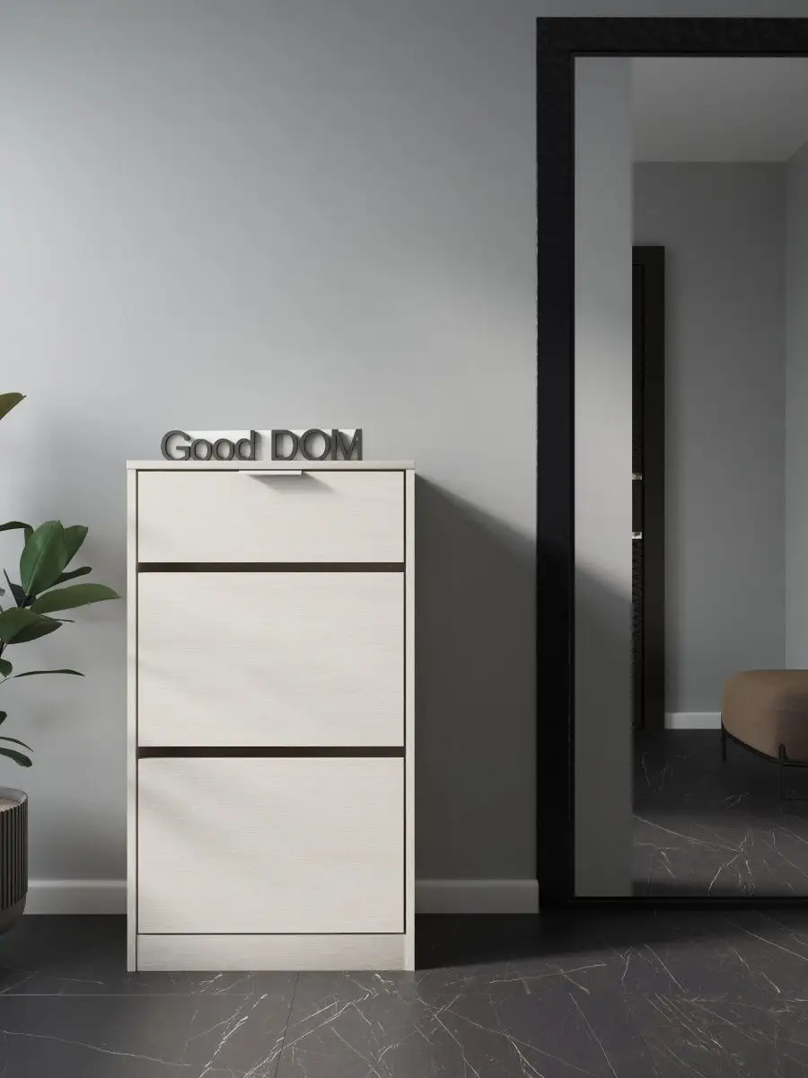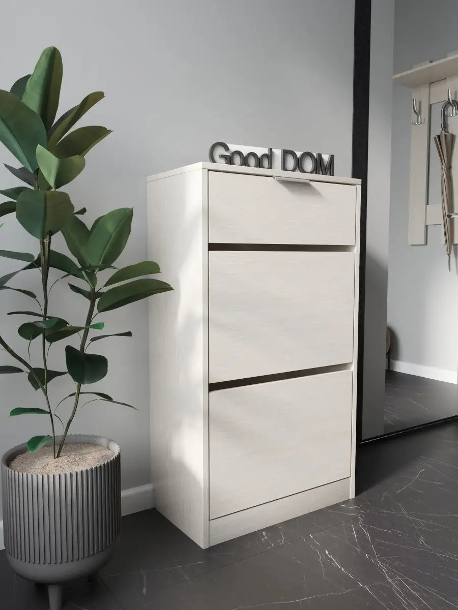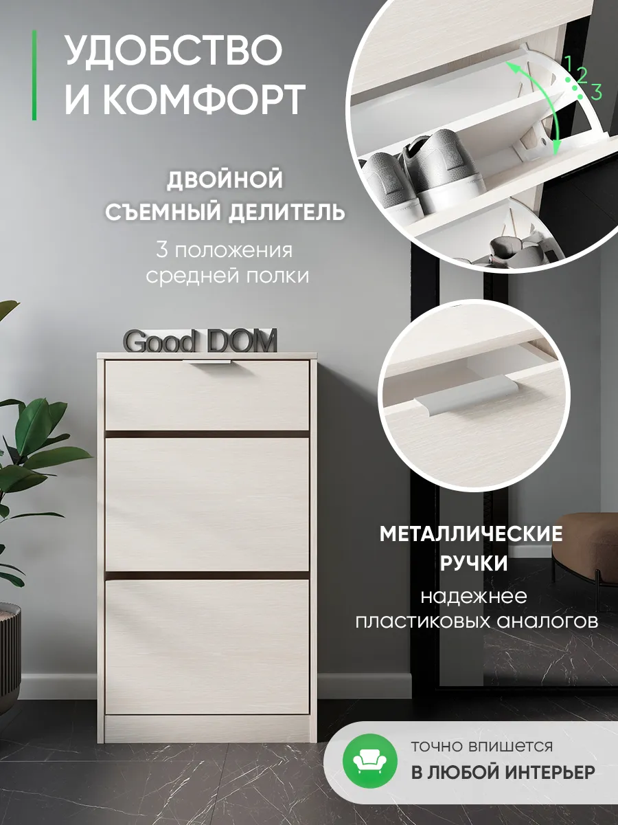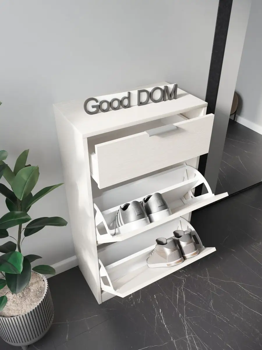 Обувница закрытая с выдвижными ящиками - удобная мебель в прихожую для функционального и удобного хранения обуви и вещей в коридоре. Тумба под обувь с выдвижным ящиком и откидными дверцами поможет сэкономить полезное пространство и не займет много места. Полка для обуви узкая влезет даже в маленький коридор, уместиться в небольшой гардеробной. Этажерка закрытая защитит обувь от попадания пыли, к тому же закрытая конструкция выглядит аккуратно и не перегружает пространство. Стеллаж из ЛДСП не ржавеет и при должном уходе прослужит долгие годы в отличие от металлической подставки и тем более пластиковой. Шкаф имеет верхний выдвижной ящик, в котором можно разместить зонты и другие аксессуары, использовать для хранения некоторой одежды и других принадлежностей и вещей. Ниже расположены две откидных полки для обуви, разделенных на две секции, что позволяет в такой компактной обувнице уместить целых 8 пар обуви! У дверцы использованы удобные и эргономичные ручки, которыми приятно пользоваться. Еще одно преимущество нашей обувницы - вырез под плинтус (идеальная установка вплотную к стене). Так же у обувницы есть задняя стенка, что позволяет защитить вашу стену от грязи. Галошницу можно дополнить вешалкой и зеркалом и получить удобный комплект в прихожую. Обувная полочка легко заменит громоздкий комод, стенку или шкаф. В нашем ассортименте представлена другая мебель для прихожей (и не только) – вы можете легко посмотреть весь ассортимент, щелкнув на значок логотипа. Мы постоянно работаем над качеством нашей продукции, поэтому улучшили упаковку - наша УСИЛЕННАЯ УПАКОВКА ЗАЩИТИТ Вашу Обувницу при доставке ОТ СЛОМАННЫХ УГЛОВ и СКОЛОВ! Выбирая продукцию отечественного производителя Good Дом, все в Дом Вы обеспечиваете себя гарантией на продукцию сроком в 1 год, Вы выбираете качество и комфорт.