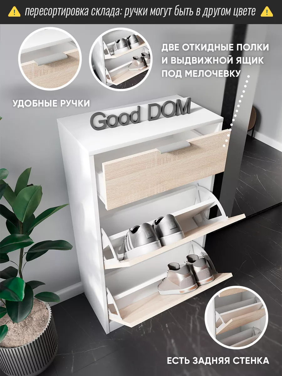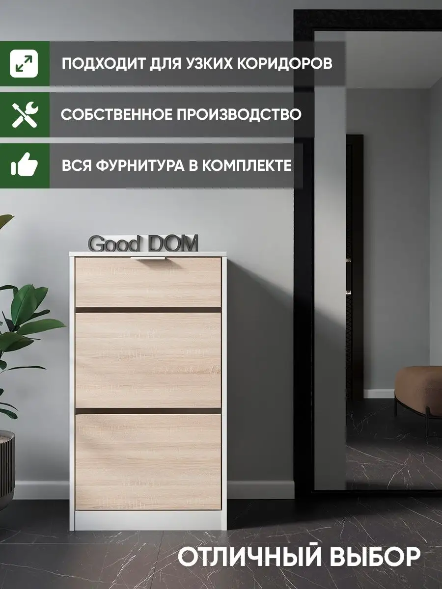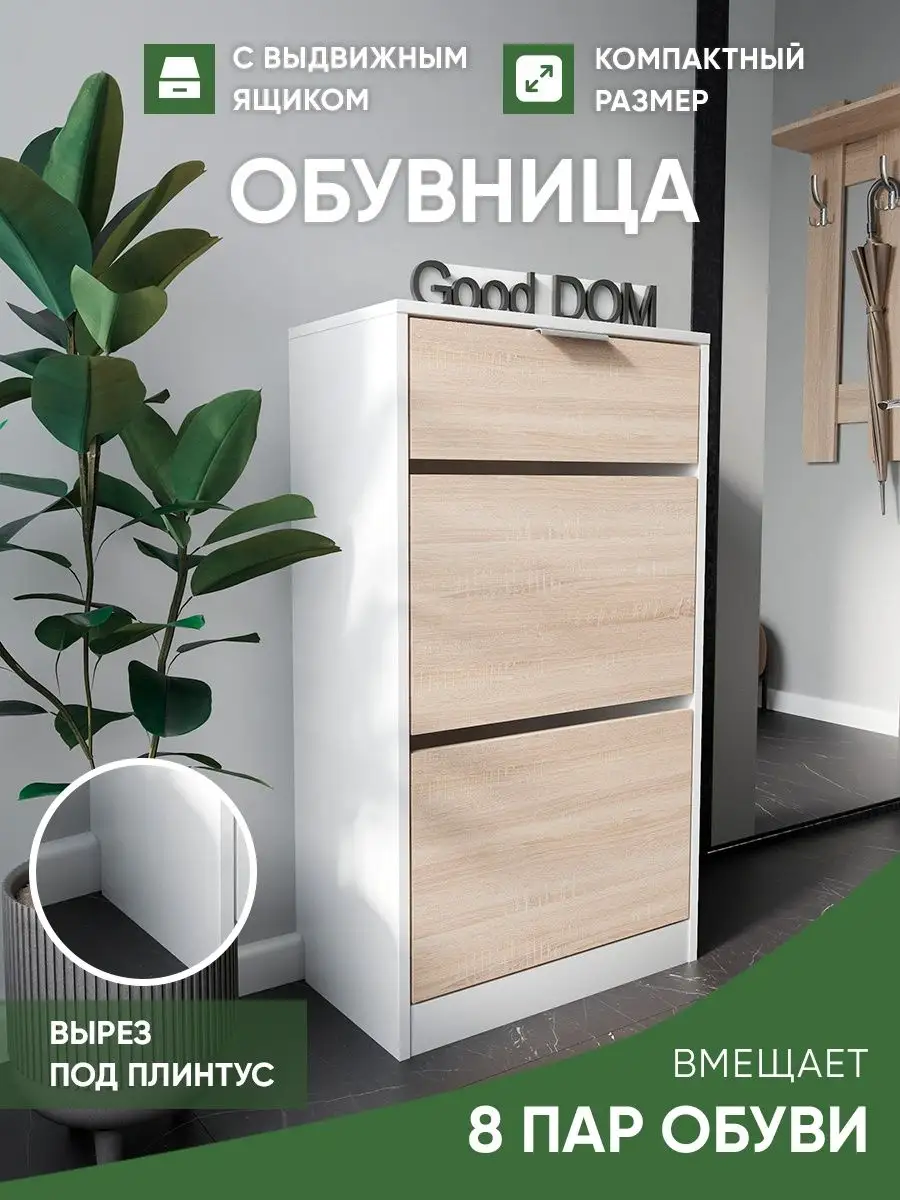 Обувница закрытая с выдвижными ящиками - удобная мебель в прихожую для функционального и удобного хранения обуви и вещей в коридоре. Тумба под обувь с выдвижным ящиком и откидными дверцами поможет сэкономить полезное пространство и не займет много места. Полка для обуви узкая влезет даже в маленький коридор, уместиться в небольшой гардеробной. Этажерка закрытая защитит обувь от попадания пыли, к тому же закрытая конструкция выглядит аккуратно и не перегружает пространство. Стеллаж из ЛДСП не ржавеет и при должном уходе прослужит долгие годы в отличие от металлической подставки и тем более пластиковой. Шкаф имеет верхний выдвижной ящик, в котором можно разместить аксессуары, использовать для хранения некоторой одежды и других принадлежностей и вещей. Ниже расположены две откидных полки для обуви, разделенных на две секции, что позволяет в такой компактной обувнице уместить целых 8 пар обуви! У дверцы использованы удобные и эргономичные ручки, которыми приятно пользоваться. Еще одно преимущество нашей обувницы - вырез под плинтус (идеальная установка вплотную к стене). Так же у обувницы есть задняя стенка, что позволяет защитить вашу стену от грязи. Галошницу можно дополнить вешалкой и зеркалом и получить удобный комплект в прихожую. Обувная полочка легко заменит громоздкий комод, стенку или шкаф. В нашем ассортименте представлена другая мебель для прихожей (и не только) – вы можете легко посмотреть весь ассортимент, щелкнув на значок логотипа. Мы постоянно работаем над качеством нашей продукции, поэтому улучшили упаковку - наша УСИЛЕННАЯ УПАКОВКА ЗАЩИТИТ Вашу Обувницу при доставке ОТ СЛОМАННЫХ УГЛОВ и СКОЛОВ! Выбирая продукцию отечественного производителя Good Дом, все в Дом Вы обеспечиваете себя гарантией на продукцию сроком в 1 год, Вы выбираете качество и комфорт.