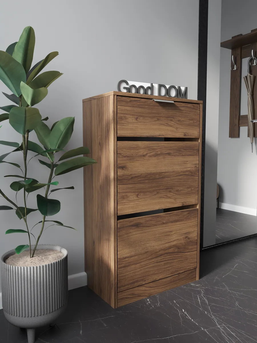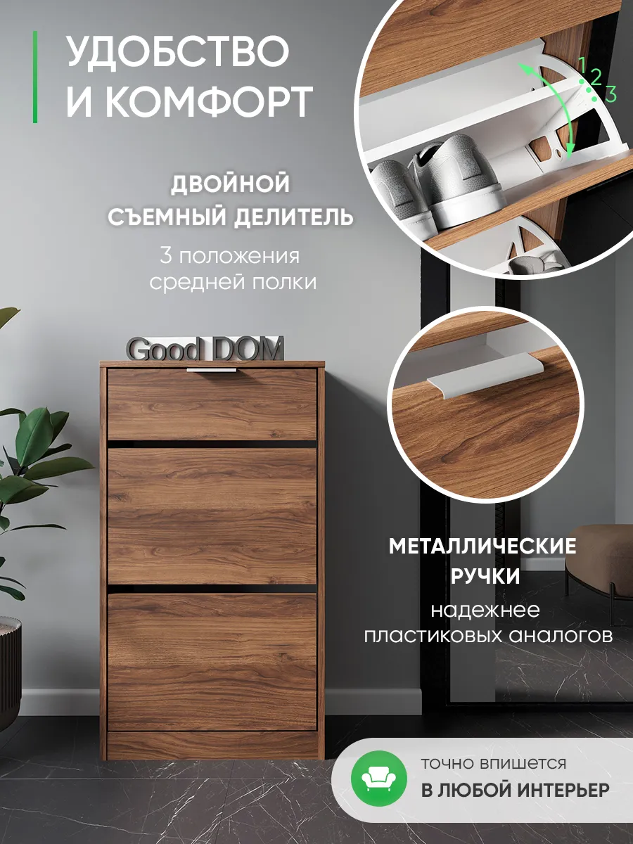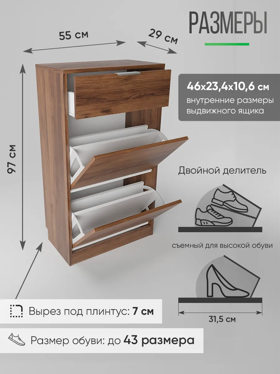 Обувница закрытая с выдвижными ящиками - удобная мебель в прихожую для функционального и удобного хранения обуви и вещей в коридоре. Тумба под обувь с выдвижным ящиком и откидными дверцами поможет сэкономить полезное пространство и не займет много места. Полка для обуви узкая влезет даже в маленький коридор, уместиться в небольшой гардеробной. Этажерка закрытая защитит обувь от попадания пыли, к тому же закрытая конструкция выглядит аккуратно и не перегружает пространство. Стеллаж из ЛДСП не ржавеет и при должном уходе прослужит долгие годы в отличие от металлической подставки и тем более пластиковой. Шкаф имеет верхний выдвижной ящик, в котором можно разместить зонты и другие аксессуары, использовать для хранения некоторой одежды и других принадлежностей и вещей. Ниже расположены две откидных полки для обуви, разделенных на две секции, что позволяет в такой компактной обувнице уместить целых 8 пар обуви! У дверцы использованы удобные и эргономичные ручки, которыми приятно пользоваться. Еще одно преимущество нашей обувницы - вырез под плинтус (идеальная установка вплотную к стене). Так же у обувницы есть задняя стенка, что позволяет защитить вашу стену от грязи. Галошницу можно дополнить вешалкой и зеркалом и получить удобный комплект в прихожую. Обувная полочка легко заменит громоздкий комод, стенку или шкаф. В нашем ассортименте представлена другая мебель для прихожей (и не только) – вы можете легко посмотреть весь ассортимент, щелкнув на значок логотипа. Мы постоянно работаем над качеством нашей продукции, поэтому улучшили упаковку - наша УСИЛЕННАЯ УПАКОВКА ЗАЩИТИТ Вашу Обувницу при доставке ОТ СЛОМАННЫХ УГЛОВ и СКОЛОВ! Выбирая продукцию отечественного производителя Good Дом, все в Дом Вы обеспечиваете себя гарантией на продукцию сроком в 1 год, Вы выбираете качество и комфорт.
