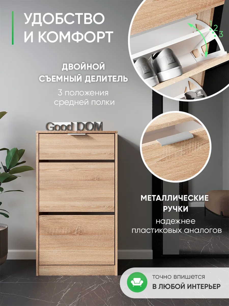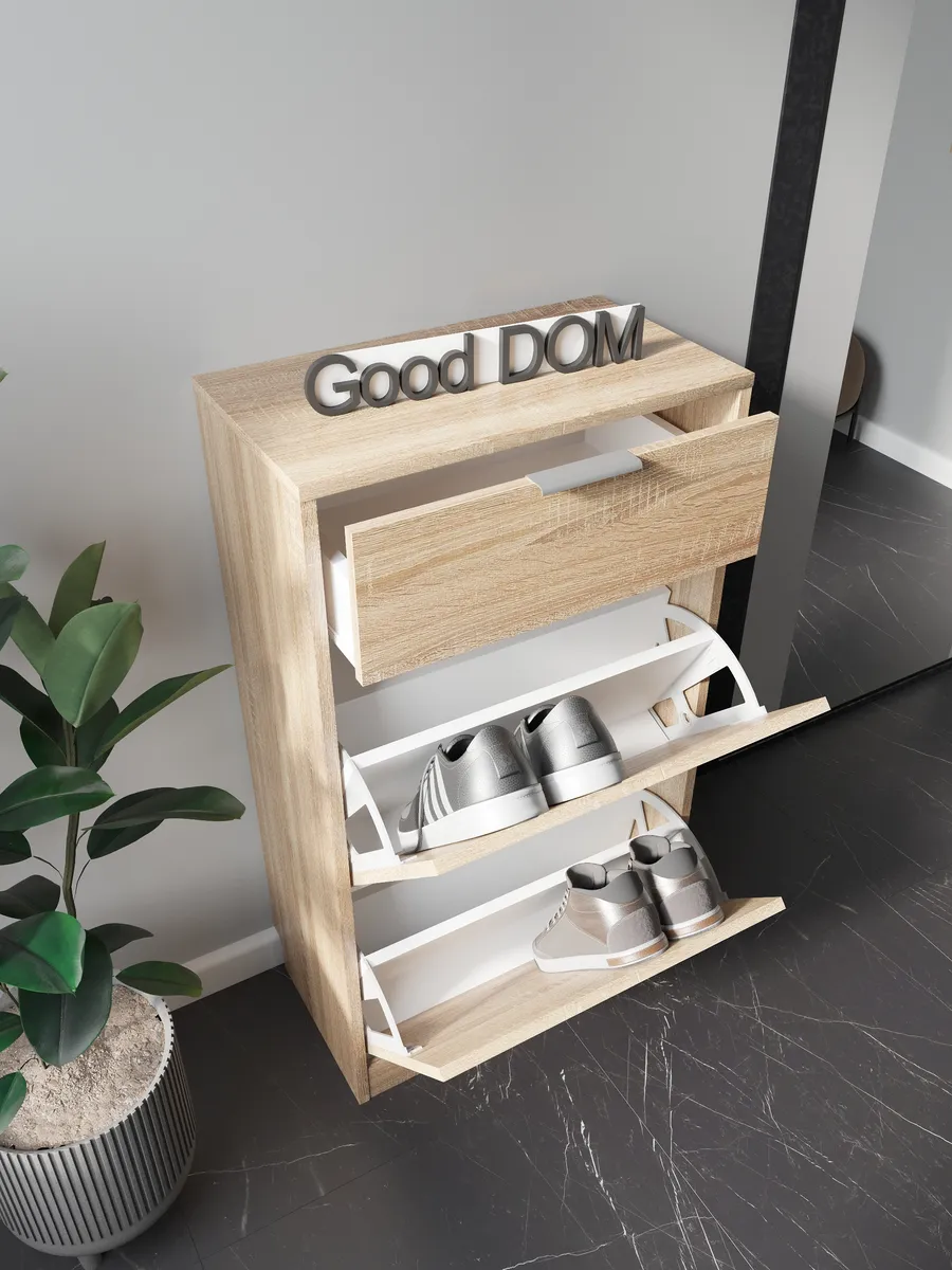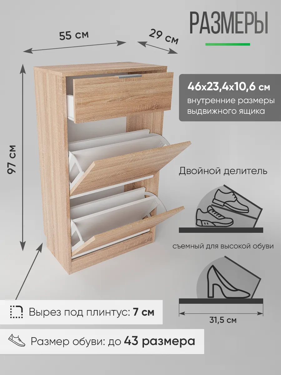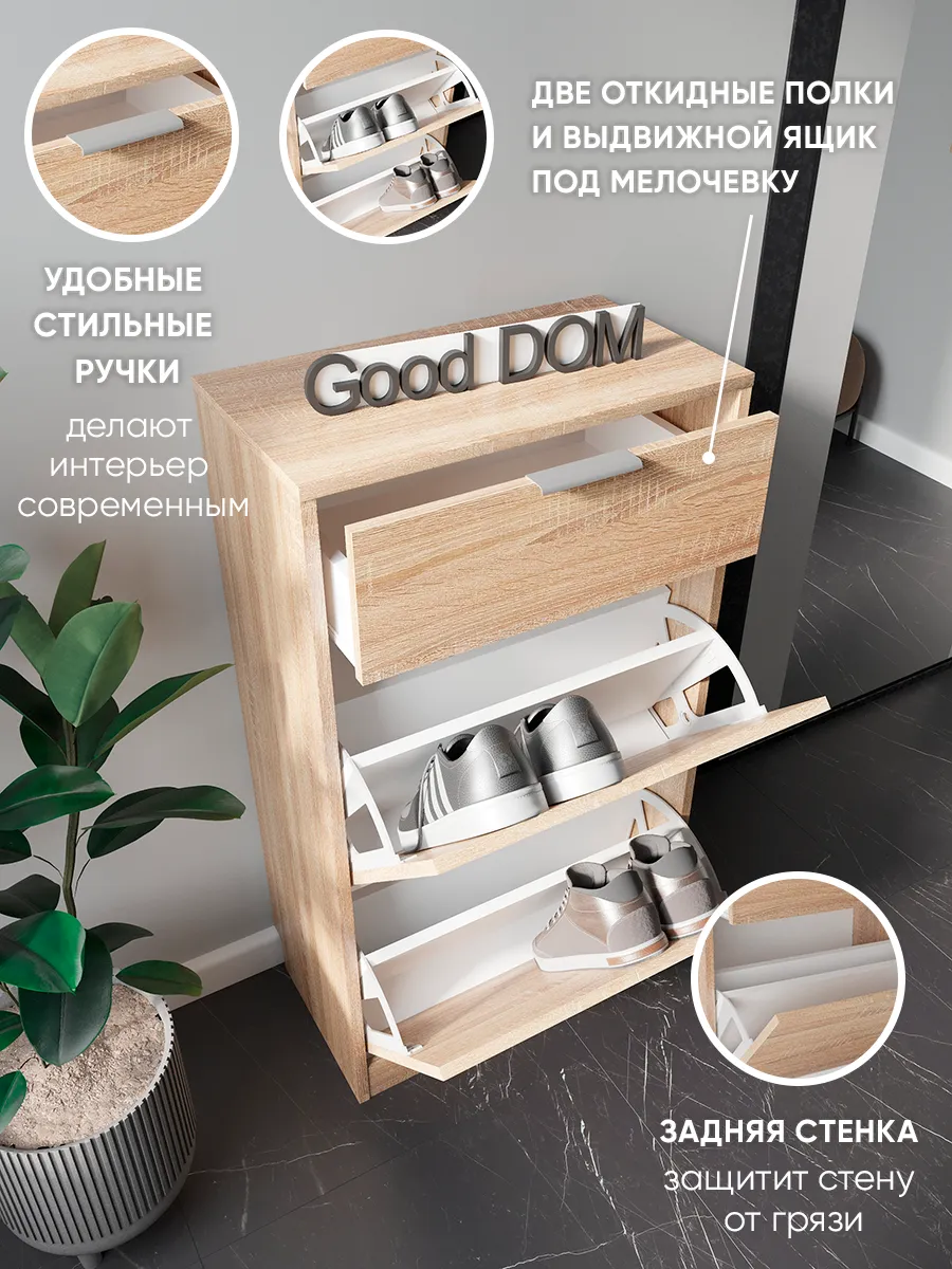 Обувница закрытая с выдвижными ящиками - удобная мебель в прихожую для функционального и удобного хранения обуви и вещей в коридоре. Тумба под обувь с выдвижным ящиком и откидными дверцами поможет сэкономить полезное пространство и не займет много места. Полка для обуви узкая влезет даже в маленький коридор, уместиться в небольшой гардеробной. Этажерка закрытая защитит обувь от попадания пыли, к тому же закрытая конструкция выглядит аккуратно и не перегружает пространство. Стеллаж из ЛДСП не ржавеет и при должном уходе прослужит долгие годы в отличие от металлической подставки и тем более пластиковой. Шкаф имеет верхний выдвижной ящик, в котором можно разместить зонты или контейнер с мелочью использовать для хранения некоторой одежды и других принадлежностей и вещей. Ниже расположены две откидных полки для обуви, разделенных на две секции, что позволяет в такой компактной обувнице уместить целых 8 пар обуви! У дверцы использованы удобные и эргономичные ручки, которыми приятно пользоваться. Еще одно преимущество нашей обувницы - вырез под плинтус (идеальная установка вплотную к стене). Так же у обувницы есть задняя стенка, что позволяет защитить вашу стену от грязи. Галошницу можно дополнить вешалкой и зеркалом и получить удобный комплект в прихожую. Обувная полочка легко заменит громоздкий комод, стенку или шкаф. В нашем ассортименте представлена другая мебель для прихожей (и не только) – вы можете легко посмотреть весь ассортимент, щелкнув на значок логотипа. Мы постоянно работаем над качеством нашей продукции, поэтому улучшили упаковку - наша УСИЛЕННАЯ УПАКОВКА ЗАЩИТИТ Вашу Обувницу при доставке ОТ СЛОМАННЫХ УГЛОВ и СКОЛОВ! Выбирая продукцию отечественного производителя Good Дом, все в Дом Вы обеспечиваете себя гарантией на продукцию сроком в 1 год, Вы выбираете качество и комфорт.