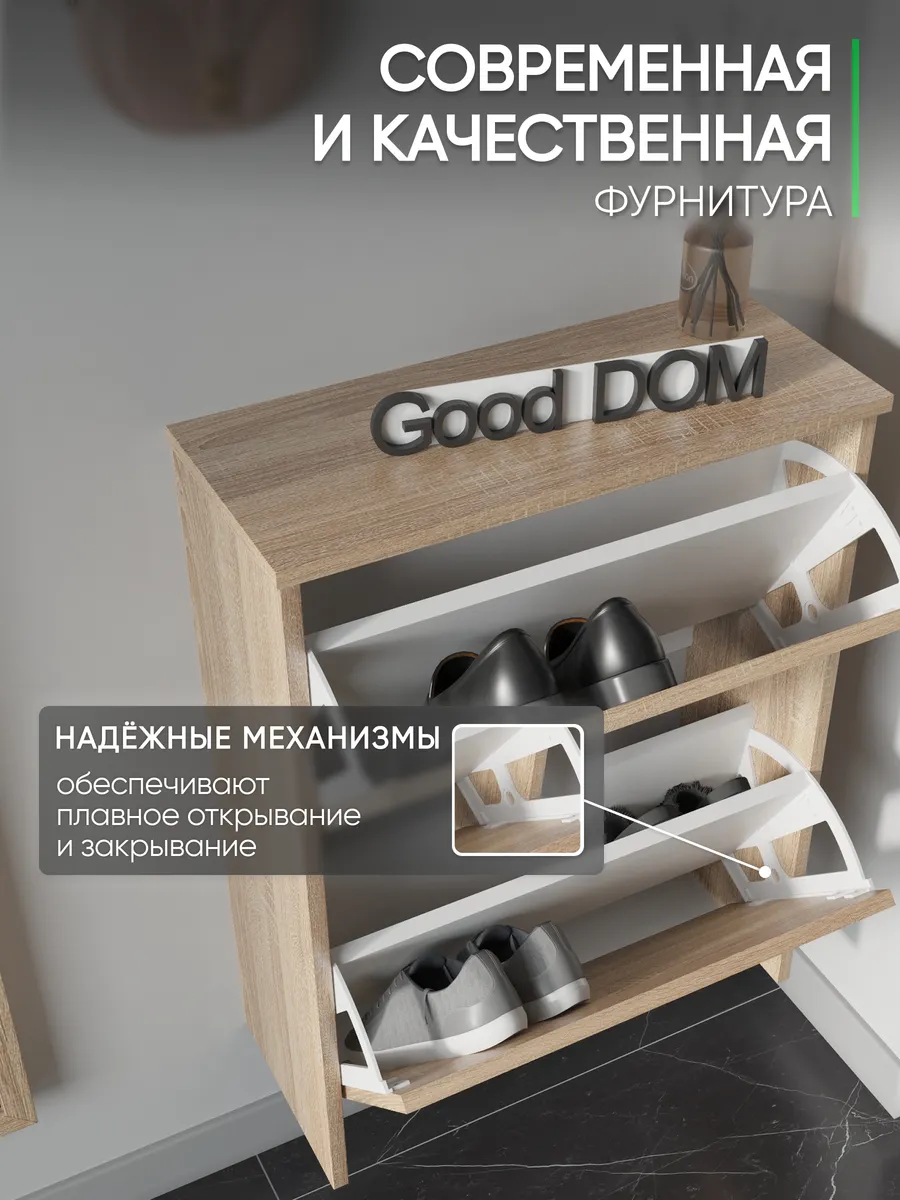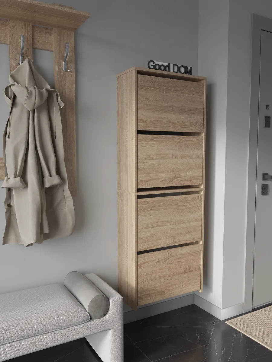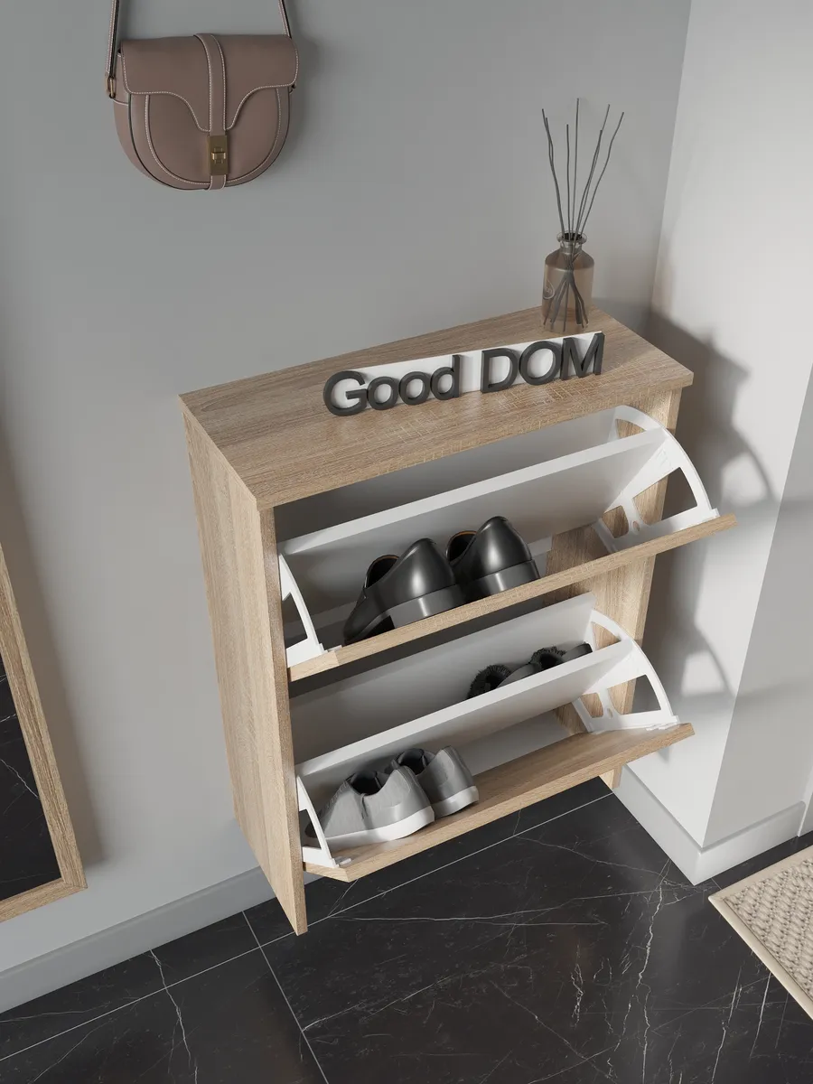 Обувница закрытая - удобная мебель в прихожую для функционального и удобного хранения обуви и вещей в коридоре. Тумба под обувь с откидными дверцами поможет сэкономить полезное пространство и не займет много места. Полка для обуви узкая влезет даже в маленький коридор, уместиться в небольшой гардеробной. Этажерка закрытая защитит обувь от попадания пыли, к тому же закрытая конструкция выглядит аккуратно и не перегружает пространство. Стеллаж из ЛДСП не ржавеет и при должном уходе прослужит долгие годы в отличие от металлической подставки и тем более пластиковой. Шкаф имеет поверхность сверху - верхнюю полку, на которой можно разместить зонты или ключи, прочие принадлежности и вещи, используемые в прихожей. Также у навесной обувницы есть две откидные полки для обуви, разделенных на две секции, что позволяет в такой компактной обувнице уместить целых 8 пар обуви! Подвесная обувница выглядит стильно и компактно. Галошницу можно дополнить вешалкой и зеркалом и получить удобный комплект в прихожую. Обувная полочка легко заменит громоздкий комод, стенку или шкаф. В нашем ассортименте представлена другая мебель для прихожей (и не только) – вы можете легко посмотреть весь ассортимент, щелкнув на значок логотипа. Мы постоянно работаем над качеством нашей продукции, поэтому улучшили упаковку - наша усиленная упаковка защитит Вашу Обувницу при доставке от сломаных углов и сколов! Выбирая продукцию отечественного производителя Good Дом, все в Дом Вы обеспечиваете себя гарантией на продукцию сроком в 1 год, Вы выбираете качество и комфорт.