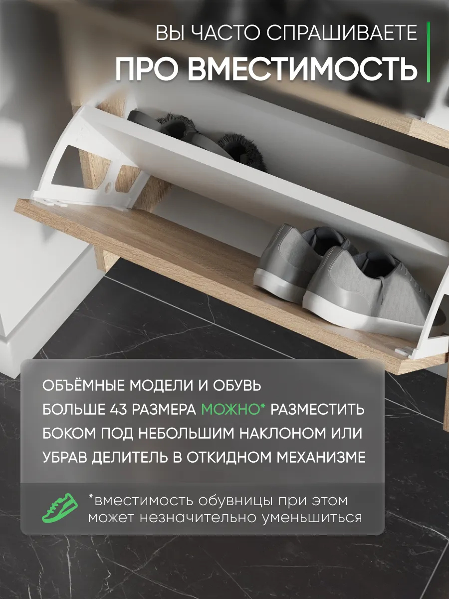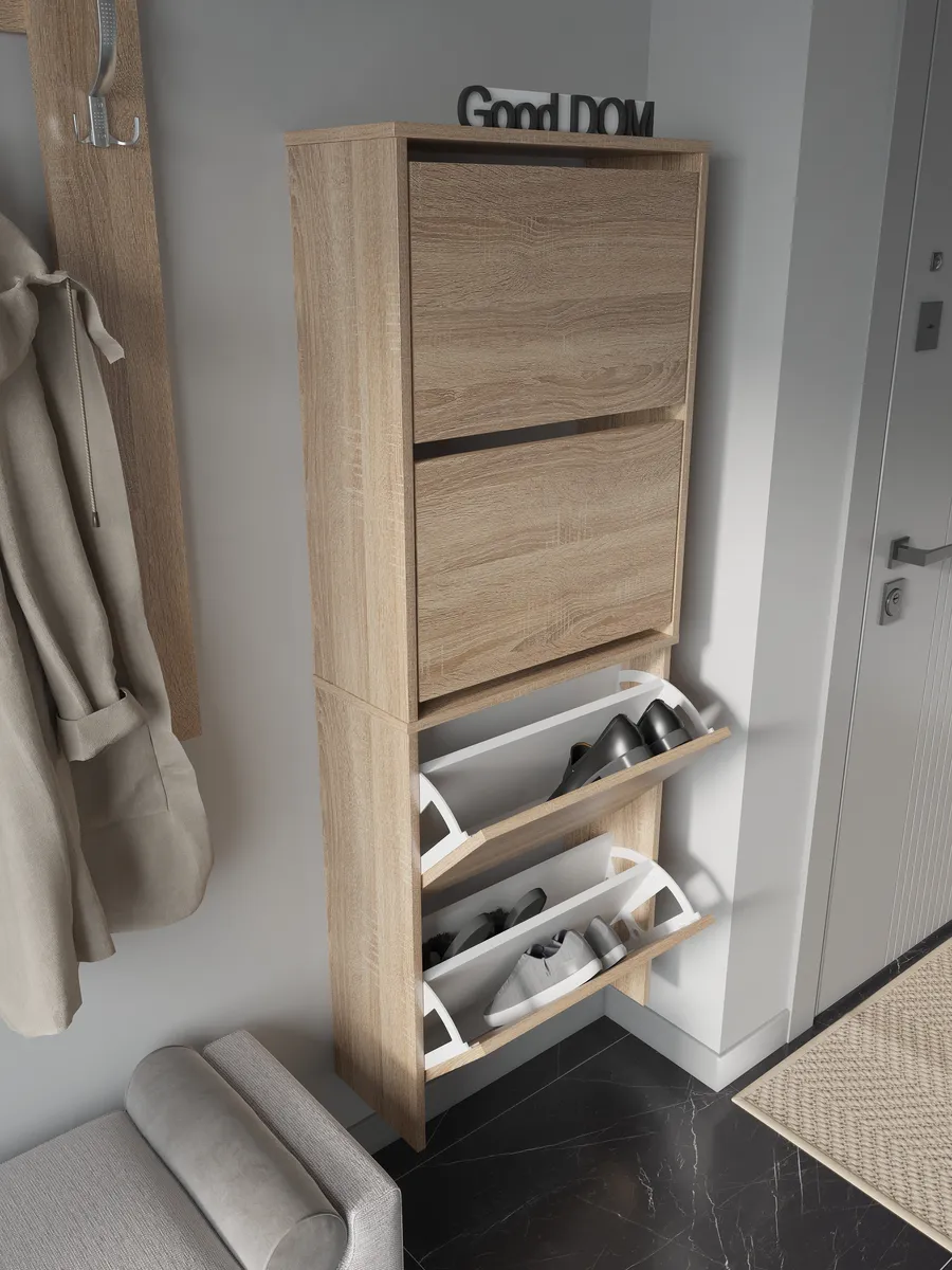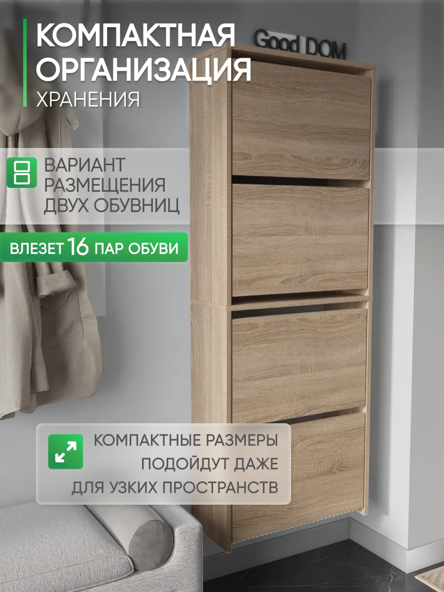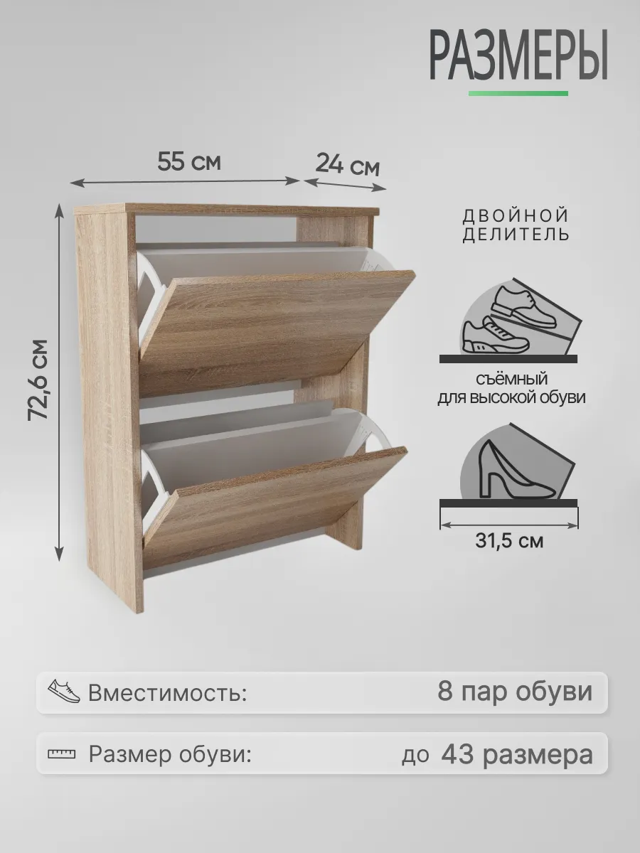 Обувница закрытая - удобная мебель в прихожую для функционального и удобного хранения обуви и вещей в коридоре. Тумба под обувь с откидными дверцами поможет сэкономить полезное пространство и не займет много места. Полка для обуви узкая влезет даже в маленький коридор, уместиться в небольшой гардеробной. Этажерка закрытая защитит обувь от попадания пыли, к тому же закрытая конструкция выглядит аккуратно и не перегружает пространство. Стеллаж из ЛДСП не ржавеет и при должном уходе прослужит долгие годы в отличие от металлической подставки и тем более пластиковой. Шкаф имеет поверхность сверху - верхнюю полку, на которой можно разместить зонты или ключи, прочие принадлежности и вещи, используемые в прихожей. Также у навесной обувницы есть две откидные полки для обуви, разделенных на две секции, что позволяет в такой компактной обувнице уместить целых 8 пар обуви! Подвесная обувница выглядит стильно и компактно. Галошницу можно дополнить вешалкой и зеркалом и получить удобный комплект в прихожую. Обувная полочка легко заменит громоздкий комод, стенку или шкаф. В нашем ассортименте представлена другая мебель для прихожей (и не только) – вы можете легко посмотреть весь ассортимент, щелкнув на значок логотипа. Мы постоянно работаем над качеством нашей продукции, поэтому улучшили упаковку - наша усиленная упаковка защитит Вашу Обувницу при доставке от сломаных углов и сколов! Выбирая продукцию отечественного производителя Good Дом, все в Дом Вы обеспечиваете себя гарантией на продукцию сроком в 1 год, Вы выбираете качество и комфорт.