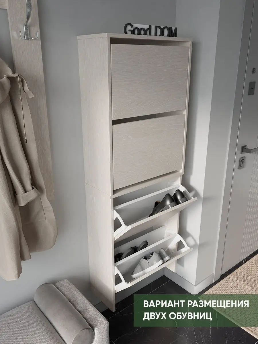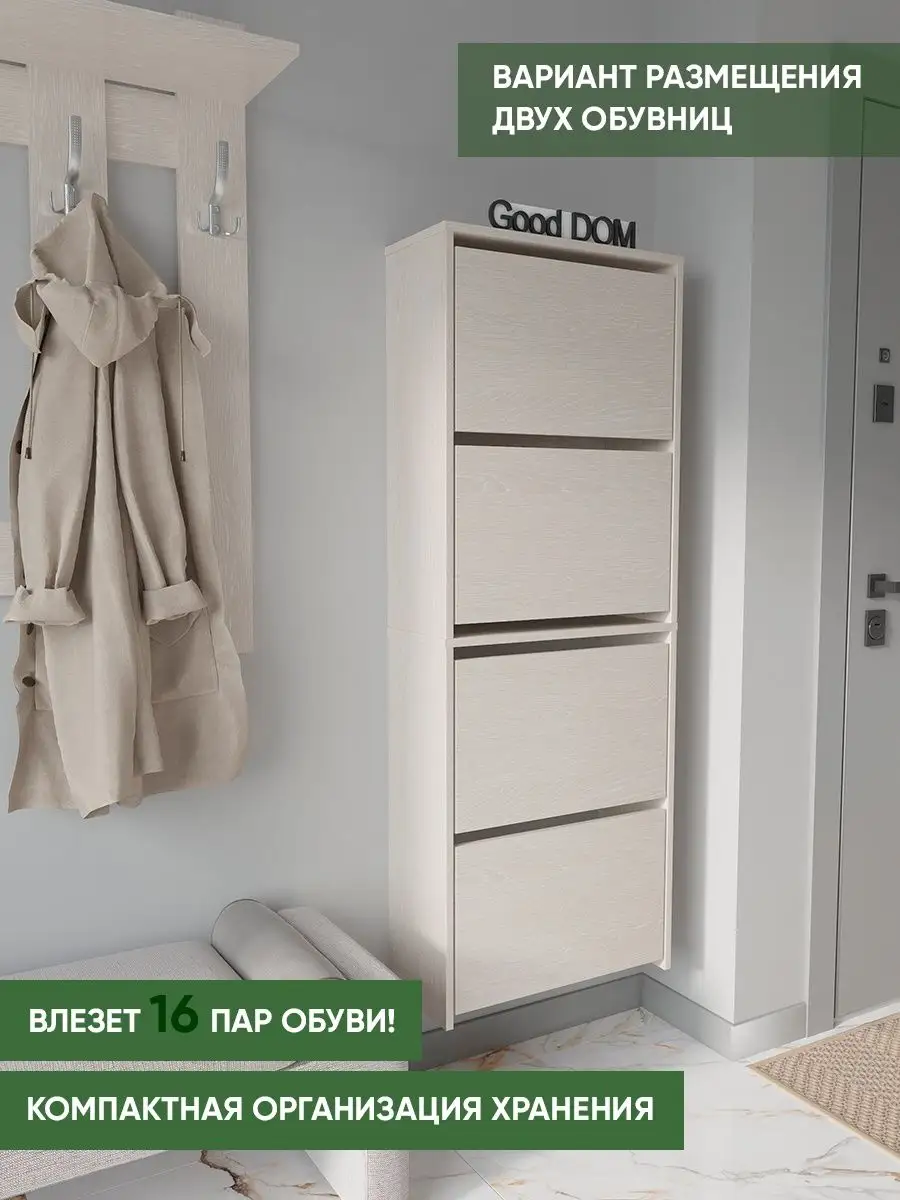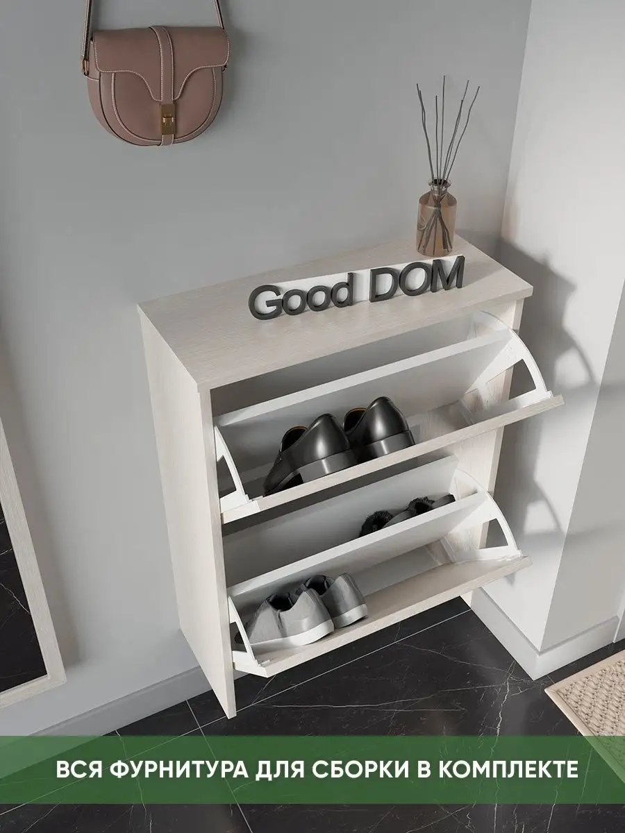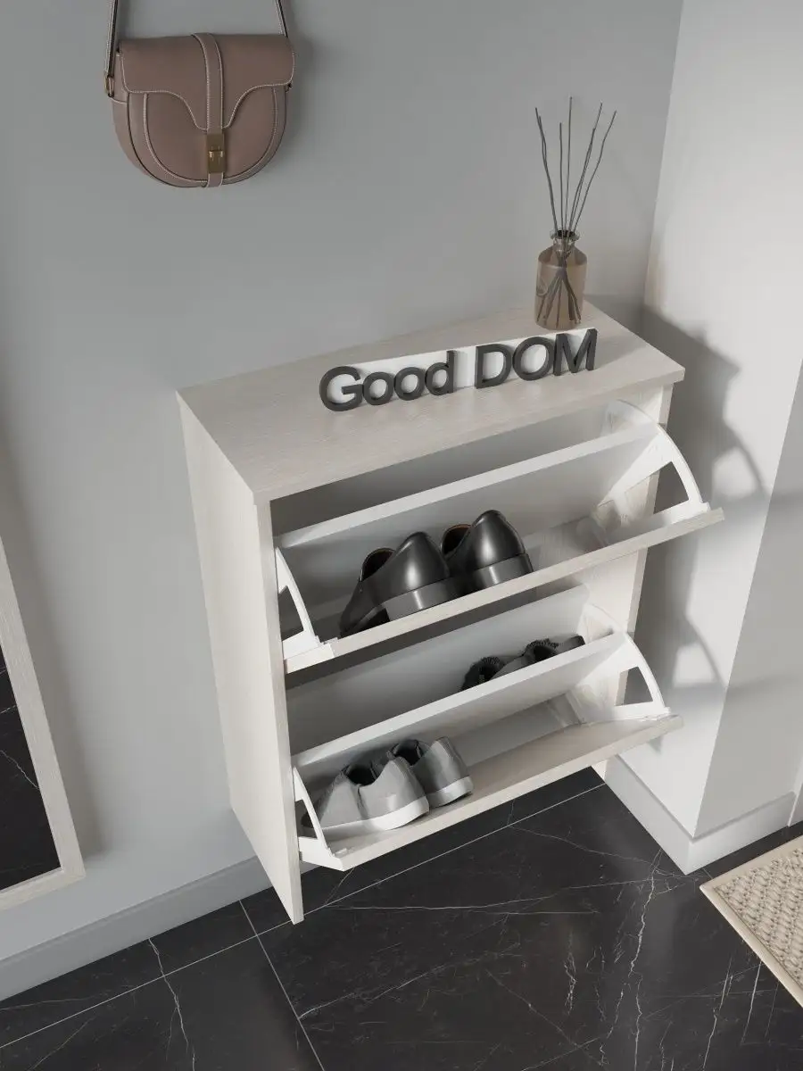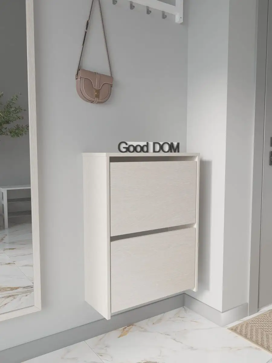 Обувница закрытая - удобная мебель в прихожую для функционального и удобного хранения обуви и вещей в коридоре. Тумба под обувь с откидными дверцами поможет сэкономить полезное пространство и не займет много места. Полка для обуви узкая влезет даже в маленький коридор, уместиться в небольшой гардеробной. Этажерка закрытая защитит обувь от попадания пыли, к тому же закрытая конструкция выглядит аккуратно и не перегружает пространство. Стеллаж из ЛДСП не ржавеет и при должном уходе прослужит долгие годы в отличие от металлической подставки и тем более пластиковой. Шкаф имеет поверхность сверху - верхнюю полку, на которой можно разместить зонты или ключи, прочие принадлежности и вещи, используемые в прихожей. Также у навесной обувницы есть две откидные полки для обуви, разделенных на две секции, что позволяет в такой компактной обувнице уместить целых 8 пар обуви! Подвесная обувница выглядит стильно и компактно. Галошницу можно дополнить вешалкой и зеркалом и получить удобный комплект в прихожую. Обувная полочка легко заменит громоздкий комод, стенку или шкаф. В нашем ассортименте представлена другая мебель для прихожей (и не только) – вы можете легко посмотреть весь ассортимент, щелкнув на значок логотипа. Мы постоянно работаем над качеством нашей продукции, поэтому улучшили упаковку - наша усиленная упаковка защитит Вашу Обувницу при доставке от сломаных углов и сколов! Выбирая продукцию отечественного производителя Good Дом, все в Дом Вы обеспечиваете себя гарантией на продукцию сроком в 1 год, Вы выбираете качество и комфорт.