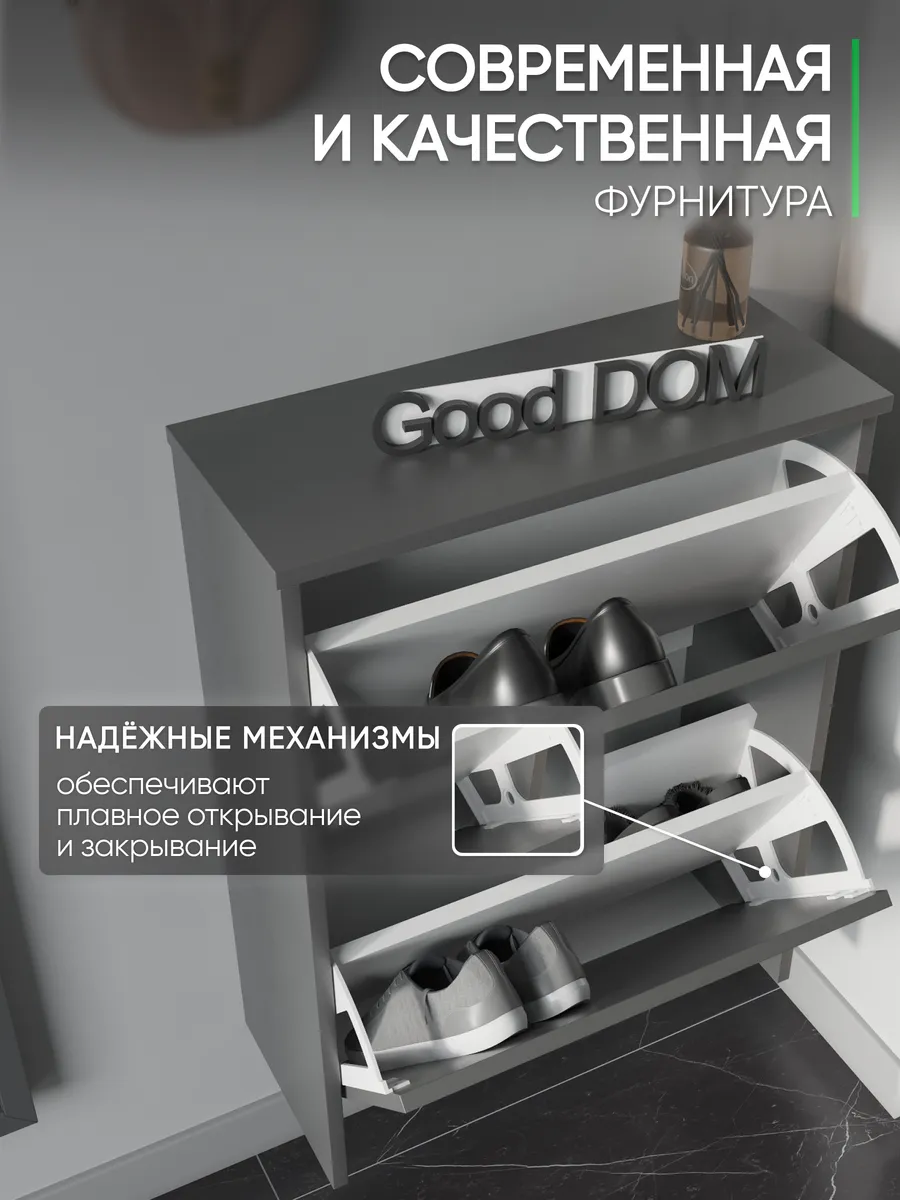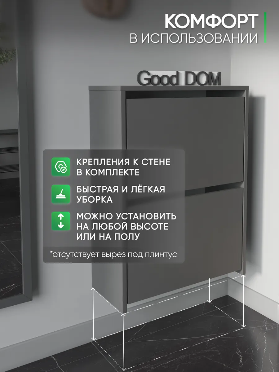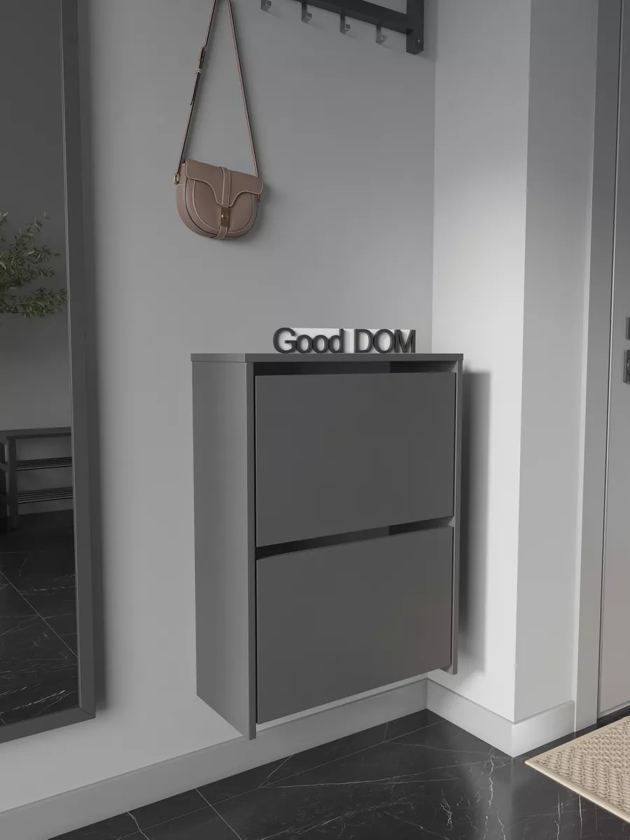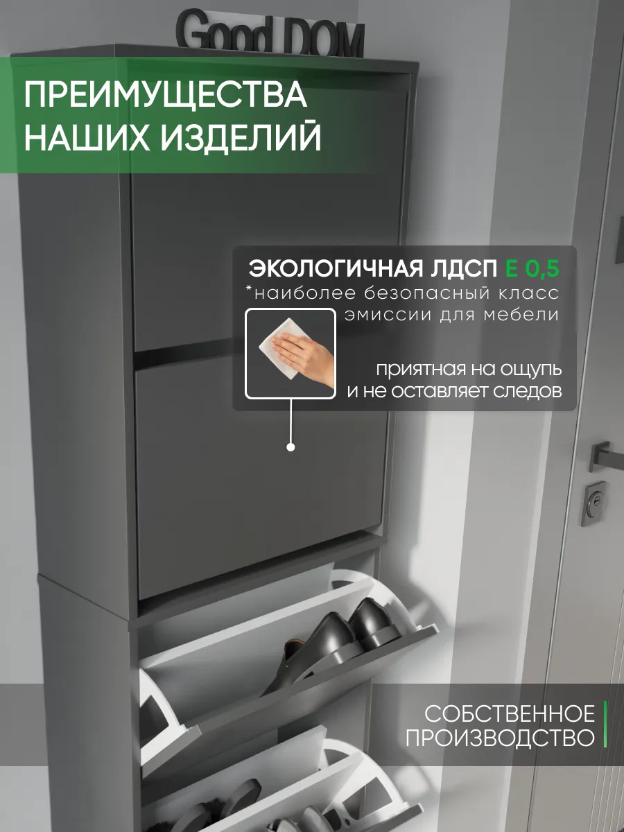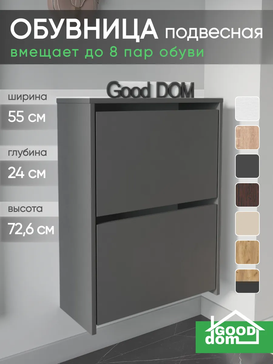Обувница закрытая - удобная мебель в прихожую для функционального и удобного хранения обуви и вещей в коридоре. Тумба под обувь с откидными дверцами поможет сэкономить полезное пространство и не займет много места. Полка для обуви узкая влезет даже в маленький коридор, уместиться в небольшой гардеробной. Этажерка закрытая защитит обувь от попадания пыли, к тому же закрытая конструкция выглядит аккуратно и не перегружает пространство. Стеллаж из ЛДСП не ржавеет и при должном уходе прослужит долгие годы в отличие от металлической подставки и тем более пластиковой. Шкаф имеет поверхность сверху - верхнюю полку, на которой можно разместить зонты или ключи, прочие принадлежности и вещи, используемые в прихожей. Также у навесной обувницы есть две откидные полки для обуви, разделенных на две секции, что позволяет в такой компактной обувнице уместить целых 8 пар обуви! Подвесная обувница выглядит стильно и компактно. Галошницу можно дополнить вешалкой и зеркалом и получить удобный комплект в прихожую. Обувная полочка легко заменит громоздкий комод, стенку или шкаф. В нашем ассортименте представлена другая мебель для прихожей (и не только) – вы можете легко посмотреть весь ассортимент, щелкнув на значок логотипа. Мы постоянно работаем над качеством нашей продукции, поэтому улучшили упаковку - наша усиленная упаковка защитит Вашу Обувницу при доставке от сломаных углов и сколов! Выбирая продукцию отечественного производителя Good Дом, все в Дом Вы обеспечиваете себя гарантией на продукцию сроком в 1 год, Вы выбираете качество и комфорт.