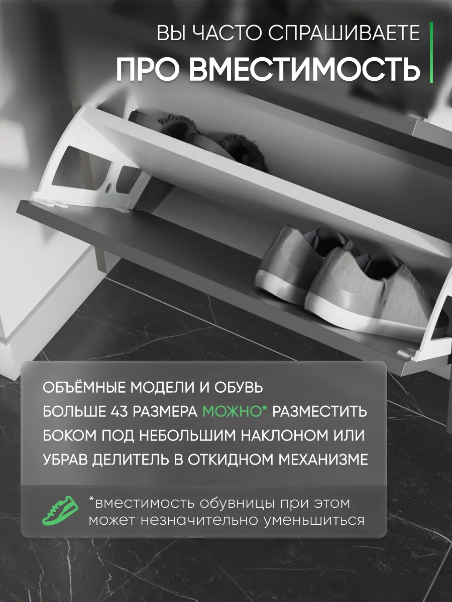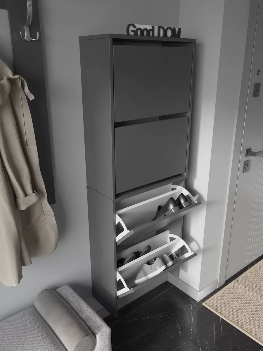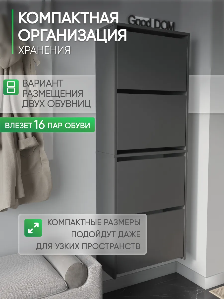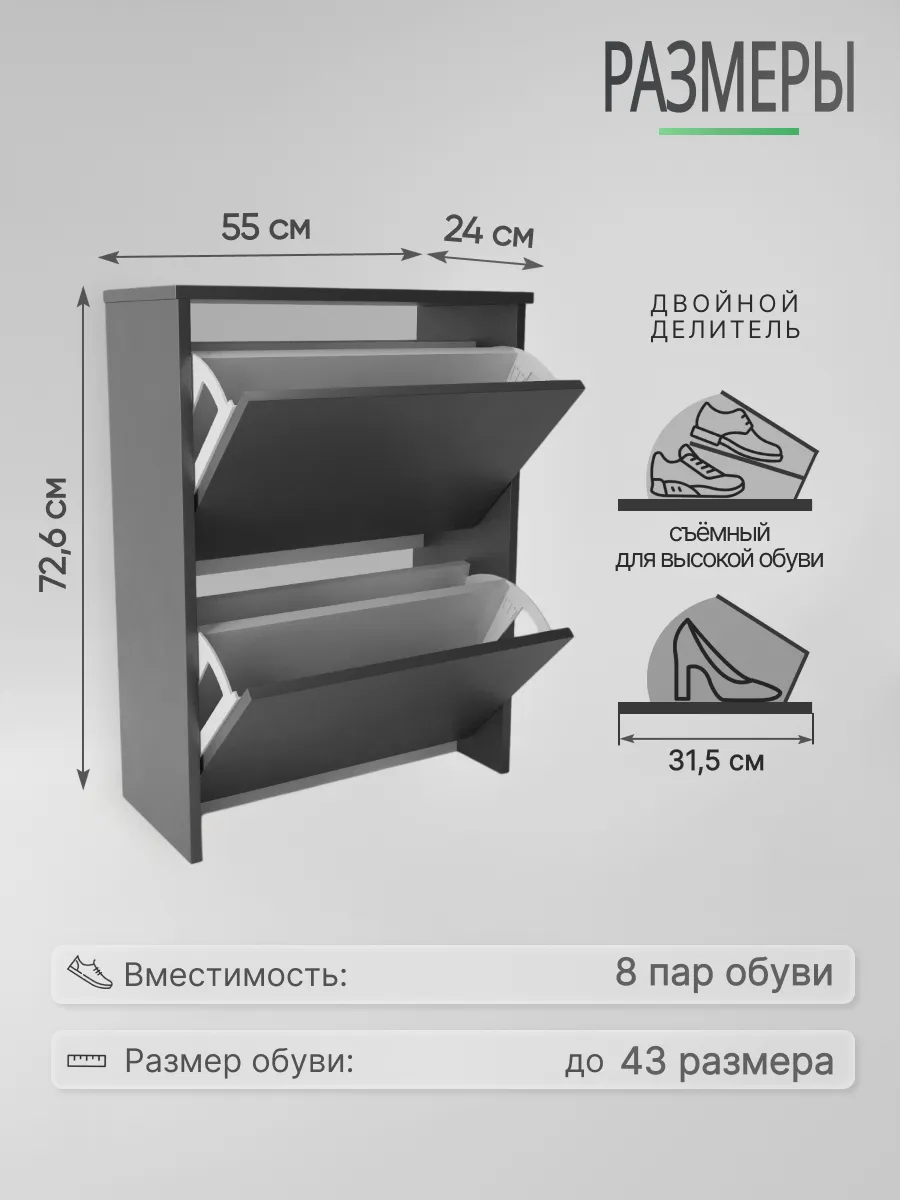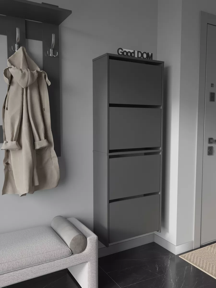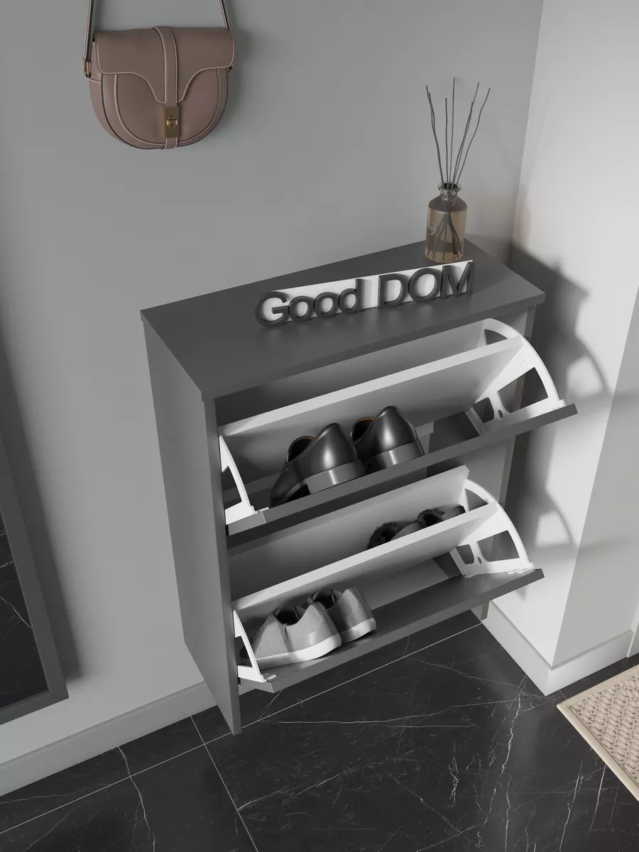 Обувница закрытая - удобная мебель в прихожую для функционального и удобного хранения обуви и вещей в коридоре. Тумба под обувь с откидными дверцами поможет сэкономить полезное пространство и не займет много места. Полка для обуви узкая влезет даже в маленький коридор, уместиться в небольшой гардеробной. Этажерка закрытая защитит обувь от попадания пыли, к тому же закрытая конструкция выглядит аккуратно и не перегружает пространство. Стеллаж из ЛДСП не ржавеет и при должном уходе прослужит долгие годы в отличие от металлической подставки и тем более пластиковой. Шкаф имеет поверхность сверху - верхнюю полку, на которой можно разместить зонты или ключи, прочие принадлежности и вещи, используемые в прихожей. Также у навесной обувницы есть две откидные полки для обуви, разделенных на две секции, что позволяет в такой компактной обувнице уместить целых 8 пар обуви! Подвесная обувница выглядит стильно и компактно. Галошницу можно дополнить вешалкой и зеркалом и получить удобный комплект в прихожую. Обувная полочка легко заменит громоздкий комод, стенку или шкаф. В нашем ассортименте представлена другая мебель для прихожей (и не только) – вы можете легко посмотреть весь ассортимент, щелкнув на значок логотипа. Мы постоянно работаем над качеством нашей продукции, поэтому улучшили упаковку - наша усиленная упаковка защитит Вашу Обувницу при доставке от сломаных углов и сколов! Выбирая продукцию отечественного производителя Good Дом, все в Дом Вы обеспечиваете себя гарантией на продукцию сроком в 1 год, Вы выбираете качество и комфорт.