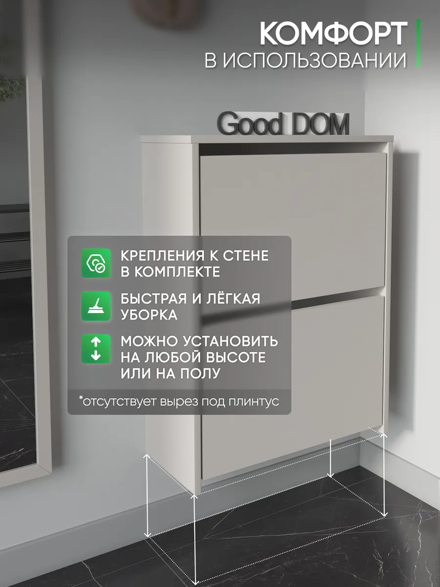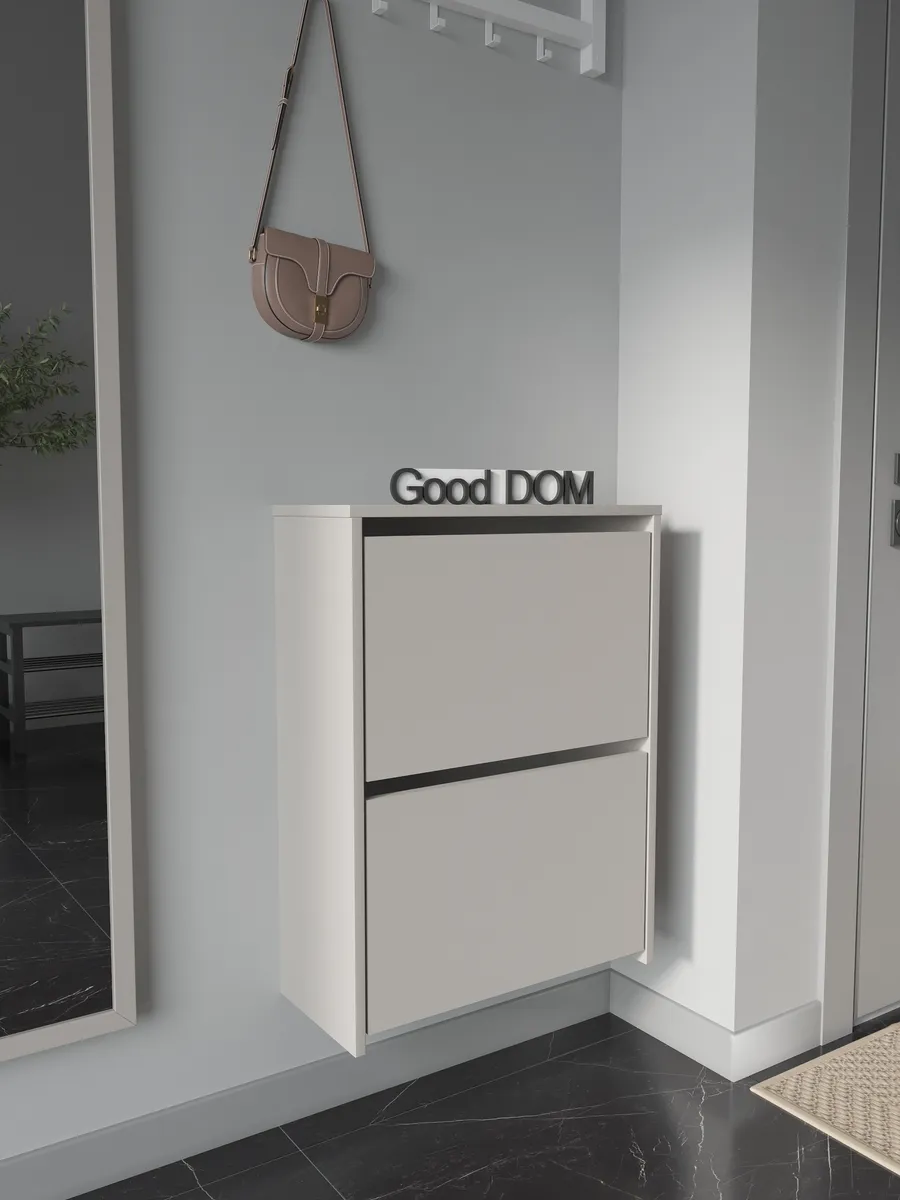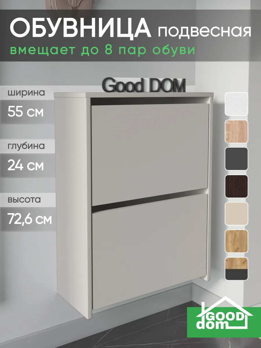 Обувница закрытая - удобная мебель в прихожую для функционального и удобного хранения обуви и вещей в коридоре. Тумба под обувь с откидными дверцами поможет сэкономить полезное пространство и не займет много места. Полка для обуви узкая влезет даже в маленький коридор, уместиться в небольшой гардеробной. Этажерка закрытая защитит обувь от попадания пыли, к тому же закрытая конструкция выглядит аккуратно и не перегружает пространство. Стеллаж из ЛДСП не ржавеет и при должном уходе прослужит долгие годы в отличие от металлической подставки и тем более пластиковой. Шкаф имеет поверхность сверху - верхнюю полку, на которой можно разместить зонты или ключи, прочие принадлежности и вещи, используемые в прихожей. Также у навесной обувницы есть две откидные полки для обуви, разделенных на две секции, что позволяет в такой компактной обувнице уместить целых 8 пар обуви! Подвесная обувница выглядит стильно и компактно. Галошницу можно дополнить вешалкой и зеркалом и получить удобный комплект в прихожую. Обувная полочка легко заменит громоздкий комод, стенку или шкаф. В нашем ассортименте представлена другая мебель для прихожей (и не только) – вы можете легко посмотреть весь ассортимент, щелкнув на значок логотипа. Мы постоянно работаем над качеством нашей продукции, поэтому улучшили упаковку - наша усиленная упаковка защитит Вашу Обувницу при доставке от сломаных углов и сколов! Выбирая продукцию отечественного производителя Good Дом, все в Дом Вы обеспечиваете себя гарантией на продукцию сроком в 1 год, Вы выбираете качество и комфорт.