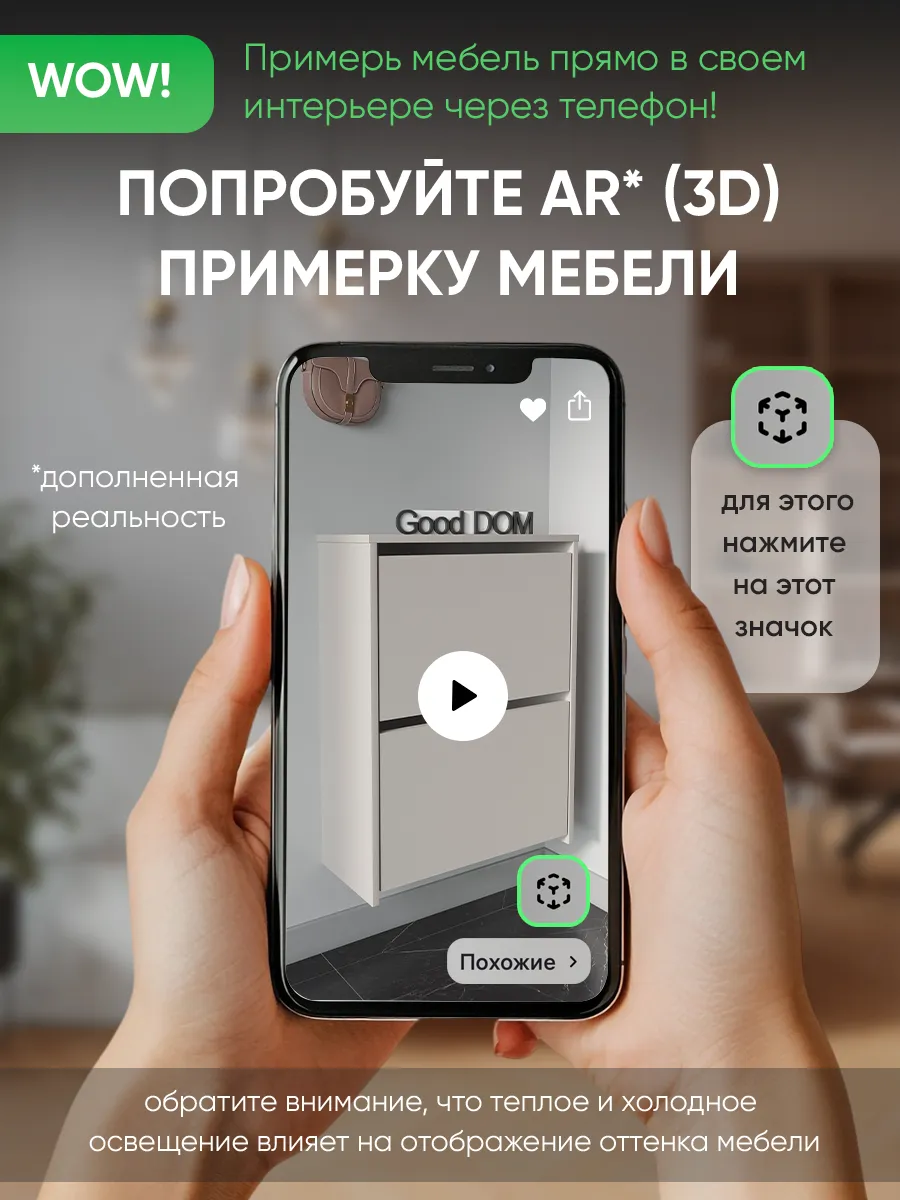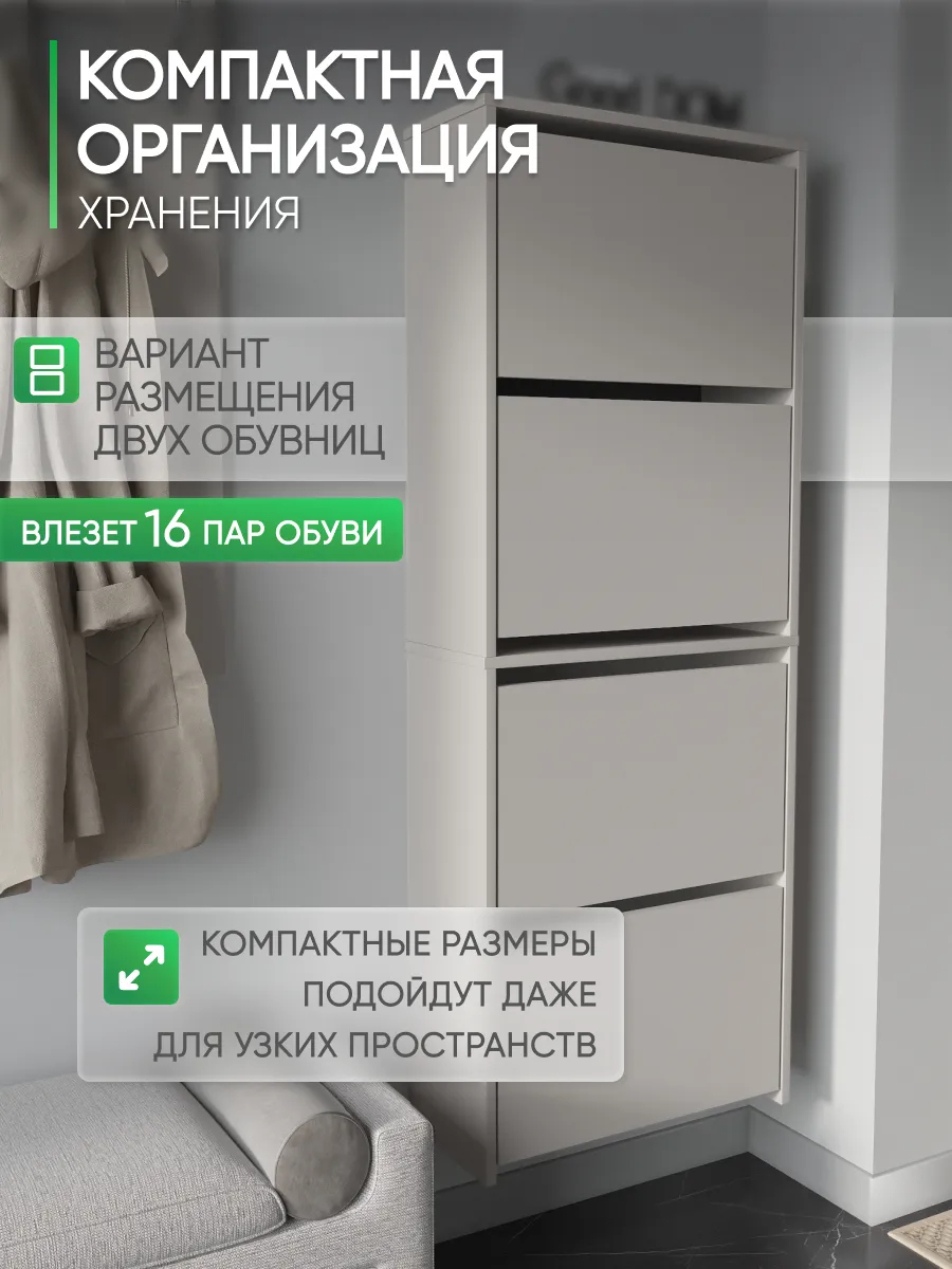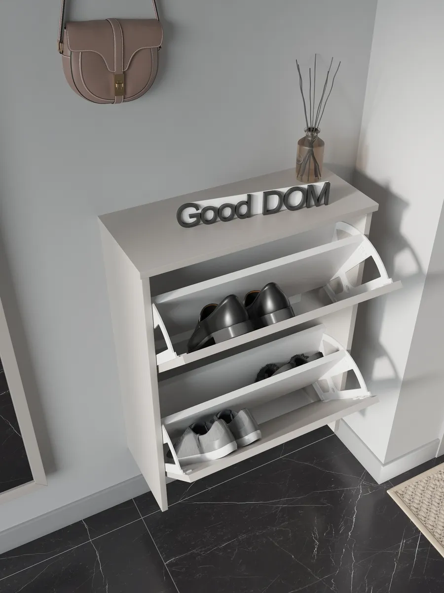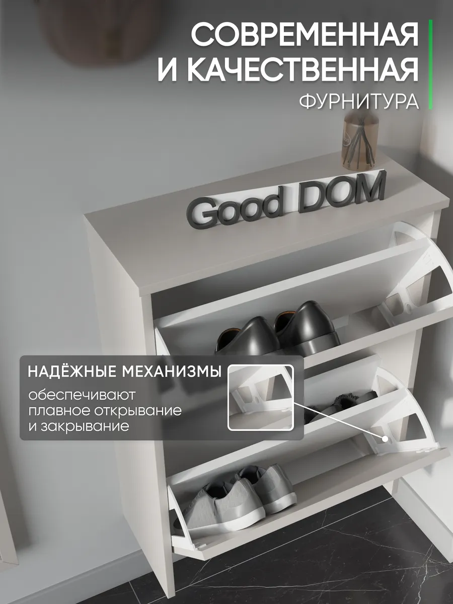 Обувница закрытая - удобная мебель в прихожую для функционального и удобного хранения обуви и вещей в коридоре. Тумба под обувь с откидными дверцами поможет сэкономить полезное пространство и не займет много места. Полка для обуви узкая влезет даже в маленький коридор, уместиться в небольшой гардеробной. Этажерка закрытая защитит обувь от попадания пыли, к тому же закрытая конструкция выглядит аккуратно и не перегружает пространство. Стеллаж из ЛДСП не ржавеет и при должном уходе прослужит долгие годы в отличие от металлической подставки и тем более пластиковой. Шкаф имеет поверхность сверху - верхнюю полку, на которой можно разместить зонты или ключи, прочие принадлежности и вещи, используемые в прихожей. Также у навесной обувницы есть две откидные полки для обуви, разделенных на две секции, что позволяет в такой компактной обувнице уместить целых 8 пар обуви! Подвесная обувница выглядит стильно и компактно. Галошницу можно дополнить вешалкой и зеркалом и получить удобный комплект в прихожую. Обувная полочка легко заменит громоздкий комод, стенку или шкаф. В нашем ассортименте представлена другая мебель для прихожей (и не только) – вы можете легко посмотреть весь ассортимент, щелкнув на значок логотипа. Мы постоянно работаем над качеством нашей продукции, поэтому улучшили упаковку - наша усиленная упаковка защитит Вашу Обувницу при доставке от сломаных углов и сколов! Выбирая продукцию отечественного производителя Good Дом, все в Дом Вы обеспечиваете себя гарантией на продукцию сроком в 1 год, Вы выбираете качество и комфорт.