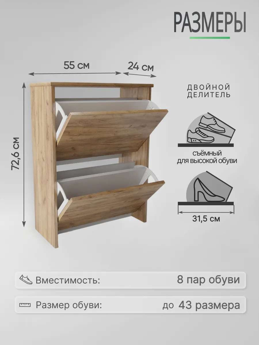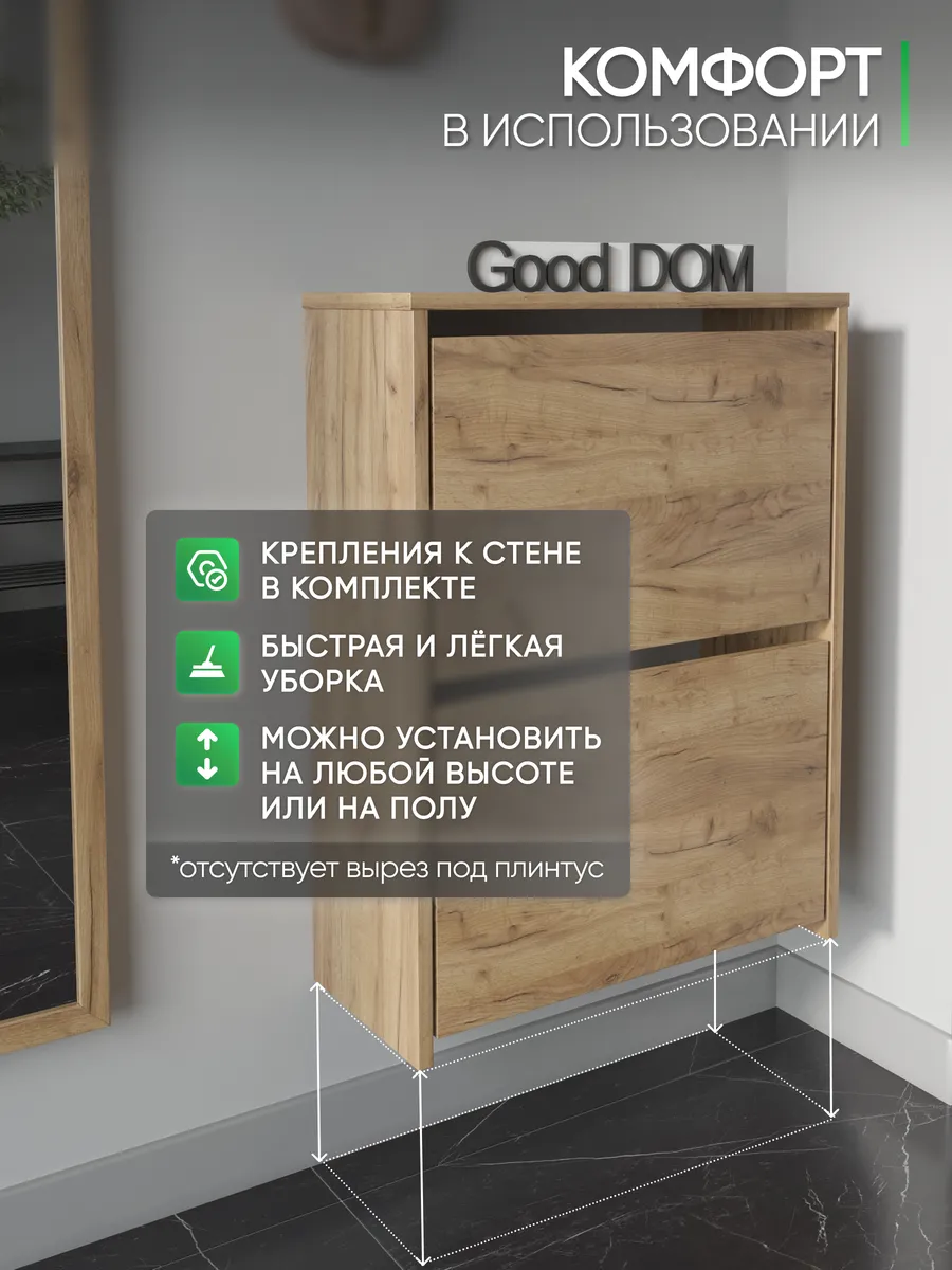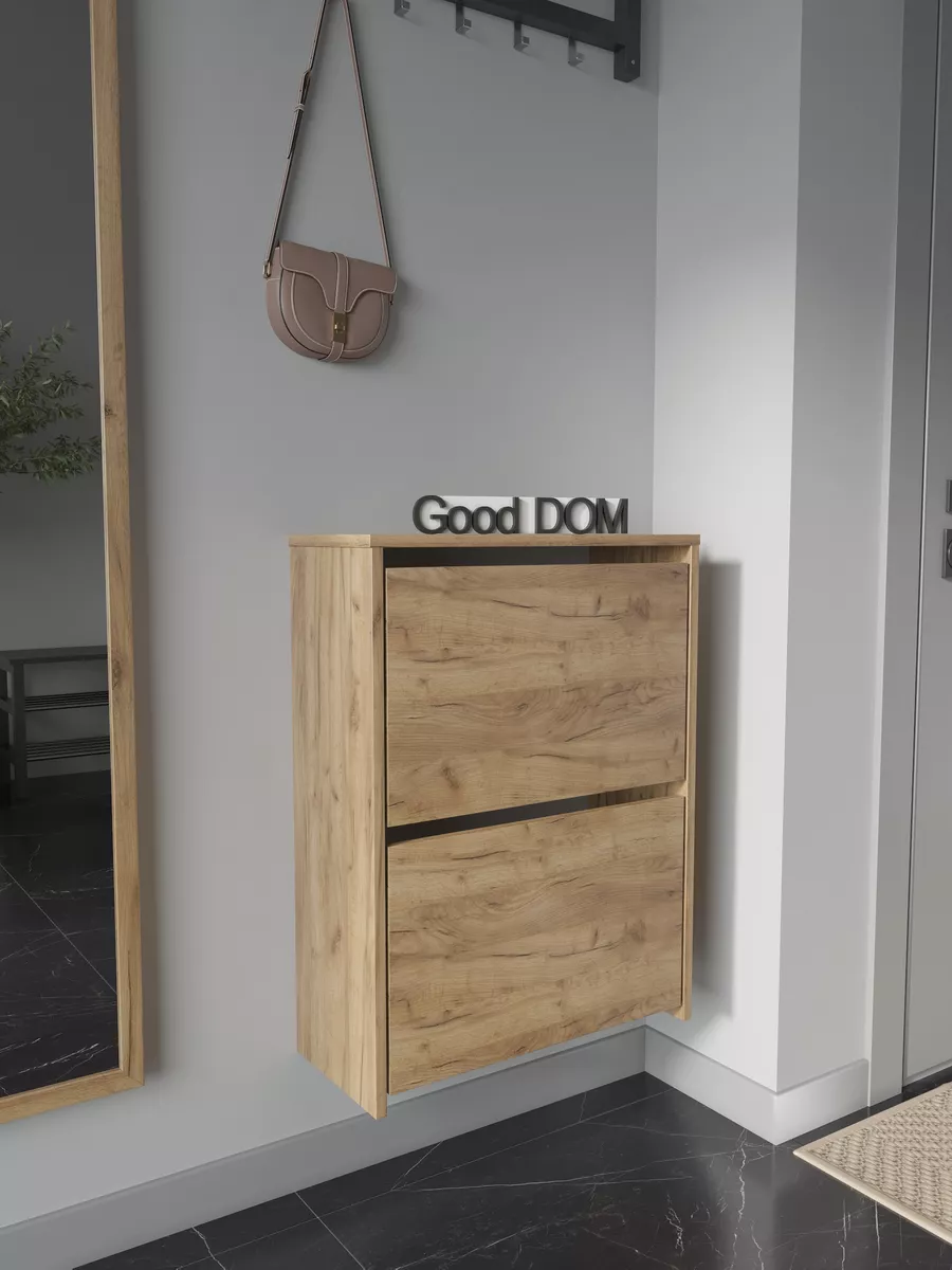 Обувница закрытая - удобная мебель в прихожую для функционального и удобного хранения обуви и вещей в коридоре. Тумба под обувь с откидными дверцами поможет сэкономить полезное пространство и не займет много места. Полка для обуви узкая влезет даже в маленький коридор, уместиться в небольшой гардеробной. Этажерка закрытая защитит обувь от попадания пыли, к тому же закрытая конструкция выглядит аккуратно и не перегружает пространство. Стеллаж из ЛДСП не ржавеет и при должном уходе прослужит долгие годы в отличие от металлической подставки и тем более пластиковой. Шкаф имеет поверхность сверху - верхнюю полку, на которой можно разместить зонты или ключи, прочие принадлежности и вещи, используемые в прихожей. Также у навесной обувницы есть две откидные полки для обуви, разделенных на две секции, что позволяет в такой компактной обувнице уместить целых 8 пар обуви! Подвесная обувница выглядит стильно и компактно. Галошницу можно дополнить вешалкой и зеркалом и получить удобный комплект в прихожую. Обувная полочка легко заменит громоздкий комод, стенку или шкаф. В нашем ассортименте представлена другая мебель для прихожей (и не только) – вы можете легко посмотреть весь ассортимент, щелкнув на значок логотипа. Мы постоянно работаем над качеством нашей продукции, поэтому улучшили упаковку - наша усиленная упаковка защитит Вашу Обувницу при доставке от сломаных углов и сколов! Выбирая продукцию отечественного производителя Good Дом, все в Дом Вы обеспечиваете себя гарантией на продукцию сроком в 1 год, Вы выбираете качество и комфорт.