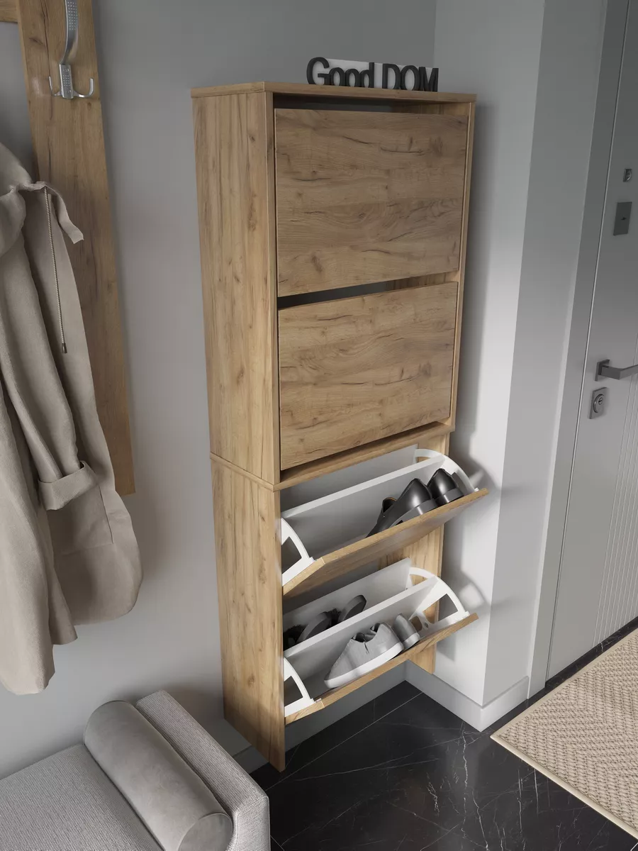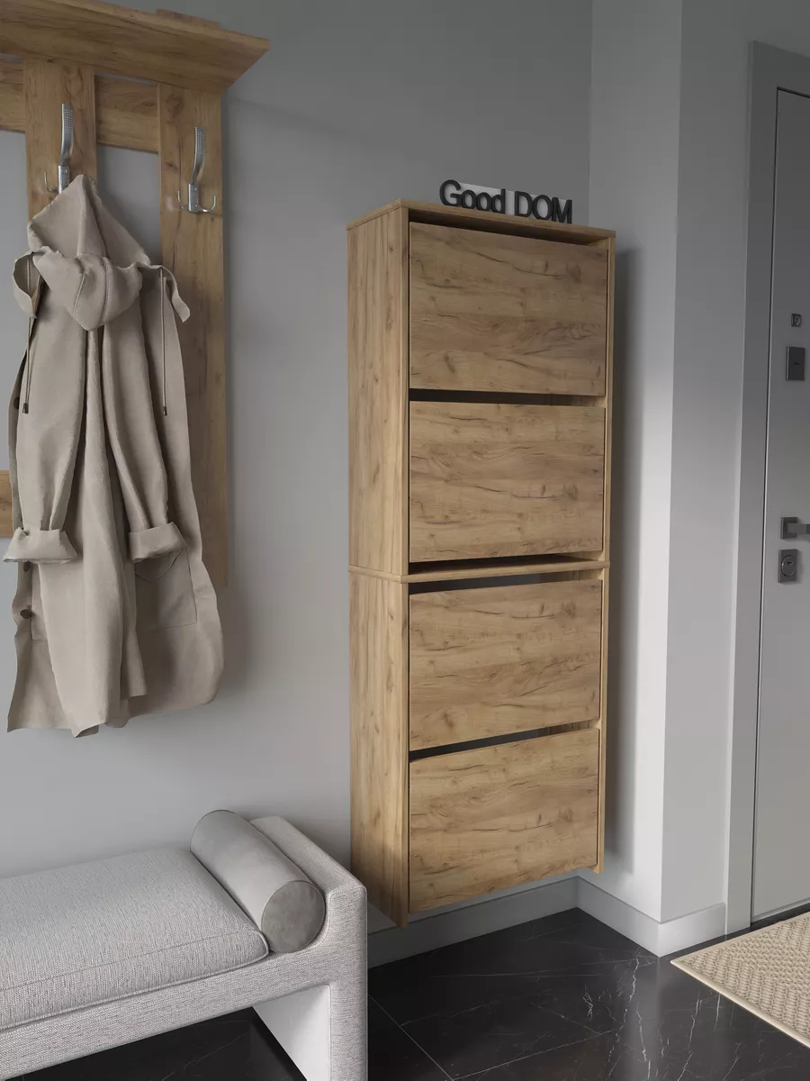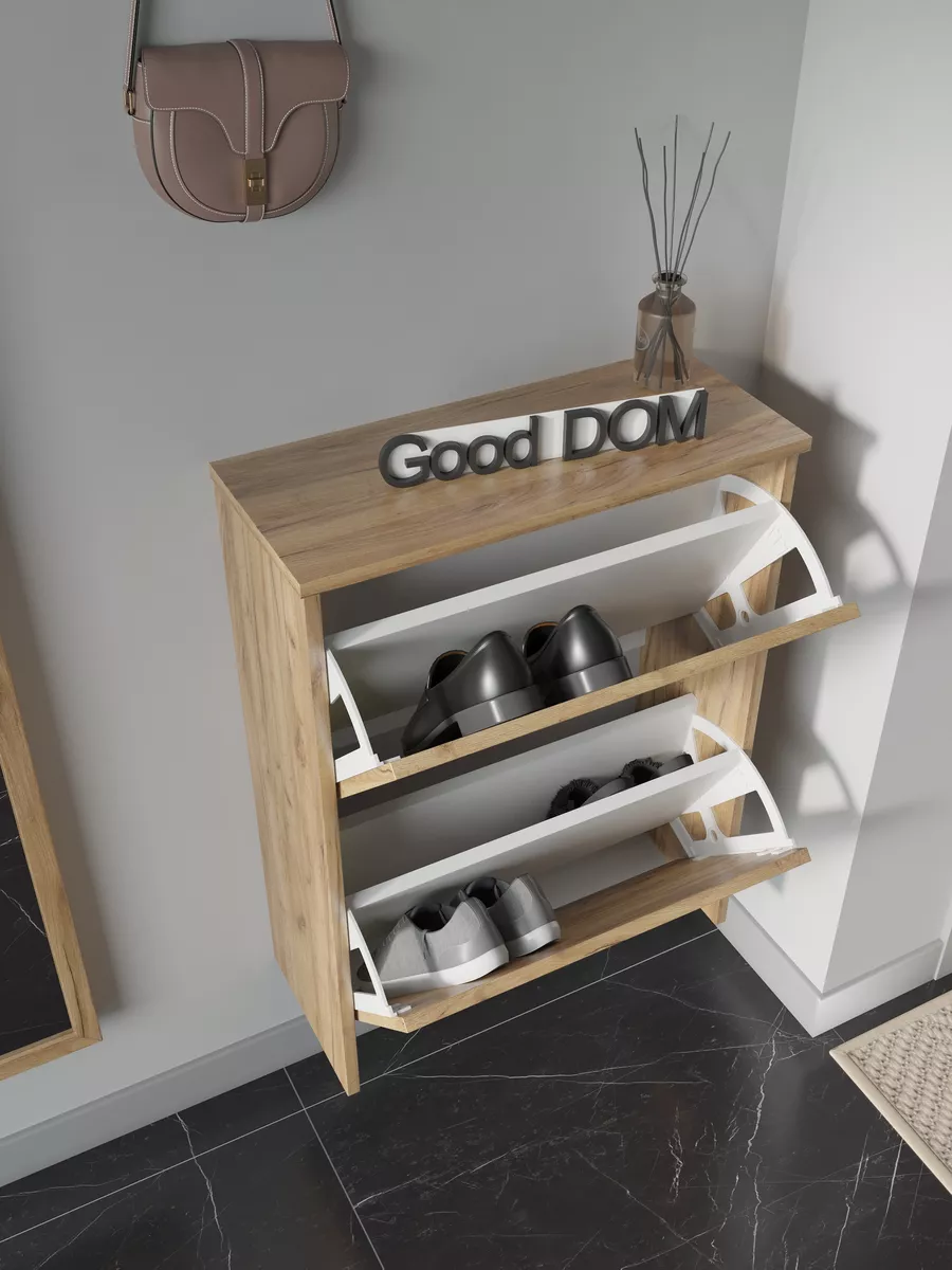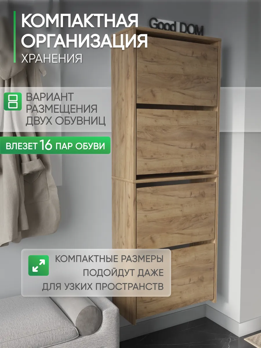 Обувница закрытая - удобная мебель в прихожую для функционального и удобного хранения обуви и вещей в коридоре. Тумба под обувь с откидными дверцами поможет сэкономить полезное пространство и не займет много места. Полка для обуви узкая влезет даже в маленький коридор, уместиться в небольшой гардеробной. Этажерка закрытая защитит обувь от попадания пыли, к тому же закрытая конструкция выглядит аккуратно и не перегружает пространство. Стеллаж из ЛДСП не ржавеет и при должном уходе прослужит долгие годы в отличие от металлической подставки и тем более пластиковой. Шкаф имеет поверхность сверху - верхнюю полку, на которой можно разместить зонты или ключи, прочие принадлежности и вещи, используемые в прихожей. Также у навесной обувницы есть две откидные полки для обуви, разделенных на две секции, что позволяет в такой компактной обувнице уместить целых 8 пар обуви! Подвесная обувница выглядит стильно и компактно. Галошницу можно дополнить вешалкой и зеркалом и получить удобный комплект в прихожую. Обувная полочка легко заменит громоздкий комод, стенку или шкаф. В нашем ассортименте представлена другая мебель для прихожей (и не только) – вы можете легко посмотреть весь ассортимент, щелкнув на значок логотипа. Мы постоянно работаем над качеством нашей продукции, поэтому улучшили упаковку - наша усиленная упаковка защитит Вашу Обувницу при доставке от сломаных углов и сколов! Выбирая продукцию отечественного производителя Good Дом, все в Дом Вы обеспечиваете себя гарантией на продукцию сроком в 1 год, Вы выбираете качество и комфорт.