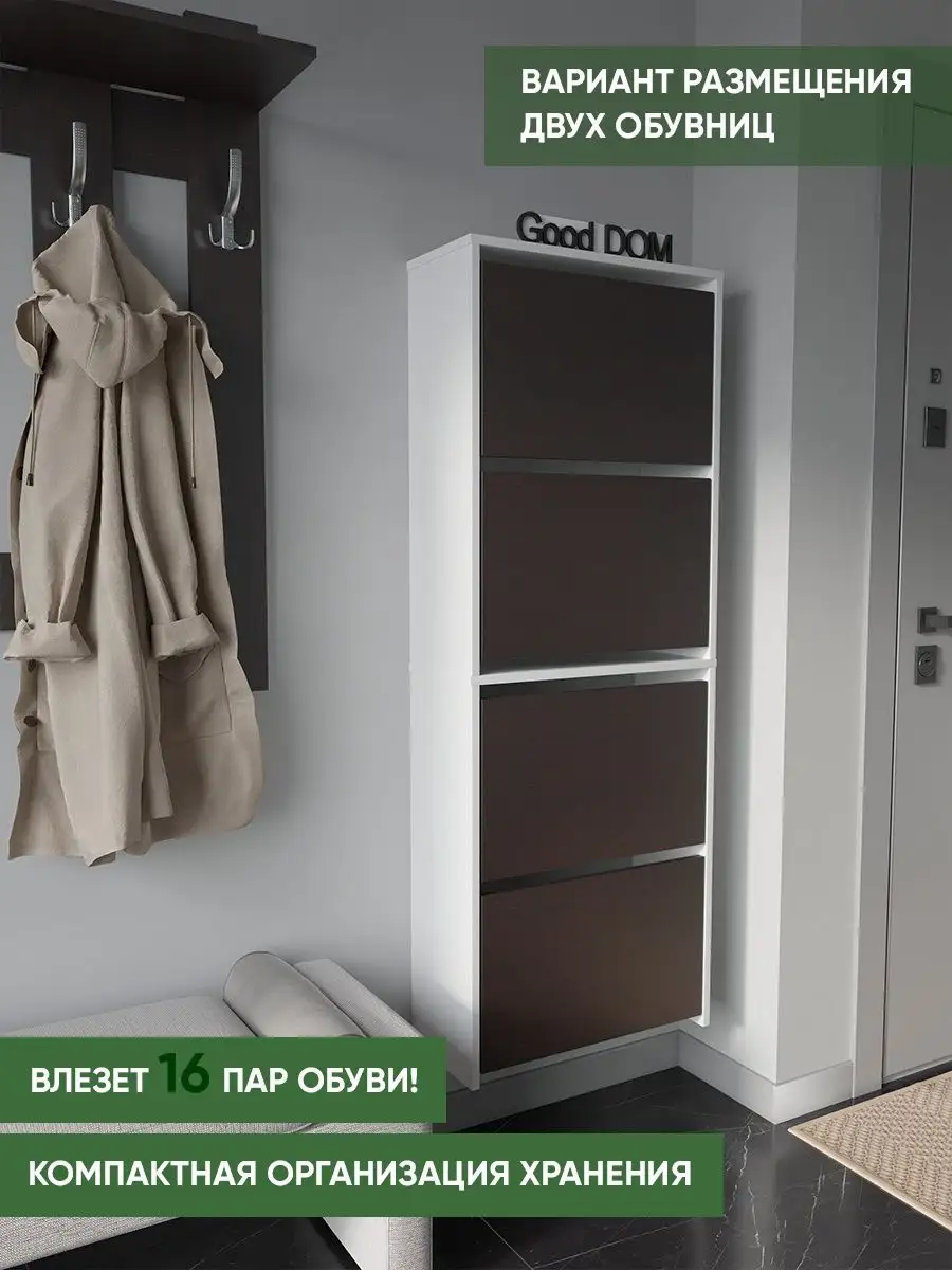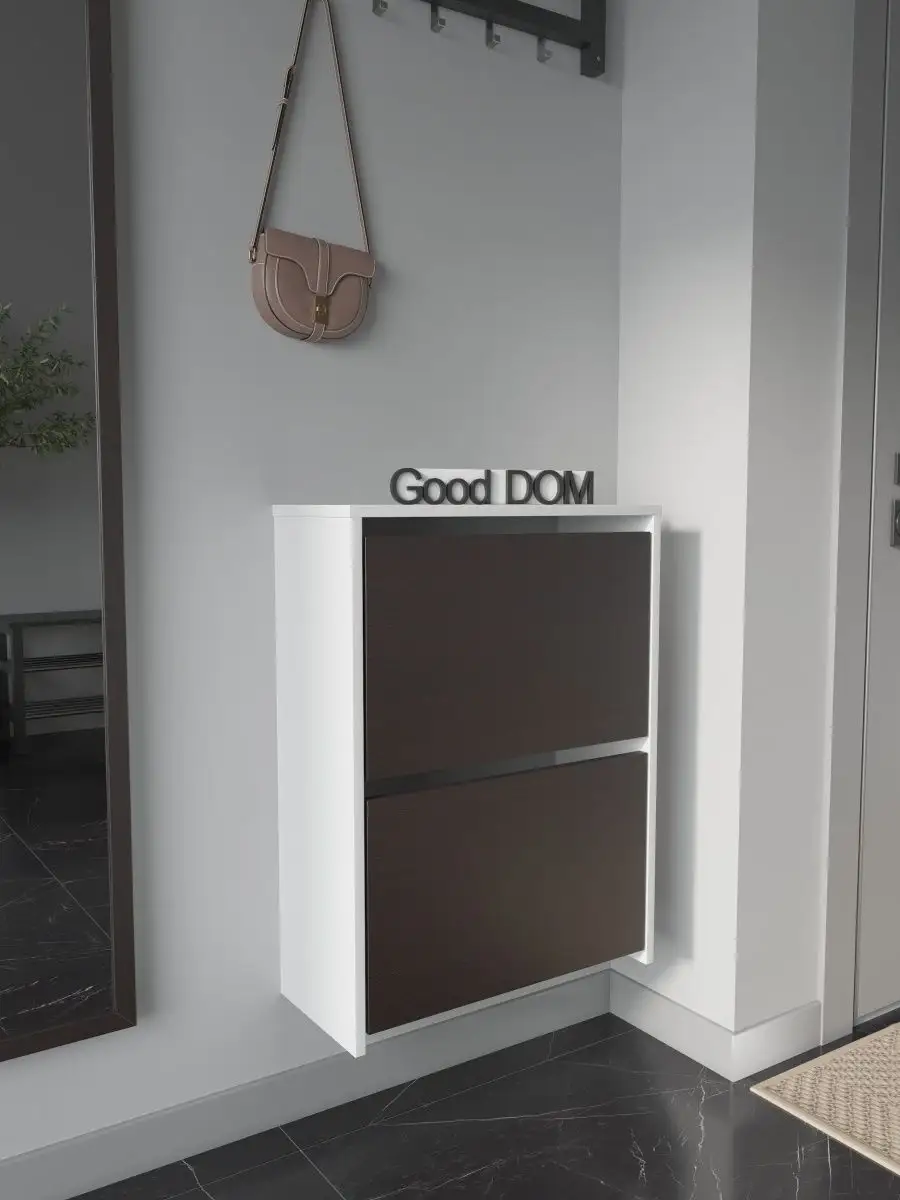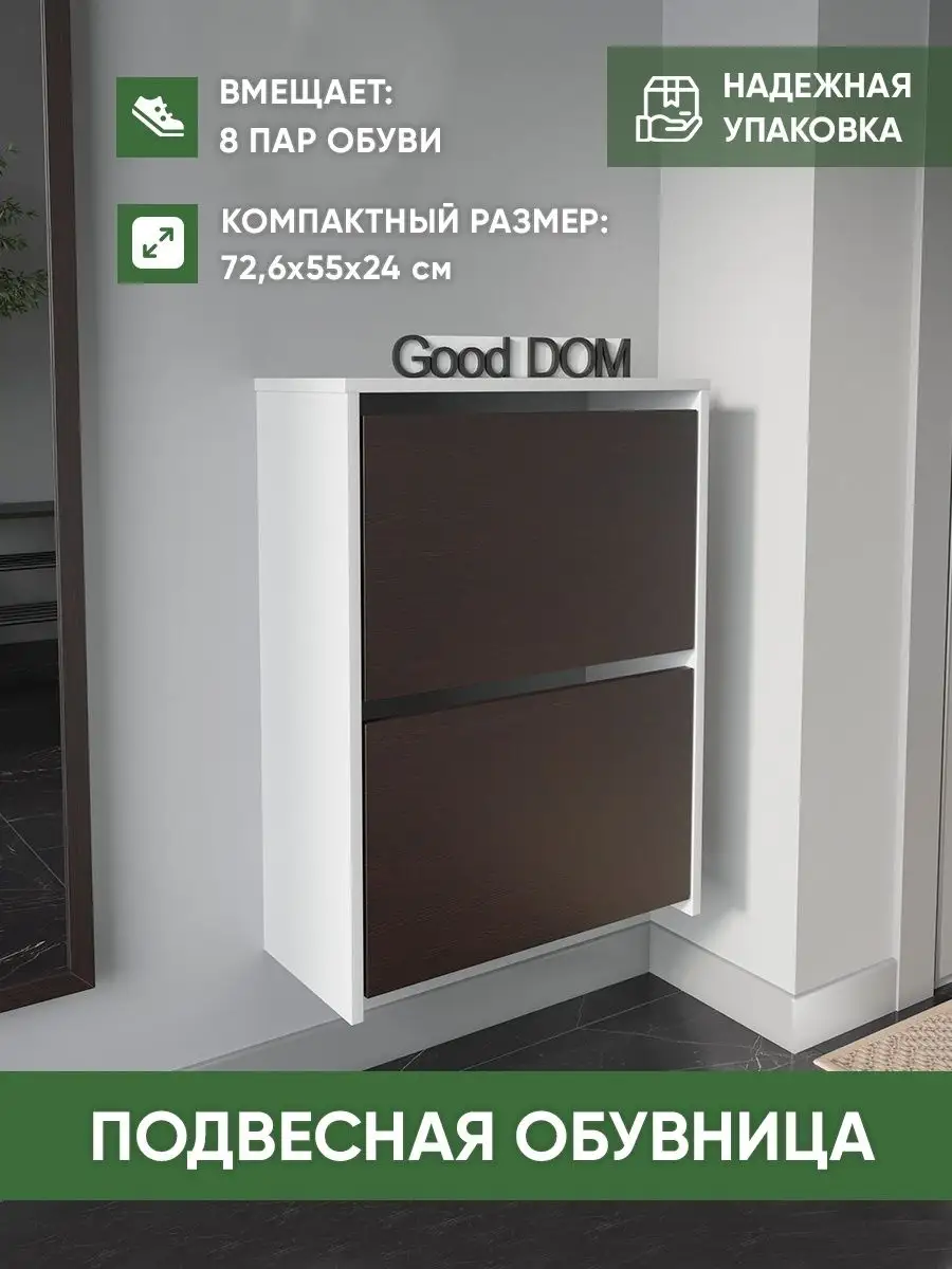 Обувница закрытая - удобная мебель в прихожую для функционального и удобного хранения обуви и вещей в коридоре. Тумба под обувь с откидными дверцами поможет сэкономить полезное пространство и не займет много места. Полка для обуви узкая влезет даже в маленький коридор, уместиться в небольшой гардеробной. Этажерка закрытая защитит обувь от попадания пыли, к тому же закрытая конструкция выглядит аккуратно и не перегружает пространство. Стеллаж из ЛДСП не ржавеет и при должном уходе прослужит долгие годы в отличие от металлической подставки и тем более пластиковой. Шкаф имеет поверхность сверху - верхнюю полку, на которой можно разместить сумки или ключи. Также у навесной обувницы есть две откидные полки для обуви, разделенных на две секции, что позволяет в такой компактной обувнице уместить целых 8 пар обуви! Подвесная обувница выглядит стильно и компактно. Галошницу можно дополнить вешалкой и зеркалом и получить удобный комплект в прихожую. Обувная полочка легко заменит громоздкий комод, стенку или шкаф. В нашем ассортименте представлена другая мебель для прихожей (и не только) – вы можете легко посмотреть весь ассортимент, щелкнув на значок логотипа. Мы постоянно работаем над качеством нашей продукции, поэтому улучшили упаковку - наша усиленная упаковка защитит Вашу Обувницу при доставке от сломаных углов и сколов! Выбирая продукцию отечественного производителя Good Дом, все в Дом Вы обеспечиваете себя гарантией на продукцию сроком в 1 год, Вы выбираете качество и комфорт.