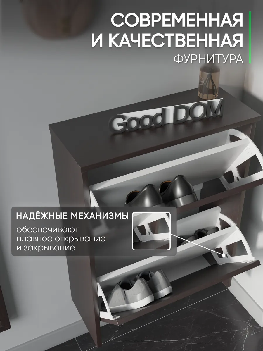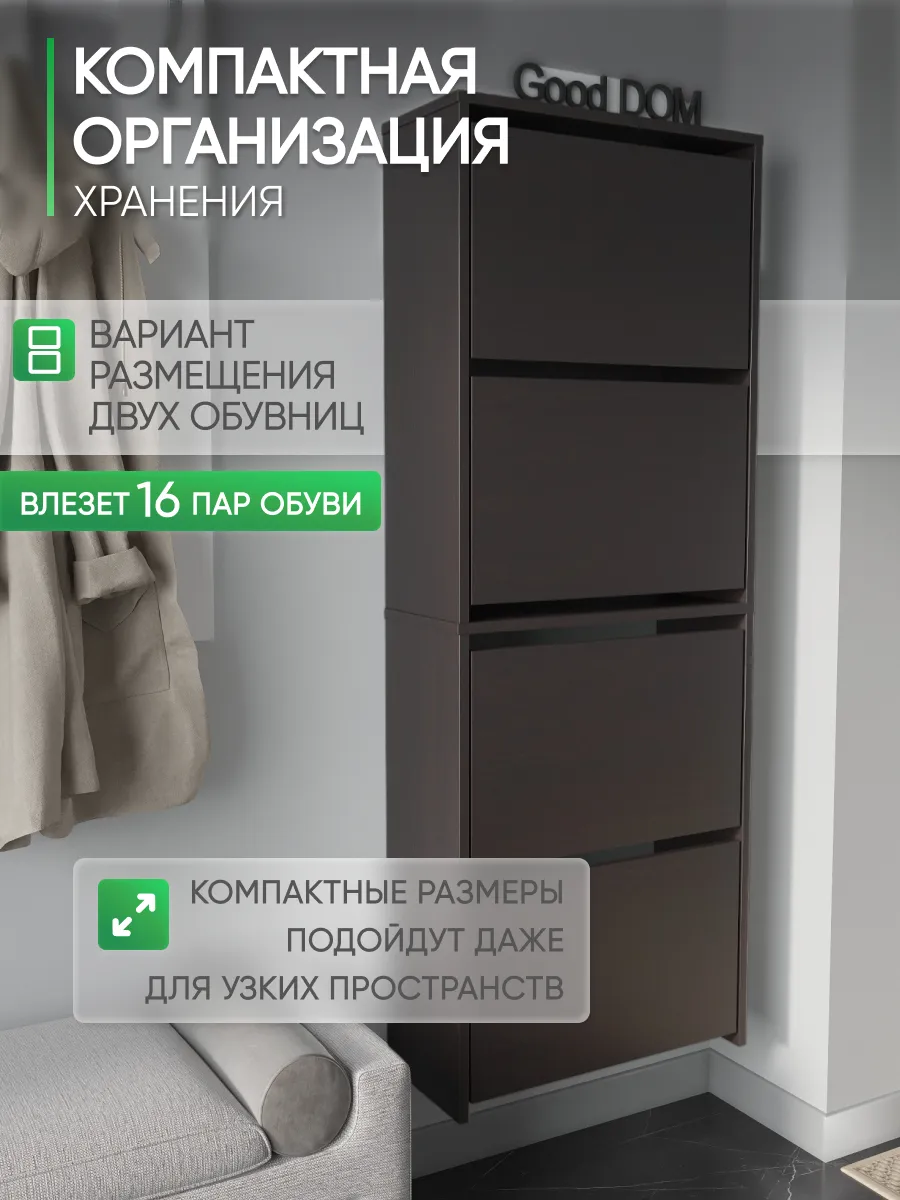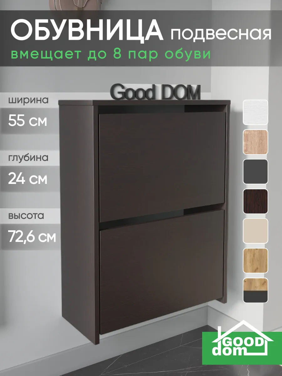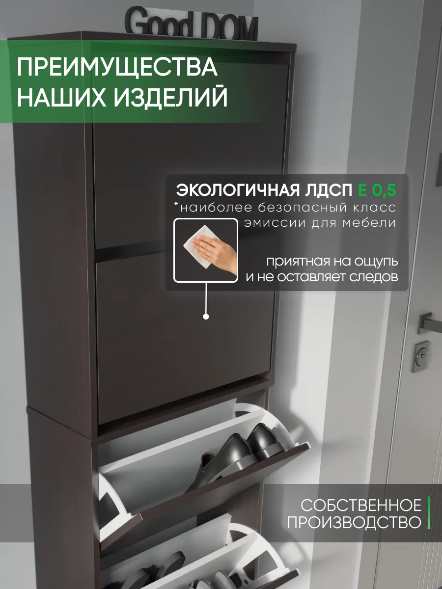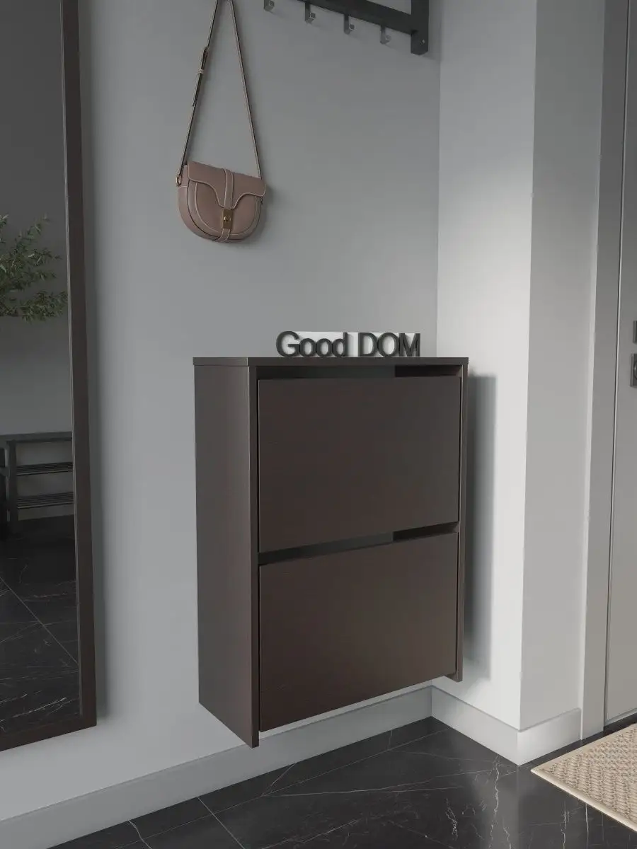 Обувница закрытая - удобная мебель в прихожую для функционального и удобного хранения обуви и вещей в коридоре. Тумба под обувь с откидными дверцами поможет сэкономить полезное пространство и не займет много места. Полка для обуви узкая влезет даже в маленький коридор, уместиться в небольшой гардеробной. Этажерка закрытая защитит обувь от попадания пыли, к тому же закрытая конструкция выглядит аккуратно и не перегружает пространство. Стеллаж из ЛДСП не ржавеет и при должном уходе прослужит долгие годы в отличие от металлической подставки и тем более пластиковой. Шкаф имеет поверхность сверху - верхнюю полку, на которой можно разместить зонты или ключи, прочие принадлежности и вещи, используемые в прихожей. Так же у навесной обувницы есть две откидные полки для обуви, разделенных на две секции, что позволяет в такой компактной обувнице уместить целых 8 пар обуви! Подвесная обувница выглядит стильно и компактно. Галошницу можно дополнить вешалкой и зеркалом и получить удобный комплект в прихожую. Обувная полочка легко заменит громоздкий комод, стенку или шкаф. В нашем ассортименте представлена другая мебель для прихожей (и не только) – вы можете легко посмотреть весь ассортимент, щелкнув на значок логотипа. Мы постоянно работаем над качеством нашей продукции, поэтому улучшили упаковку - наша усиленная упаковка защитит Вашу Обувницу при доставке от сломаных углов и сколов! Выбирая продукцию отечественного производителя Good Дом, все в Дом Вы обеспечиваете себя гарантией на продукцию сроком в 1 год, Вы выбираете качество и комфорт.