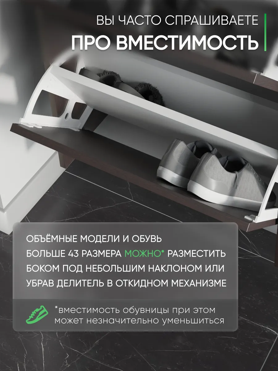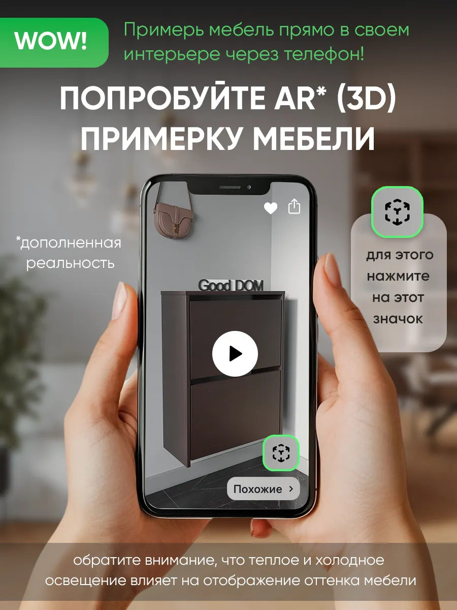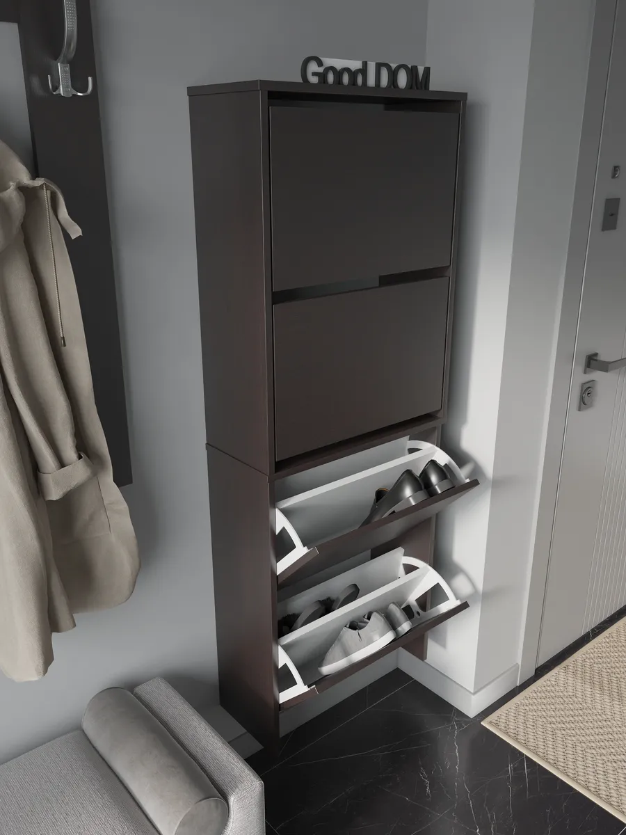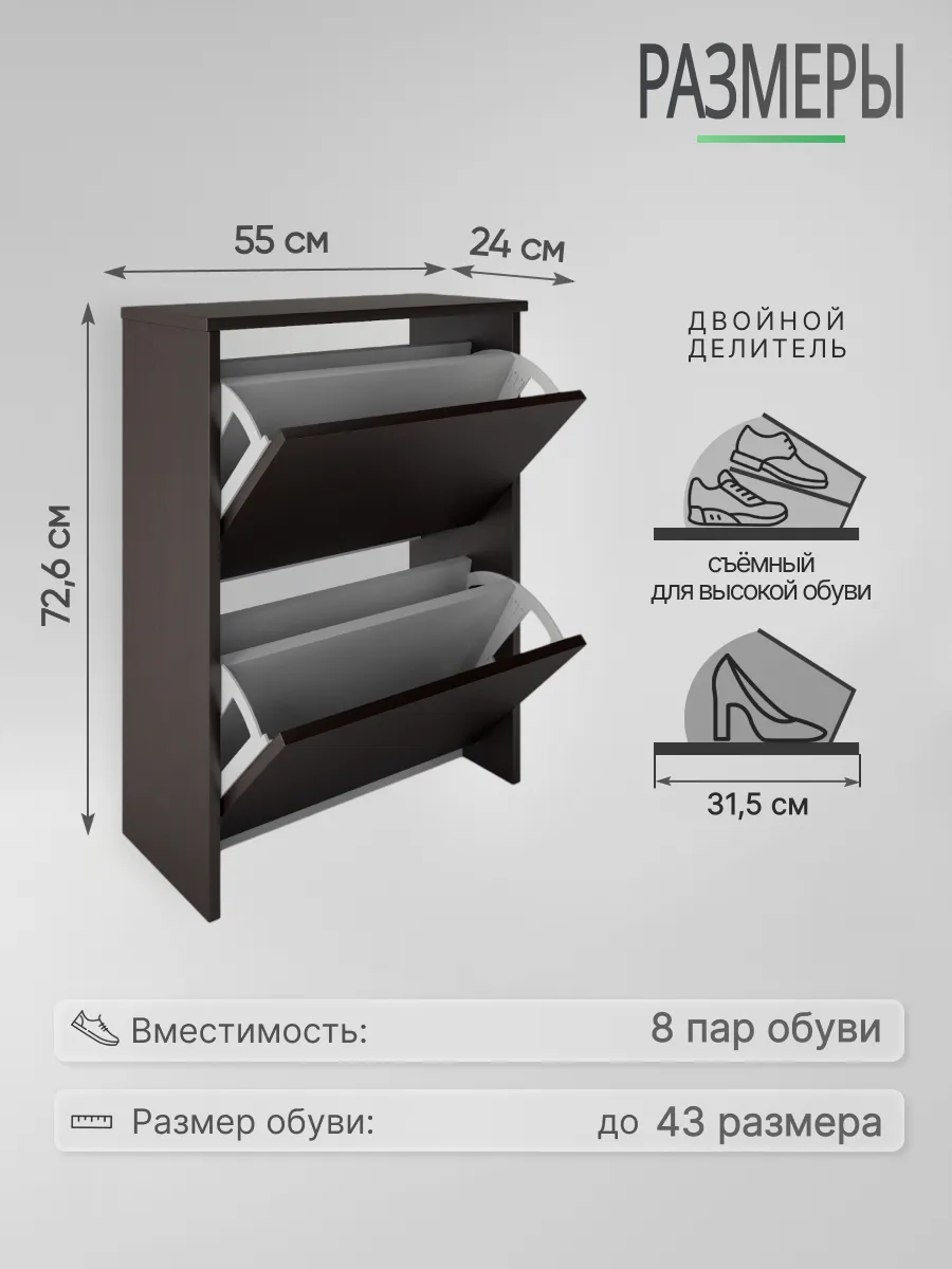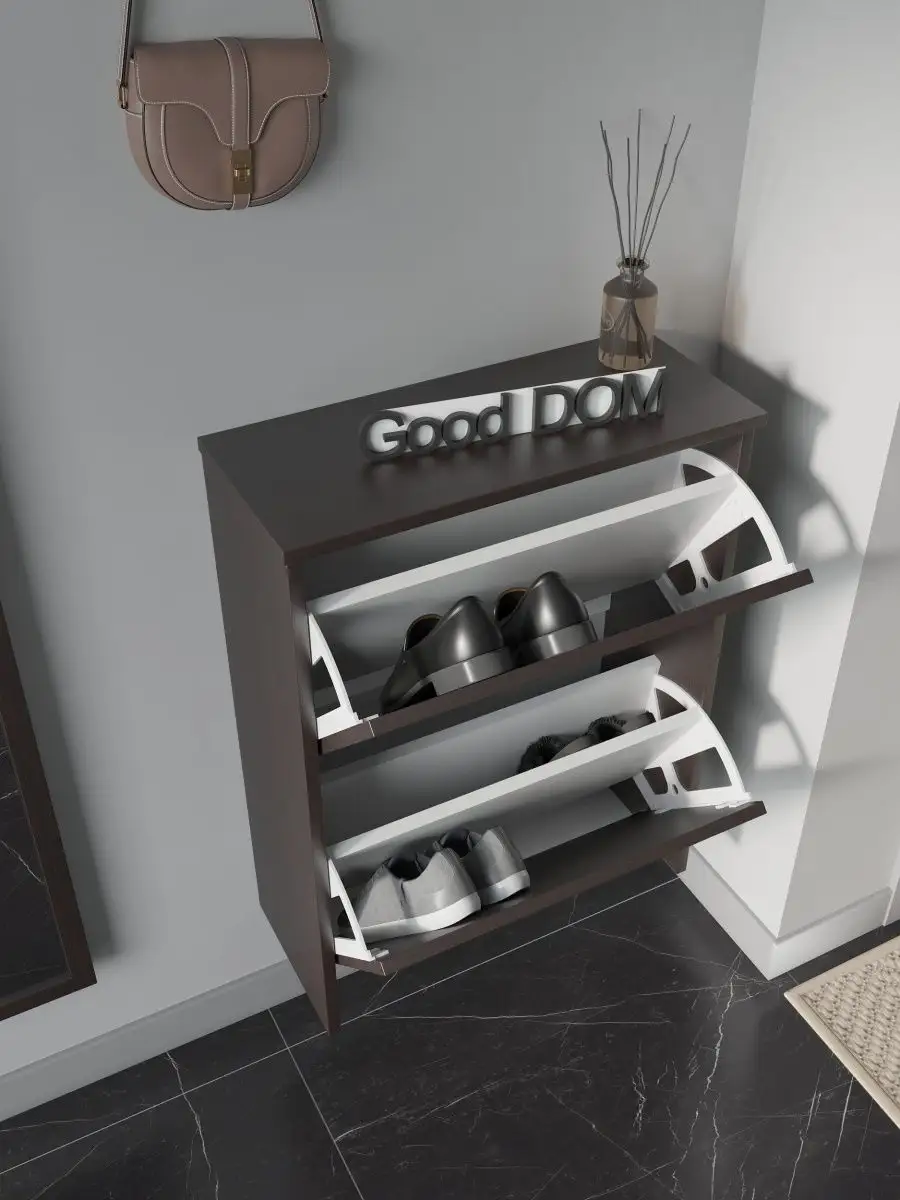 Обувница закрытая - удобная мебель в прихожую для функционального и удобного хранения обуви и вещей в коридоре. Тумба под обувь с откидными дверцами поможет сэкономить полезное пространство и не займет много места. Полка для обуви узкая влезет даже в маленький коридор, уместиться в небольшой гардеробной. Этажерка закрытая защитит обувь от попадания пыли, к тому же закрытая конструкция выглядит аккуратно и не перегружает пространство. Стеллаж из ЛДСП не ржавеет и при должном уходе прослужит долгие годы в отличие от металлической подставки и тем более пластиковой. Шкаф имеет поверхность сверху - верхнюю полку, на которой можно разместить зонты или ключи, прочие принадлежности и вещи, используемые в прихожей. Так же у навесной обувницы есть две откидные полки для обуви, разделенных на две секции, что позволяет в такой компактной обувнице уместить целых 8 пар обуви! Подвесная обувница выглядит стильно и компактно. Галошницу можно дополнить вешалкой и зеркалом и получить удобный комплект в прихожую. Обувная полочка легко заменит громоздкий комод, стенку или шкаф. В нашем ассортименте представлена другая мебель для прихожей (и не только) – вы можете легко посмотреть весь ассортимент, щелкнув на значок логотипа. Мы постоянно работаем над качеством нашей продукции, поэтому улучшили упаковку - наша усиленная упаковка защитит Вашу Обувницу при доставке от сломаных углов и сколов! Выбирая продукцию отечественного производителя Good Дом, все в Дом Вы обеспечиваете себя гарантией на продукцию сроком в 1 год, Вы выбираете качество и комфорт.