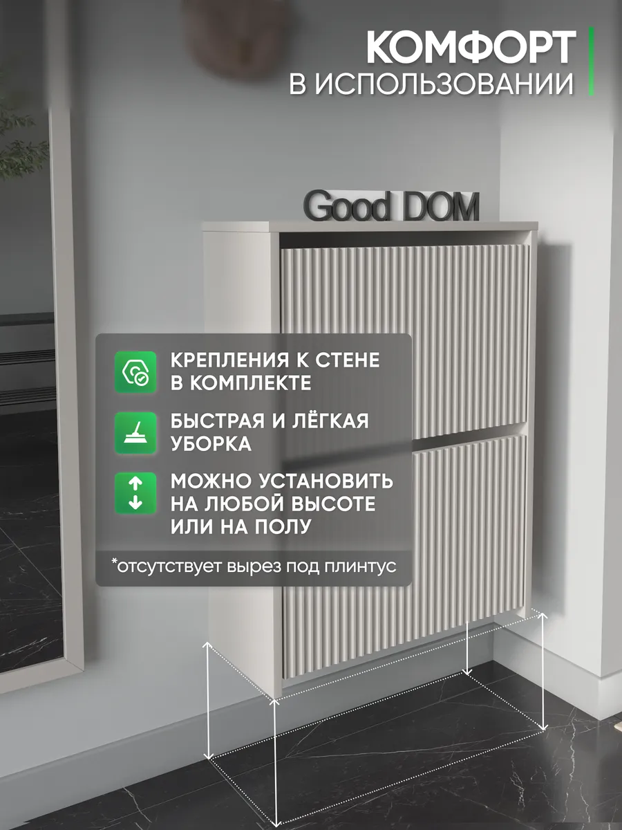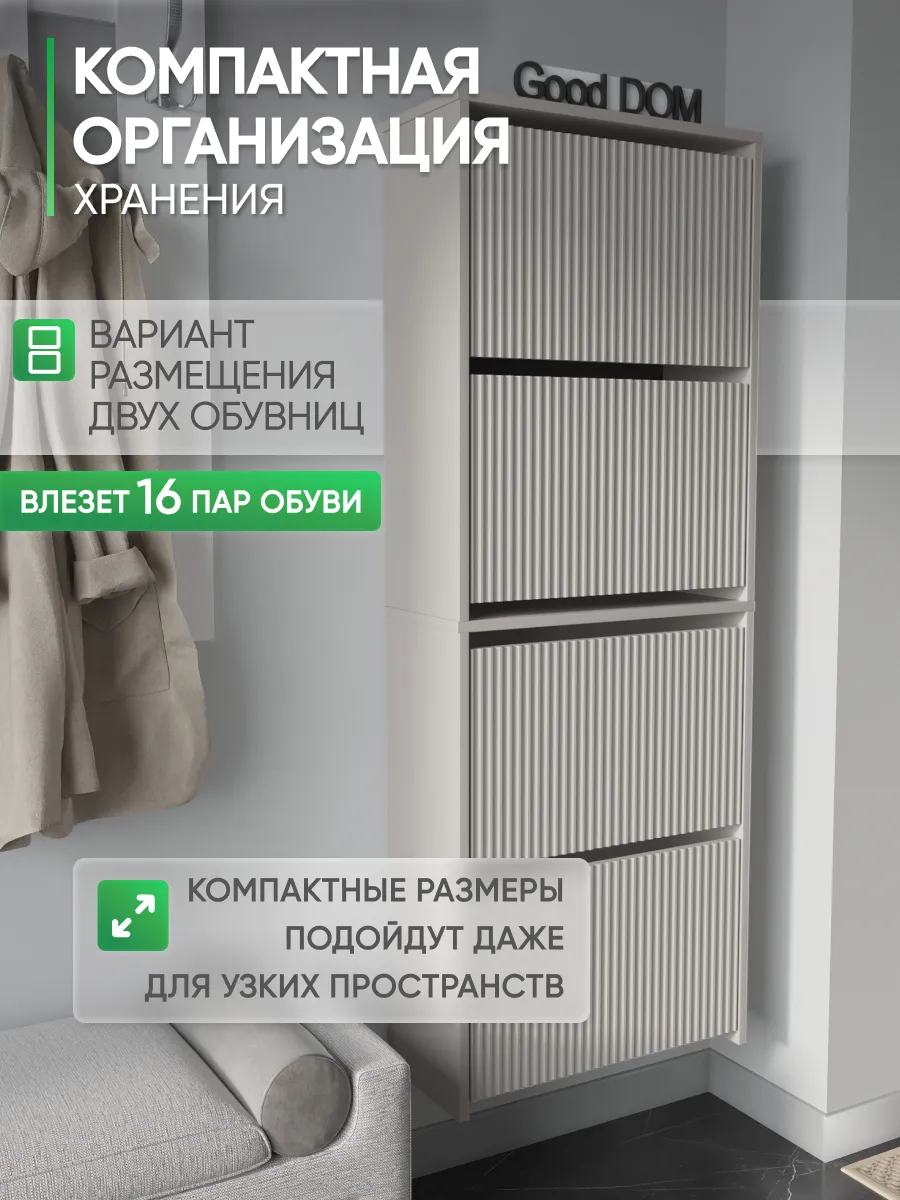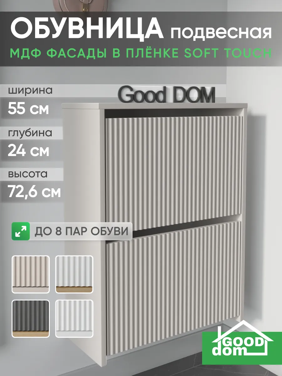 Обувница закрытая - удобная мебель в прихожую для функционального и удобного хранения обуви и вещей в коридоре. Тумба под обувь с откидными дверцами поможет сэкономить полезное пространство и не займет много места. Полка для обуви узкая влезет даже в маленький коридор, уместиться в небольшой гардеробной. Этажерка закрытая защитит обувь от попадания пыли, к тому же закрытая конструкция выглядит аккуратно и не перегружает пространство. Стеллаж из ЛДСП не ржавеет и при должном уходе прослужит долгие годы в отличие от металлической подставки и тем более пластиковой. Шкаф имеет поверхность сверху - верхнюю полку, на которой можно разместить зонты или ключи, прочие принадлежности и вещи, используемые в прихожей. Также у навесной обувницы есть две откидные полки для обуви, разделенных на две секции, что позволяет в такой компактной обувнице уместить целых 8 пар обуви! Подвесная обувница выглядит стильно и компактно. Галошницу можно дополнить вешалкой и зеркалом и получить удобный комплект в прихожую. Обувная полочка легко заменит громоздкий комод, стенку или шкаф. В нашем ассортименте представлена другая мебель для прихожей (и не только) – вы можете легко посмотреть весь ассортимент, щелкнув на значок логотипа. Мы постоянно работаем над качеством нашей продукции, поэтому улучшили упаковку - наша усиленная упаковка защитит Вашу Обувницу при доставке от сломаных углов и сколов! Выбирая продукцию отечественного производителя Good Дом, все в Дом Вы обеспечиваете себя гарантией на продукцию сроком в 1 год, Вы выбираете качество и комфорт.