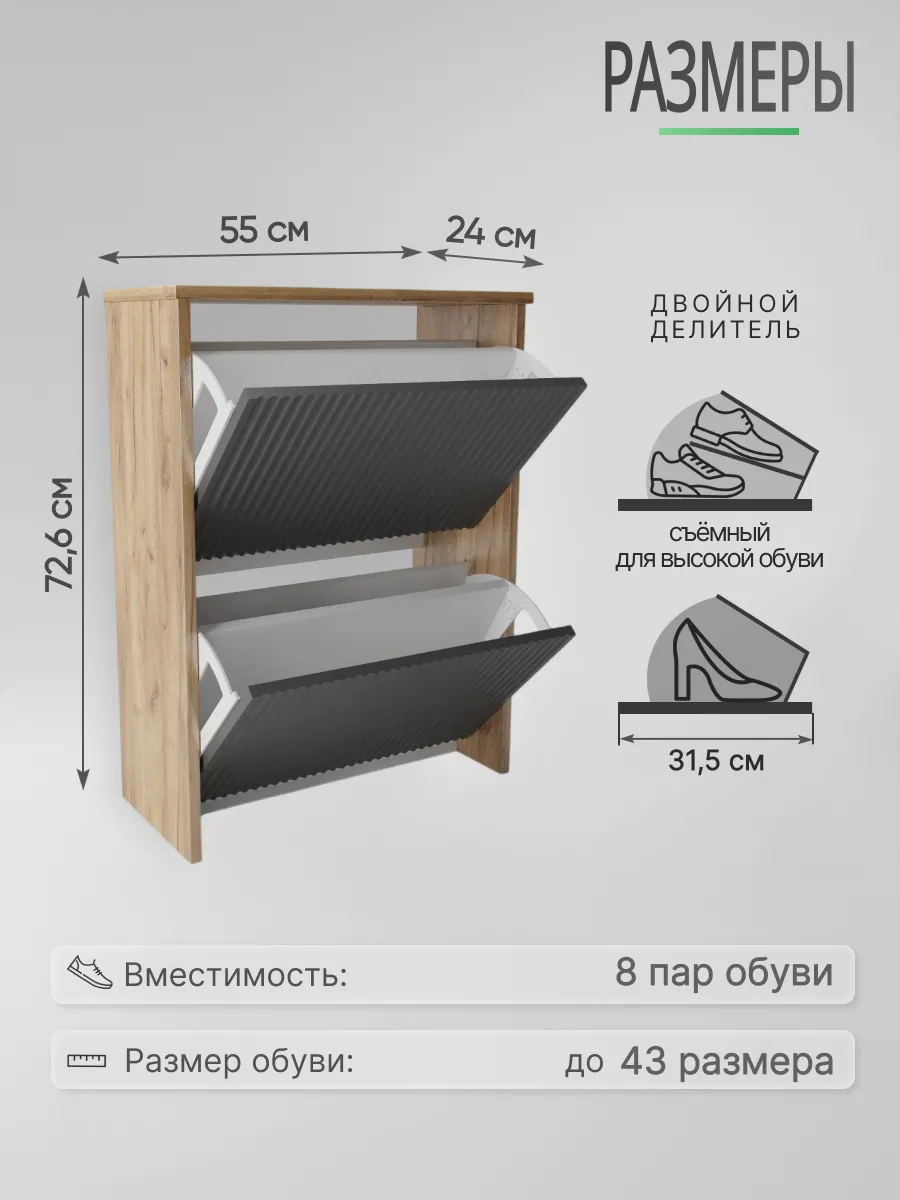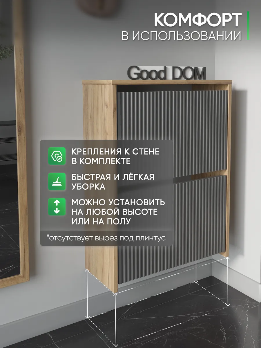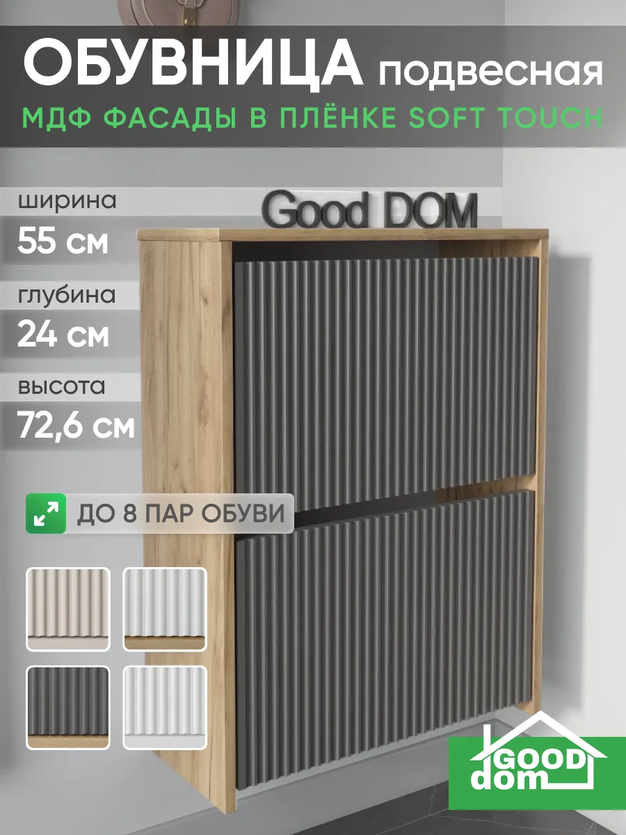 Обувница закрытая - удобная мебель в прихожую для функционального и удобного хранения обуви и вещей в коридоре. Тумба под обувь с откидными дверцами поможет сэкономить полезное пространство и не займет много места. Полка для обуви узкая влезет даже в маленький коридор, уместиться в небольшой гардеробной. Этажерка закрытая защитит обувь от попадания пыли, к тому же закрытая конструкция выглядит аккуратно и не перегружает пространство. Стеллаж из ЛДСП не ржавеет и при должном уходе прослужит долгие годы в отличие от металлической подставки и тем более пластиковой. Шкаф имеет поверхность сверху - верхнюю полку, на которой можно разместить зонты или ключи, прочие принадлежности и вещи, используемые в прихожей. Также у навесной обувницы есть две откидные полки для обуви, разделенных на две секции, что позволяет в такой компактной обувнице уместить целых 8 пар обуви! Подвесная обувница выглядит стильно и компактно. Галошницу можно дополнить вешалкой и зеркалом и получить удобный комплект в прихожую. Обувная полочка легко заменит громоздкий комод, стенку или шкаф. В нашем ассортименте представлена другая мебель для прихожей (и не только) – вы можете легко посмотреть весь ассортимент, щелкнув на значок логотипа. Мы постоянно работаем над качеством нашей продукции, поэтому улучшили упаковку - наша усиленная упаковка защитит Вашу Обувницу при доставке от сломаных углов и сколов! Выбирая продукцию отечественного производителя Good Дом, все в Дом Вы обеспечиваете себя гарантией на продукцию сроком в 1 год, Вы выбираете качество и комфорт.