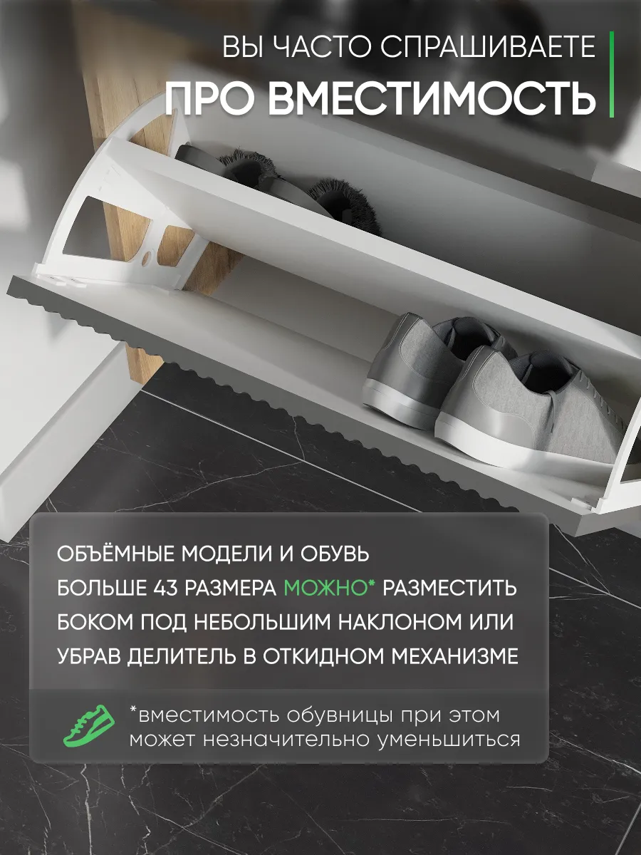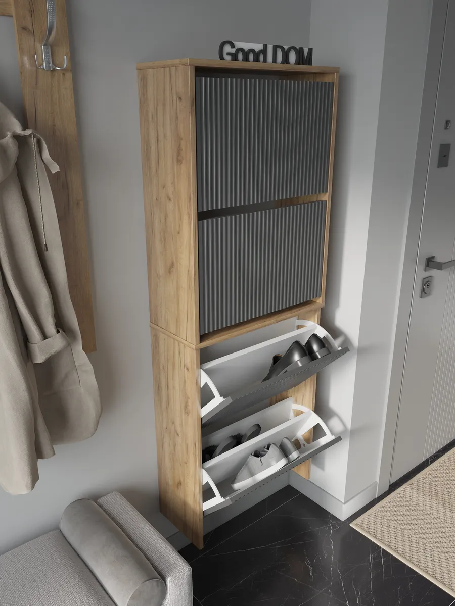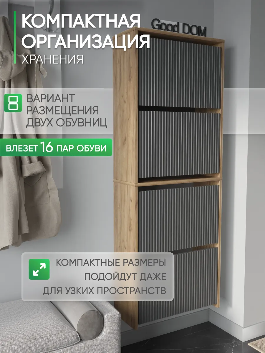 Обувница закрытая - удобная мебель в прихожую для функционального и удобного хранения обуви и вещей в коридоре. Тумба под обувь с откидными дверцами поможет сэкономить полезное пространство и не займет много места. Полка для обуви узкая влезет даже в маленький коридор, уместиться в небольшой гардеробной. Этажерка закрытая защитит обувь от попадания пыли, к тому же закрытая конструкция выглядит аккуратно и не перегружает пространство. Стеллаж из ЛДСП не ржавеет и при должном уходе прослужит долгие годы в отличие от металлической подставки и тем более пластиковой. Шкаф имеет поверхность сверху - верхнюю полку, на которой можно разместить зонты или ключи, прочие принадлежности и вещи, используемые в прихожей. Также у навесной обувницы есть две откидные полки для обуви, разделенных на две секции, что позволяет в такой компактной обувнице уместить целых 8 пар обуви! Подвесная обувница выглядит стильно и компактно. Галошницу можно дополнить вешалкой и зеркалом и получить удобный комплект в прихожую. Обувная полочка легко заменит громоздкий комод, стенку или шкаф. В нашем ассортименте представлена другая мебель для прихожей (и не только) – вы можете легко посмотреть весь ассортимент, щелкнув на значок логотипа. Мы постоянно работаем над качеством нашей продукции, поэтому улучшили упаковку - наша усиленная упаковка защитит Вашу Обувницу при доставке от сломаных углов и сколов! Выбирая продукцию отечественного производителя Good Дом, все в Дом Вы обеспечиваете себя гарантией на продукцию сроком в 1 год, Вы выбираете качество и комфорт.