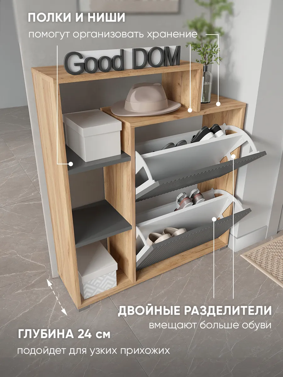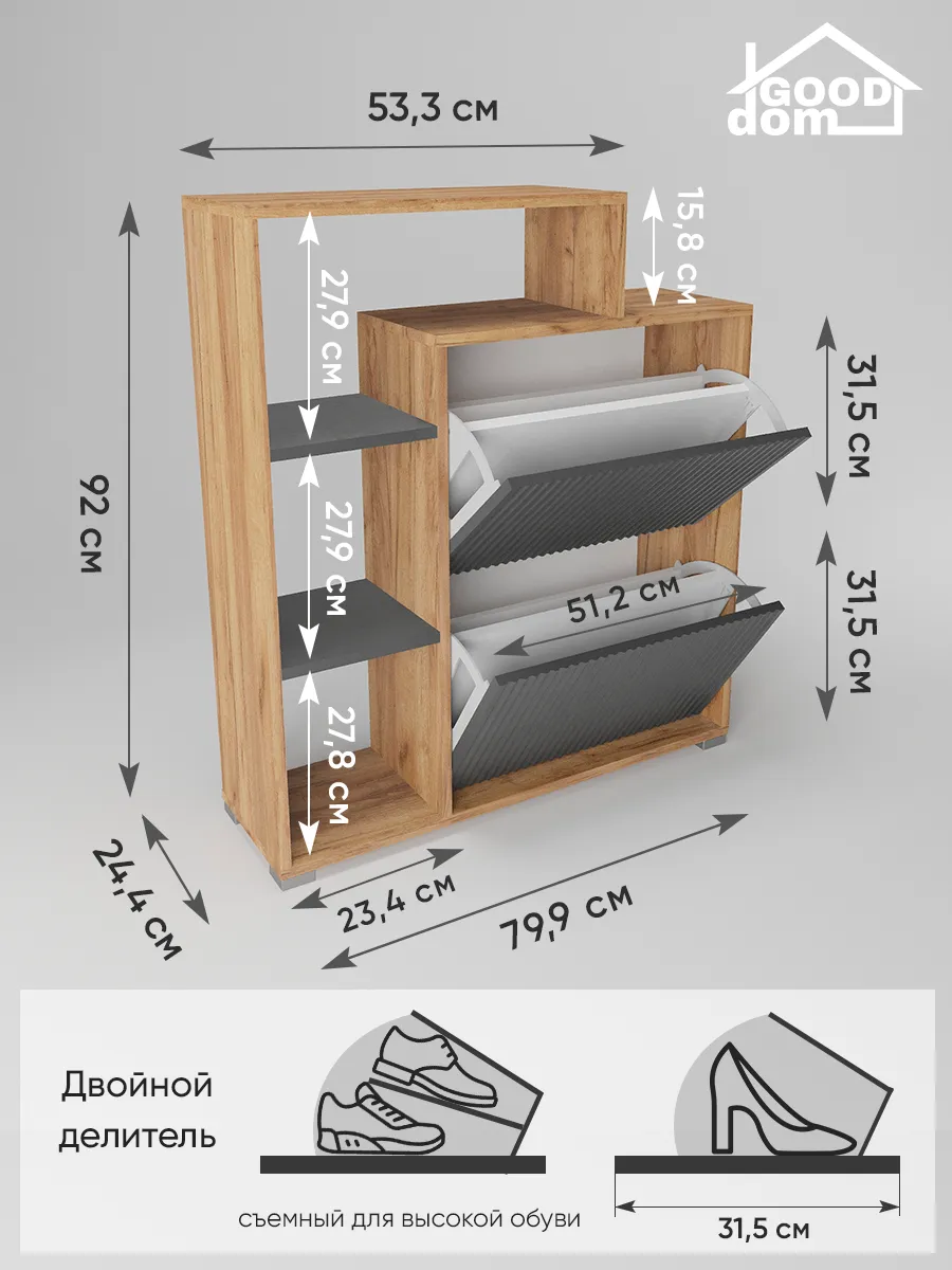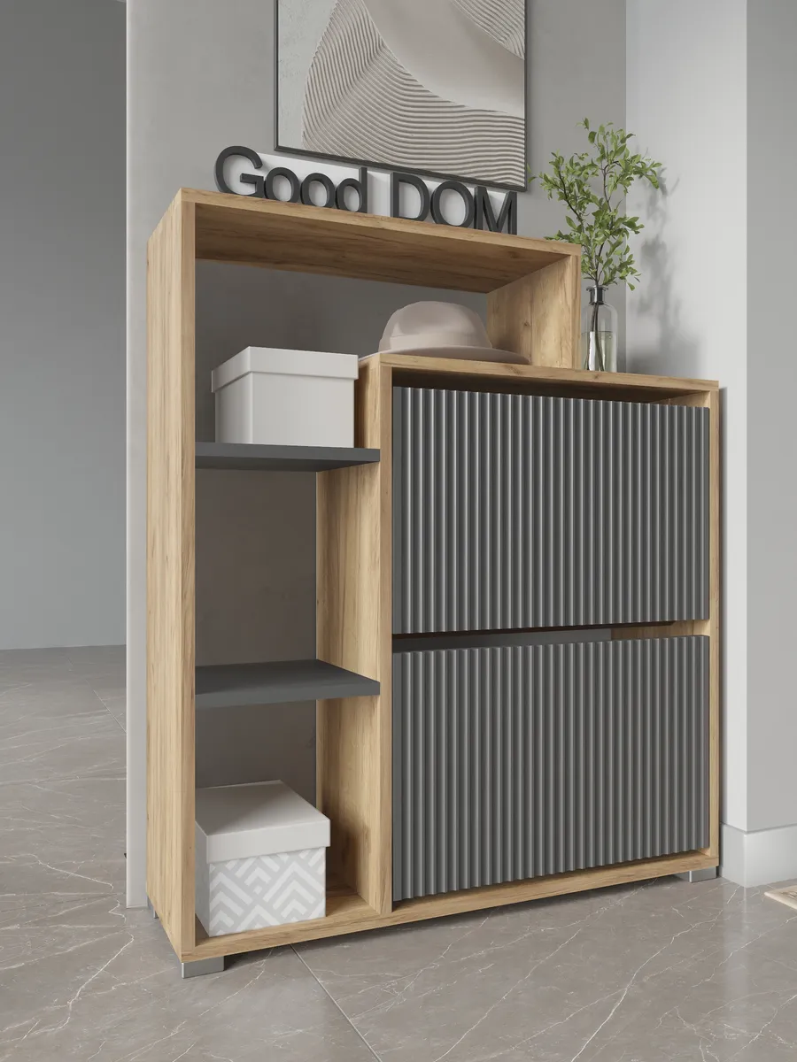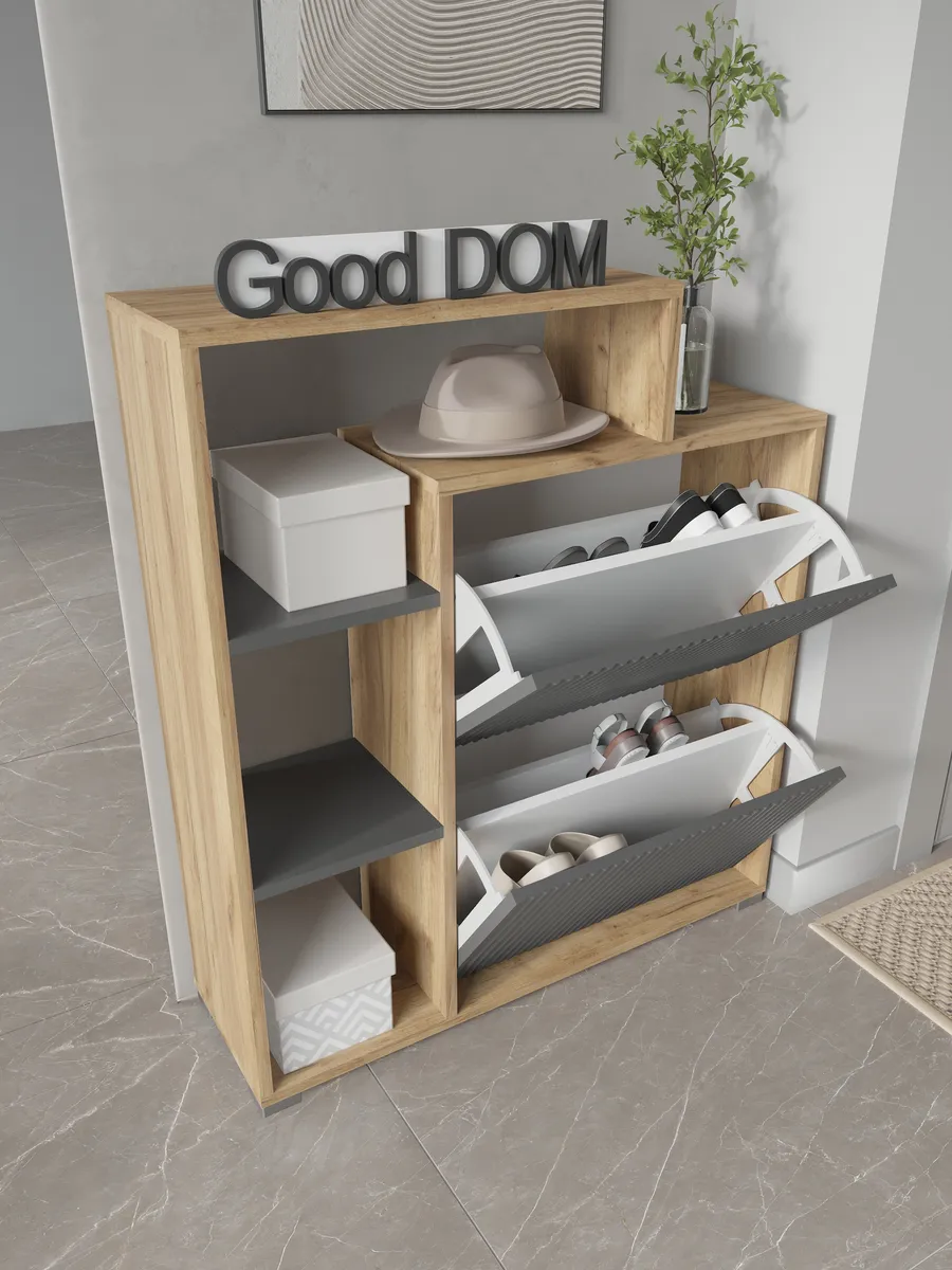 Складной и узкий шкаф отлично подходит для хранения не только обуви, но и мелких предметов — сумок, ложек и других нужных вещей. Столешница сверху служит удобной стойкой или подставкой для декора, а высокая конструкция с ножками облегчает уборку под тумбой. Готовая к сборке мебель сделана из качественного дерева и отличается прочностью.