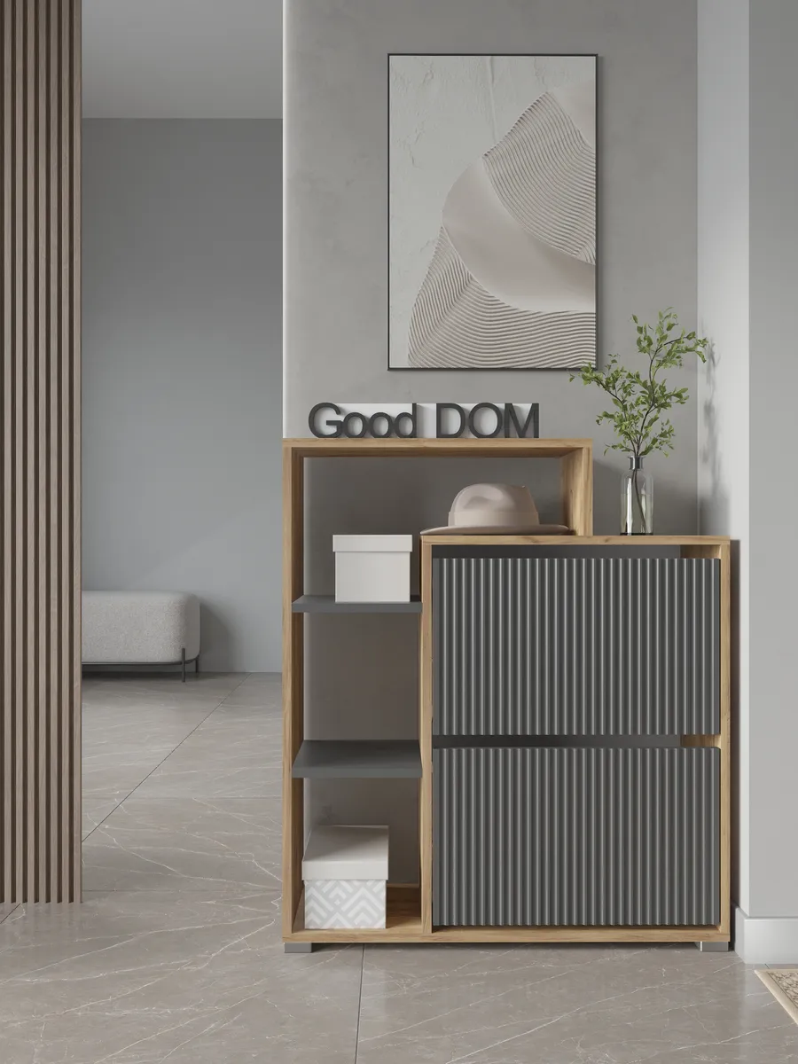Этажерка с ящиками и полками обеспечивает функциональное хранение, уступая место компактной, но вместительной обувной стенке.