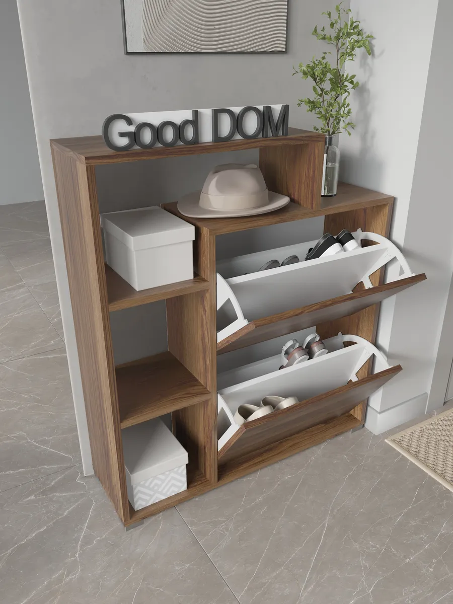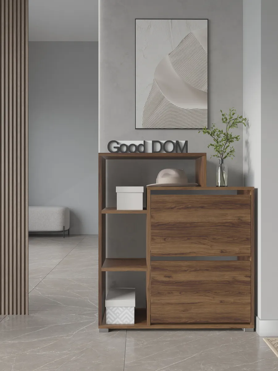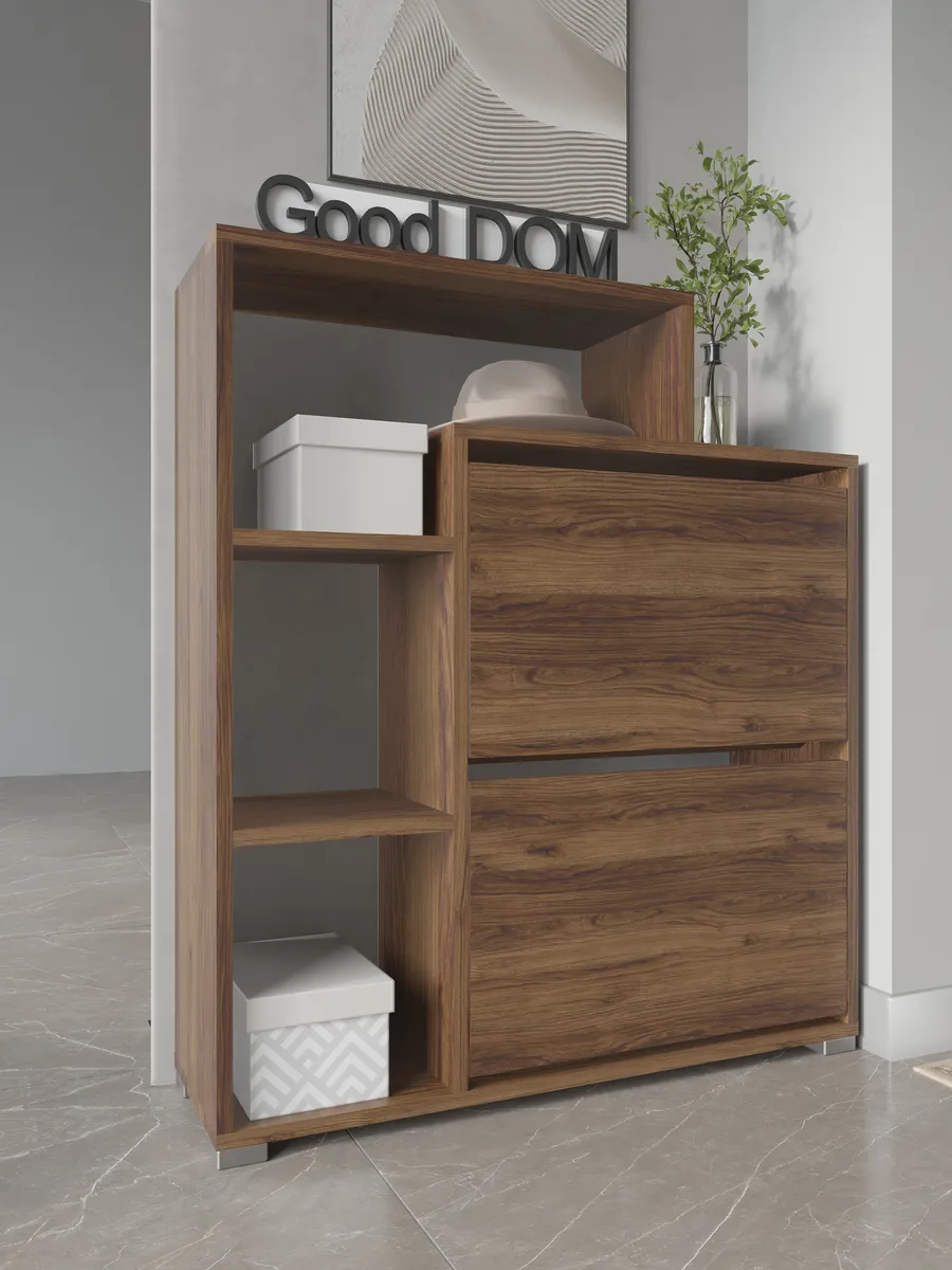 Обувница закрытая с откидными полками "Вдохновение" - идеальное решение для вашего коридора или прихожей. Функциональная обувница с полками поможет компактно разместить не только обувь, но и головные уборы аксессуары и даже декор. Закрытая обувница-тумба с дверкой защитит вашу обувь от пыли и грязи. Ножки исключат повреждение напольного покрытия и обеспечат устойчивость. Узкая обувница деревянная подойдет даже для малогабаритной комнаты и сэкономит полезное пространство квартиры или дома. Обувница в прихожую имеет два отделения с откидной полкой и открытые полки сбоку. Кроме того, сверху есть широкая столешница полки для обуви подойдет для ключей, бижутерии или сумок. Галошница в универсальном стиле подойдет под любой лофт интерьер, а варианты расцветок помогут подобрать шкаф для обуви под ваш существующий интерьер. Благодаря своим небольшим габаритам, тумба может быть установлена практически в любом помещении: на балконе, в офисе, на даче. Вместе с тем, мини комод может использоваться не только для хранения обуви. Вы можете использовать ее в качестве органайзера для мелочей, стеллажа для книг или аксессуаров, складной стойки для офисных принадлежностей или даже шкафчик для полотенец в бане. Обувная полочка легко заменит громоздкую в прихожей мебель в коридор, комод стенку или шкаф.