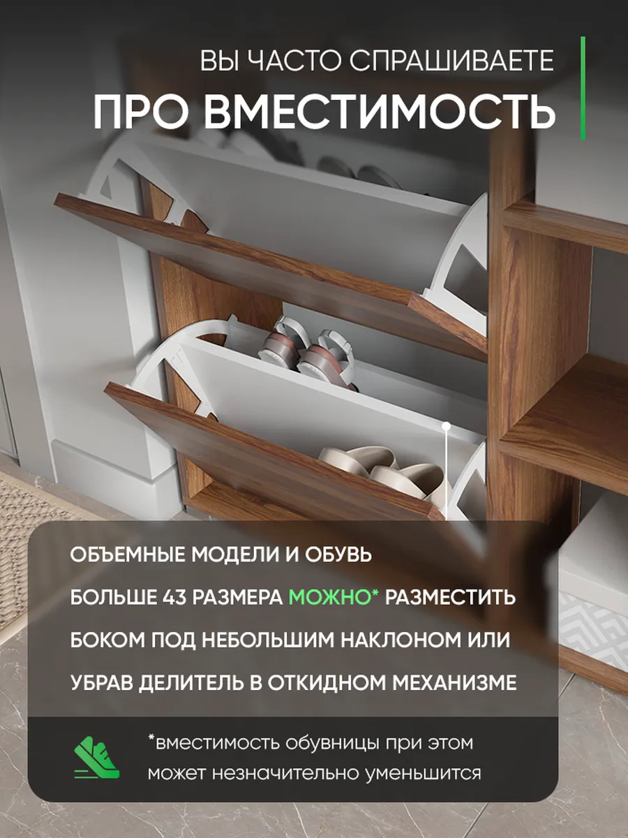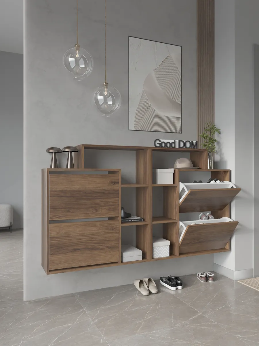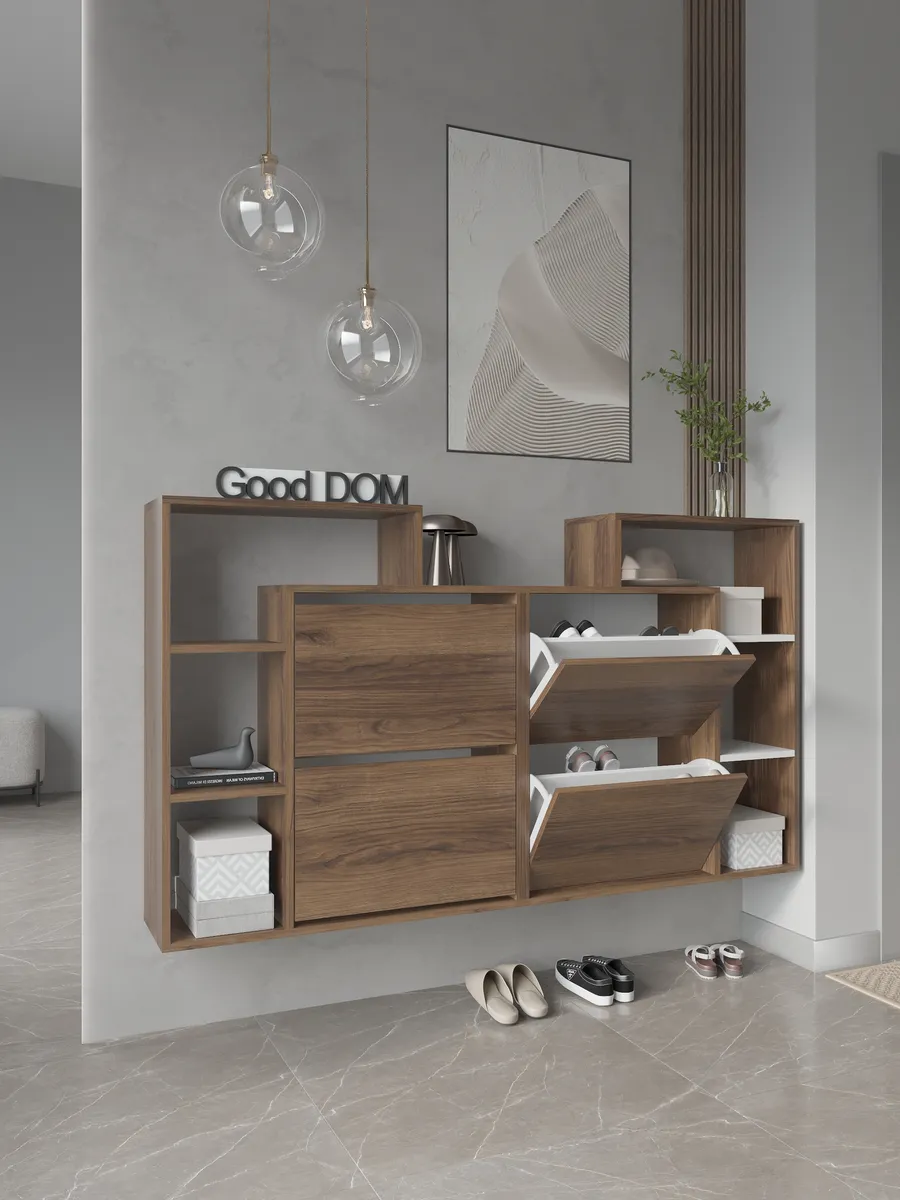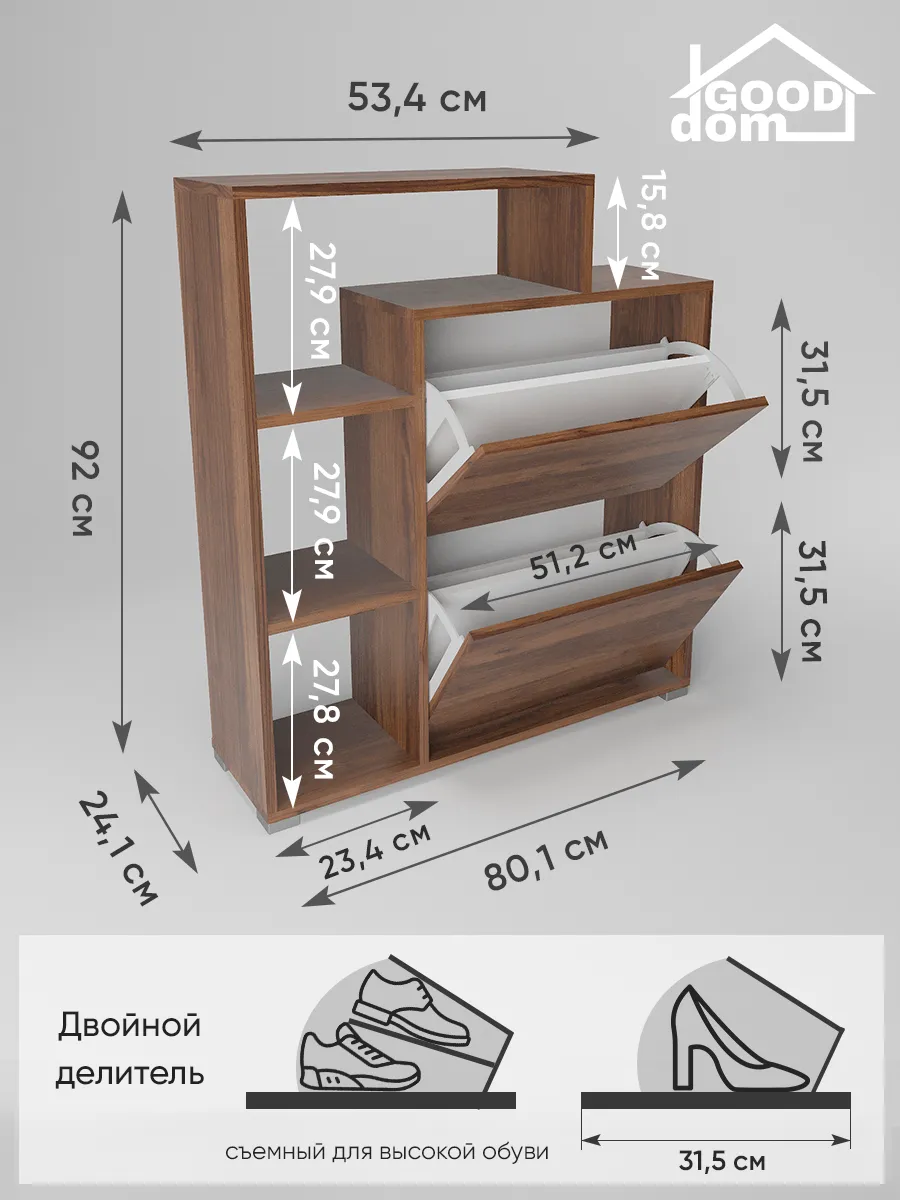 Обувница закрытая с откидными полками "Вдохновение" - идеальное решение для вашего коридора или прихожей. Функциональная обувница с полками поможет компактно разместить не только обувь, но и головные уборы аксессуары и даже декор. Закрытая обувница-тумба с дверкой защитит вашу обувь от пыли и грязи. Ножки исключат повреждение напольного покрытия и обеспечат устойчивость. Узкая обувница деревянная подойдет даже для малогабаритной комнаты и сэкономит полезное пространство квартиры или дома. Обувница в прихожую имеет два отделения с откидной полкой и открытые полки сбоку. Кроме того, сверху есть широкая столешница полки для обуви подойдет для ключей, бижутерии или сумок. Галошница в универсальном стиле подойдет под любой лофт интерьер, а варианты расцветок помогут подобрать шкаф для обуви под ваш существующий интерьер. Благодаря своим небольшим габаритам, тумба может быть установлена практически в любом помещении: на балконе, в офисе, на даче. Вместе с тем, мини комод может использоваться не только для хранения обуви. Вы можете использовать ее в качестве органайзера для мелочей, стеллажа для книг или аксессуаров, складной стойки для офисных принадлежностей или даже шкафчик для полотенец в бане. Обувная полочка легко заменит громоздкую в прихожей мебель в коридор, комод стенку или шкаф.