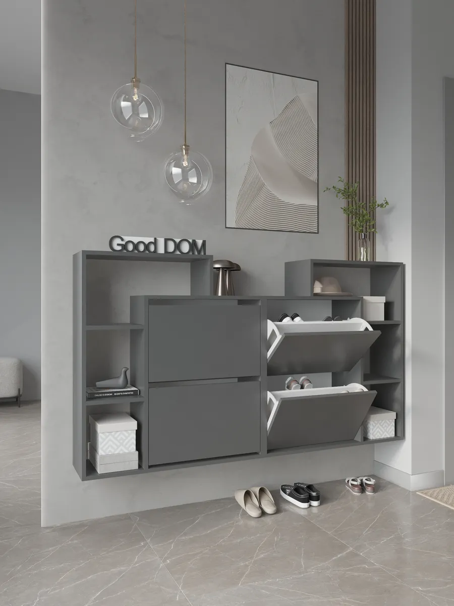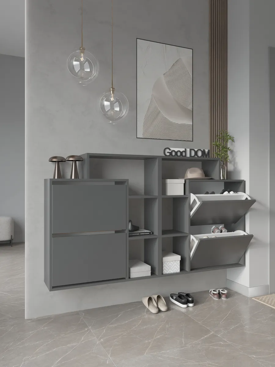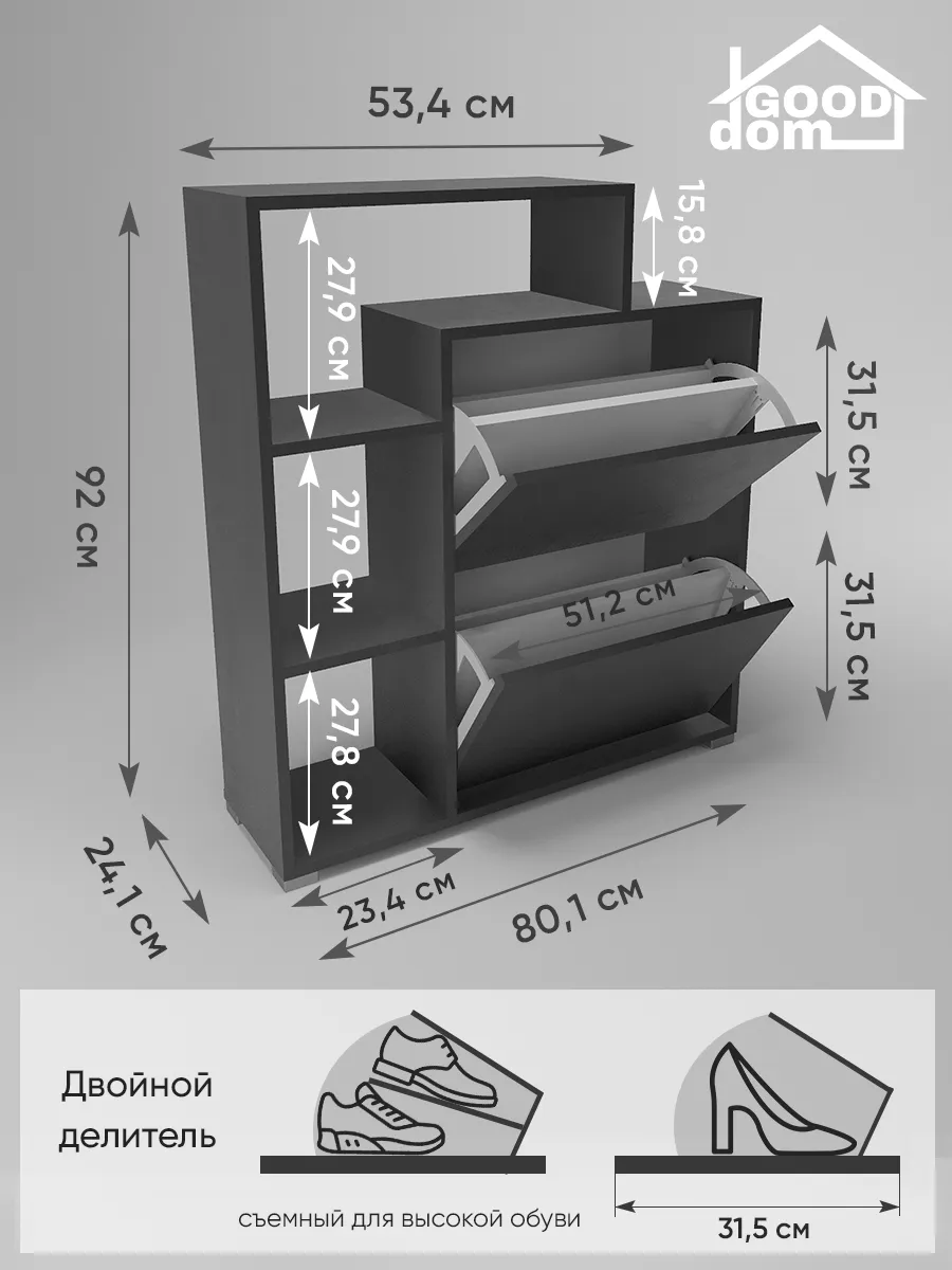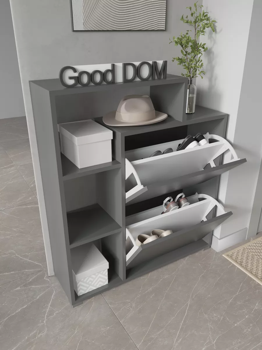 Обувница закрытая с откидными полками "Вдохновение" - идеальное решение для вашего коридора или прихожей. Функциональная обувница с полками поможет компактно разместить не только обувь, но и головные уборы аксессуары и даже декор. Закрытая обувница-тумба с дверкой защитит вашу обувь от пыли и грязи. Ножки исключат повреждение напольного покрытия и обеспечат устойчивость. Узкая обувница деревянная подойдет даже для малогабаритной комнаты и сэкономит полезное пространство квартиры или дома. Обувница в прихожую имеет два отделения с откидной полкой и открытые полки сбоку. Кроме того, сверху есть широкая столешница полки для обуви подойдет для ключей, бижутерии или сумок. Галошница в универсальном стиле подойдет под любой лофт интерьер, а варианты расцветок помогут подобрать шкаф для обуви под ваш существующий интерьер. Благодаря своим небольшим габаритам, тумба может быть установлена практически в любом помещении: на балконе, в офисе, на даче. Вместе с тем, мини комод может использоваться не только для хранения обуви. Вы можете использовать ее в качестве органайзера для мелочей, стеллажа для книг или аксессуаров, складной стойки для офисных принадлежностей или даже шкафчик для полотенец в бане. Обувная полочка легко заменит громоздкую в прихожей мебель в коридор, комод стенку или шкаф.