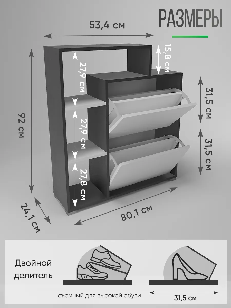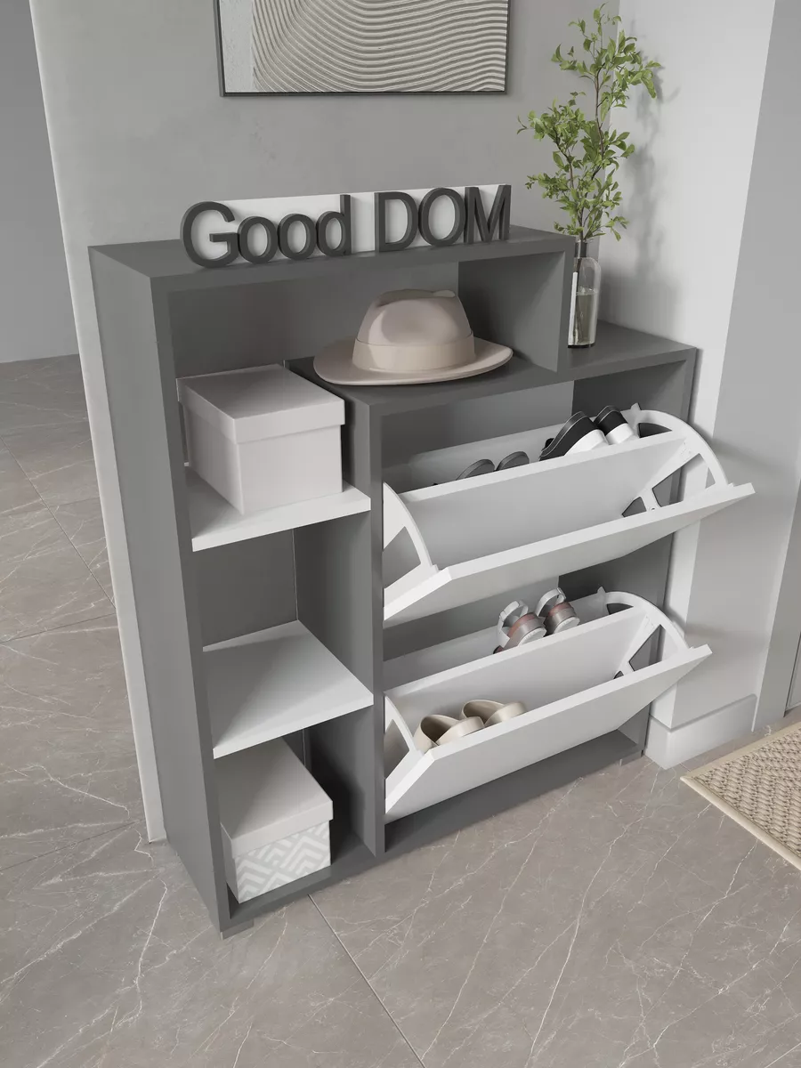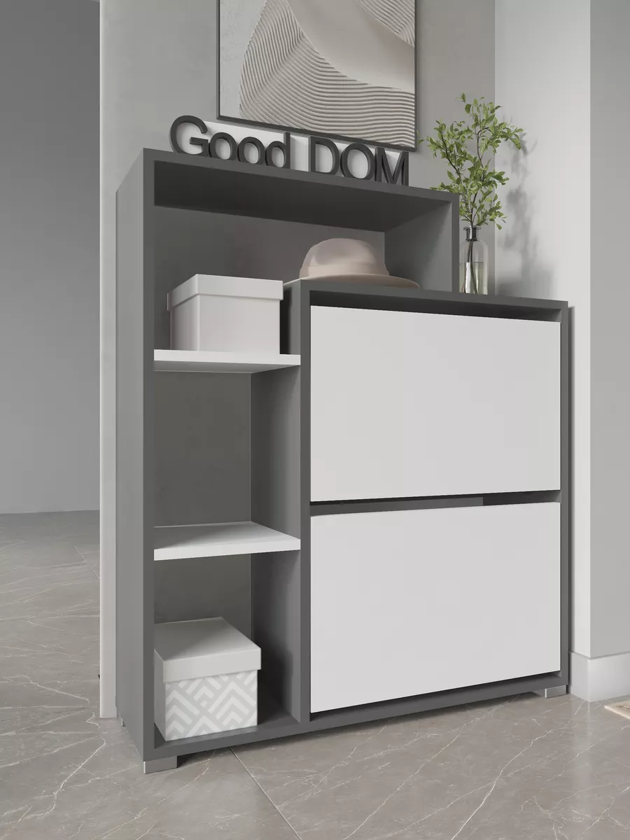 Обувница закрытая с откидными полками "Вдохновение" - идеальное решение для вашего коридора или прихожей. Функциональная обувница с полками поможет компактно разместить не только обувь, но и головные уборы аксессуары и даже декор. Закрытая обувница-тумба с дверкой защитит вашу обувь от пыли и грязи. Ножки исключат повреждение напольного покрытия и обеспечат устойчивость. Узкая обувница деревянная подойдет даже для малогабаритной комнаты и сэкономит полезное пространство квартиры или дома. Обувница в прихожую имеет два отделения с откидной полкой и открытые полки сбоку. Кроме того, сверху есть широкая столешница полки для обуви подойдет для ключей, бижутерии или сумок. Галошница в универсальном стиле подойдет под любой лофт интерьер, а варианты расцветок помогут подобрать шкаф для обуви под ваш существующий интерьер. Благодаря своим небольшим габаритам, тумба может быть установлена практически в любом помещении: на балконе, в офисе, на даче. Вместе с тем, мини комод может использоваться не только для хранения обуви. Вы можете использовать ее в качестве органайзера для мелочей, стеллажа для книг или аксессуаров, складной стойки для офисных принадлежностей или даже шкафчик для полотенец в бане. Обувная полочка легко заменит громоздкую в прихожей мебель в коридор, комод стенку или шкаф.