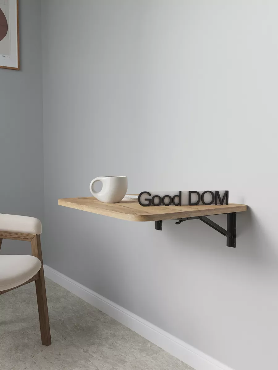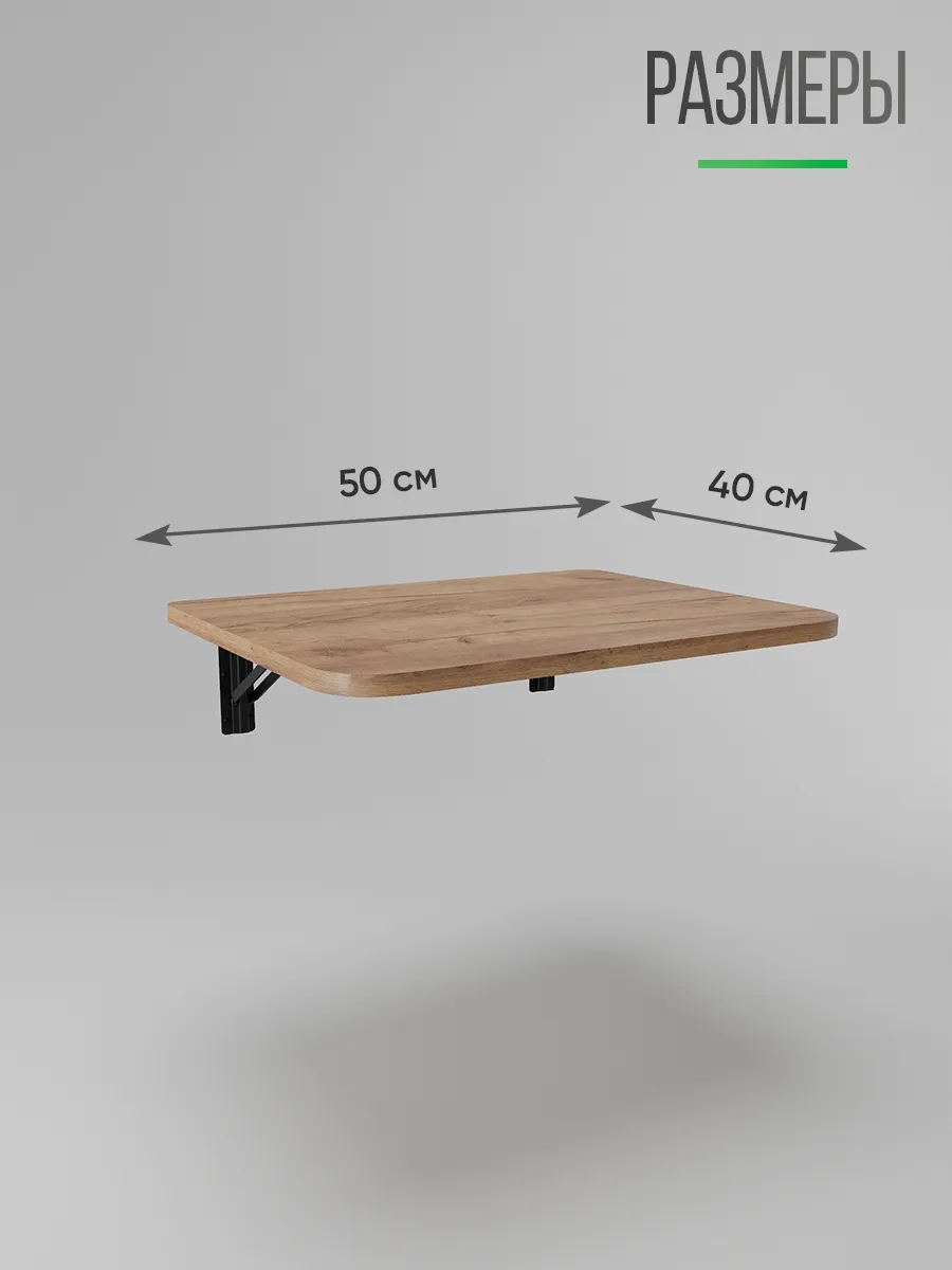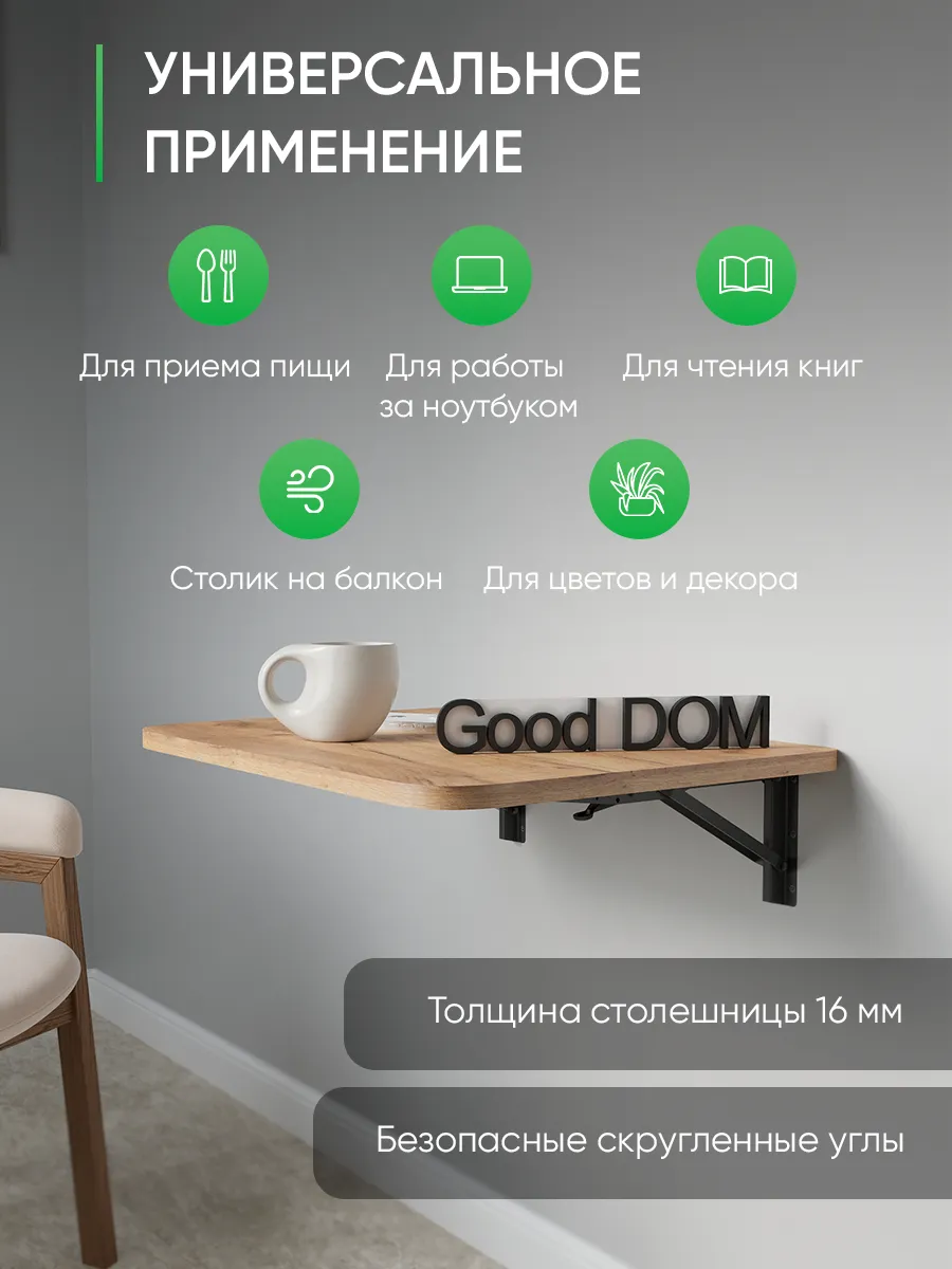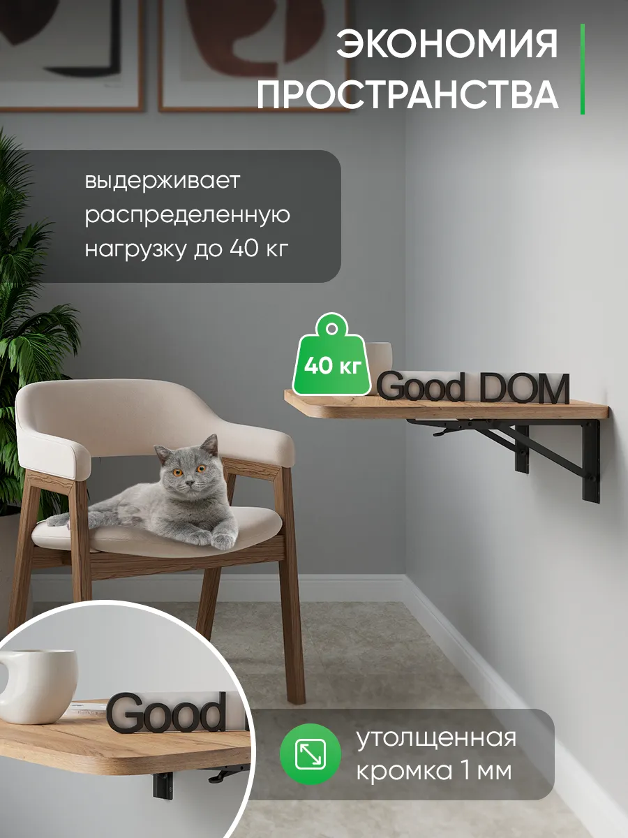 Откидной настенный стол, недорогой раскладной столик, стол-трансформер, от отечественного производителя Good-дом сэкономит пространство в квартире. Благодаря надежному креплению из стали, стол мини книжка на стену выдерживает нагрузку до 40 кг и может служить как письменный или рабочий стол и даже учебной партой. Отлично будет смотреться в качестве стола раздвижного на кухне, стола журнального в мастерской, стола раскладного в кабинете маникюра и стола письменного на балконе. Откидной навесной стол из ЛДСП отличается надежностью и лаконичным дизайном. Стол-трансформер, стол откидной мини-книжка с настенным креплением отлично подойдет как мебель на балкон, для гостиной, в кабинет, для кухни. Закажите товар и уже завтра получите удобный, крепкий атрибут мебели! Товар сертифицирован, соответствует ГОСТам, действует гарантия от производителя. В сложенном виде от стены до столешницы 3 см. + столешница 1,6 см