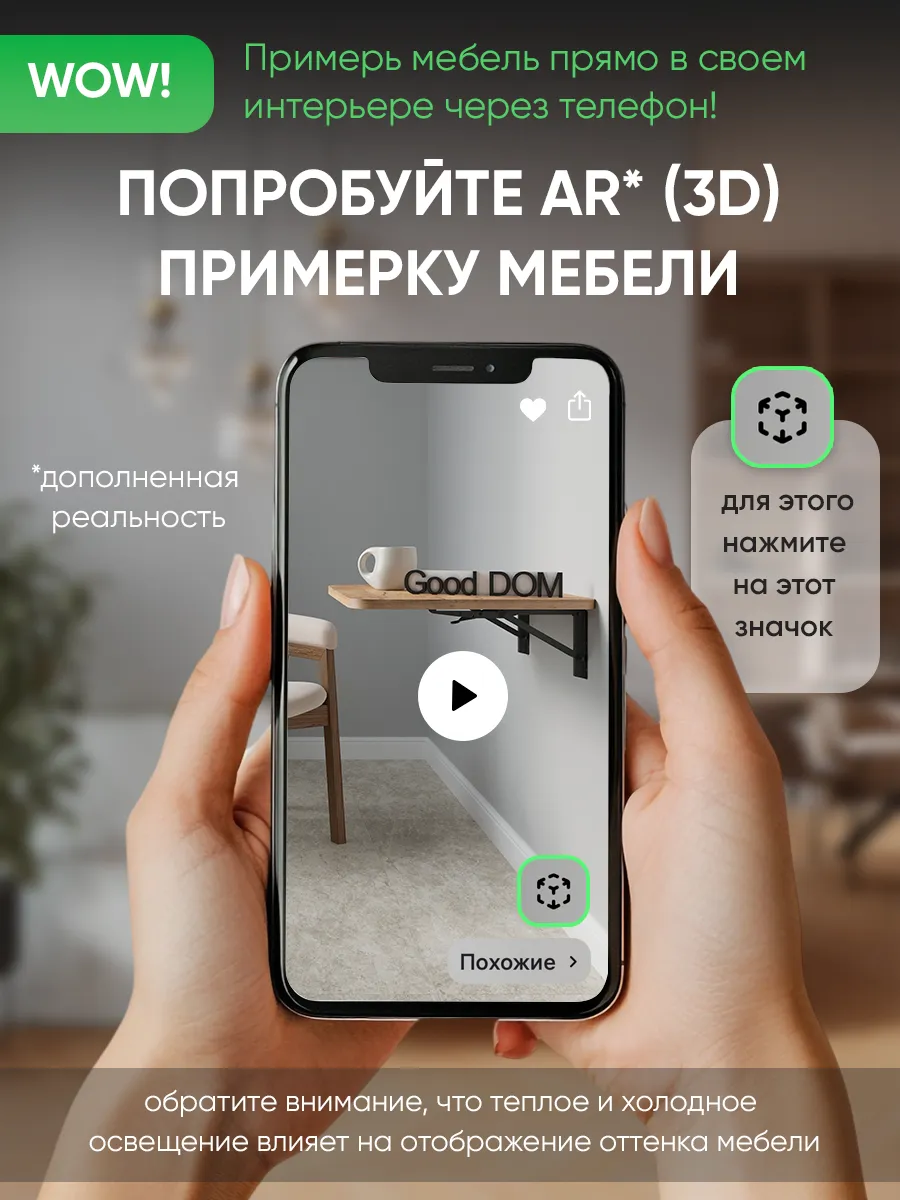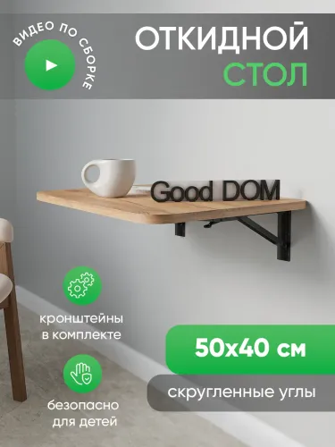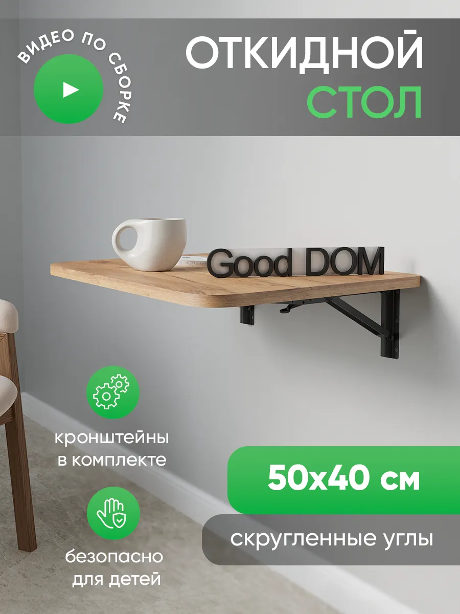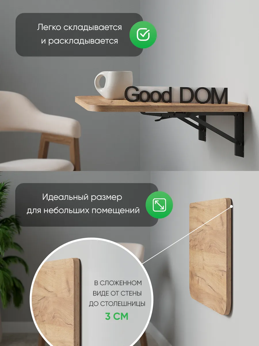Откидной настенный стол, недорогой раскладной столик, стол-трансформер, от отечественного производителя Good-дом сэкономит пространство в квартире. Благодаря надежному креплению из стали, стол мини книжка на стену выдерживает нагрузку до 40 кг и может служить как письменный или рабочий стол и даже учебной партой. Отлично будет смотреться в качестве стола раздвижного на кухне, стола журнального в мастерской, стола раскладного в кабинете маникюра и стола письменного на балконе. Откидной навесной стол из ЛДСП отличается надежностью и лаконичным дизайном. Стол-трансформер, стол откидной мини-книжка с настенным креплением отлично подойдет как мебель на балкон, для гостиной, в кабинет, для кухни. Закажите товар и уже завтра получите удобный, крепкий атрибут мебели! Товар сертифицирован, соответствует ГОСТам, действует гарантия от производителя. В сложенном виде от стены до столешницы 3 см. + столешница 1,6 см