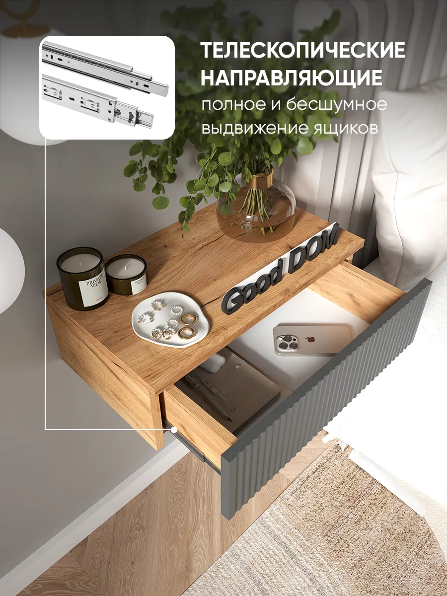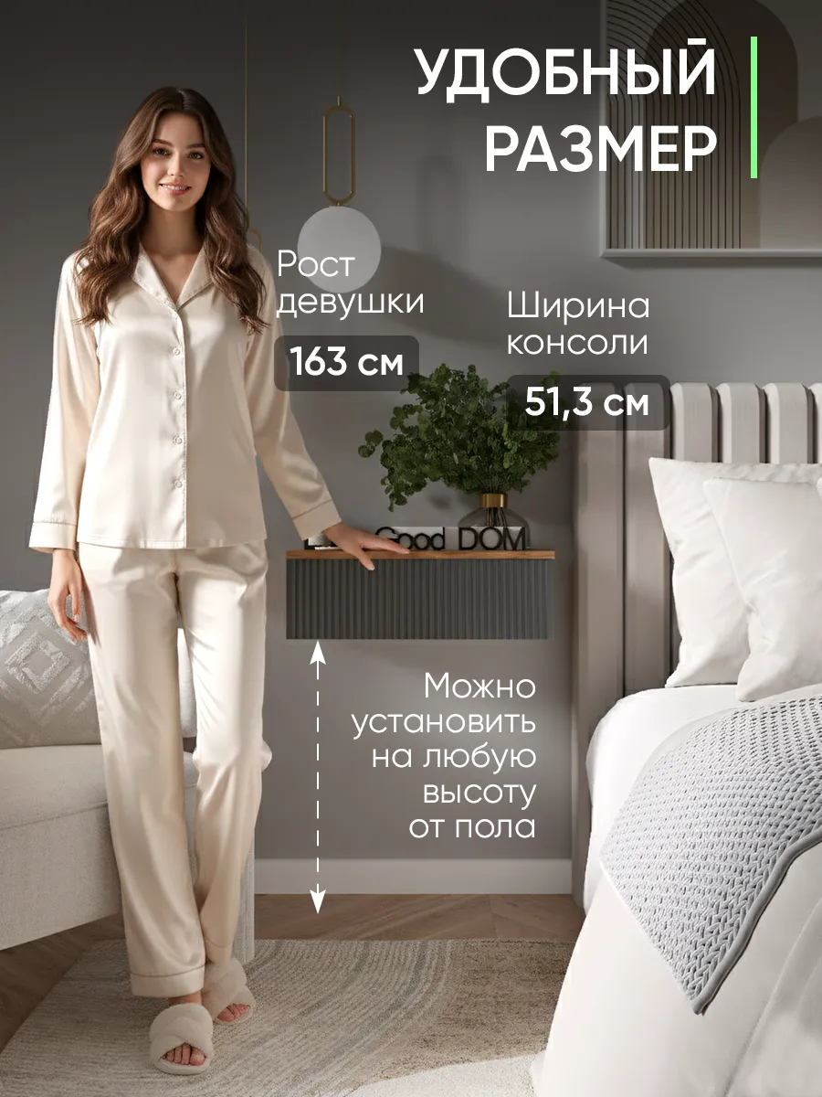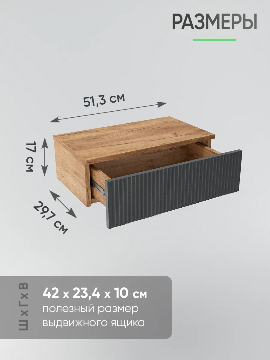 Эта подвесная тумба — универсальный элемент мебели, идеально подходящий для оформления интерьера в стиле лофт, гранд или вотан. Навесной аксессуар обеспечивает удобное хранение и экономит пространство в комнате, будь то гостиная, прихожая, спальня или коридор. Консольный дизайн позволяет разместить тумбочку на стене, создавая эффект парения и визуально облегчая интерьер. Модель выполнена из качественного дуба с рифленым фасадом, что придает изделию выразительность и подчеркивает натуральную текстуру дерева.