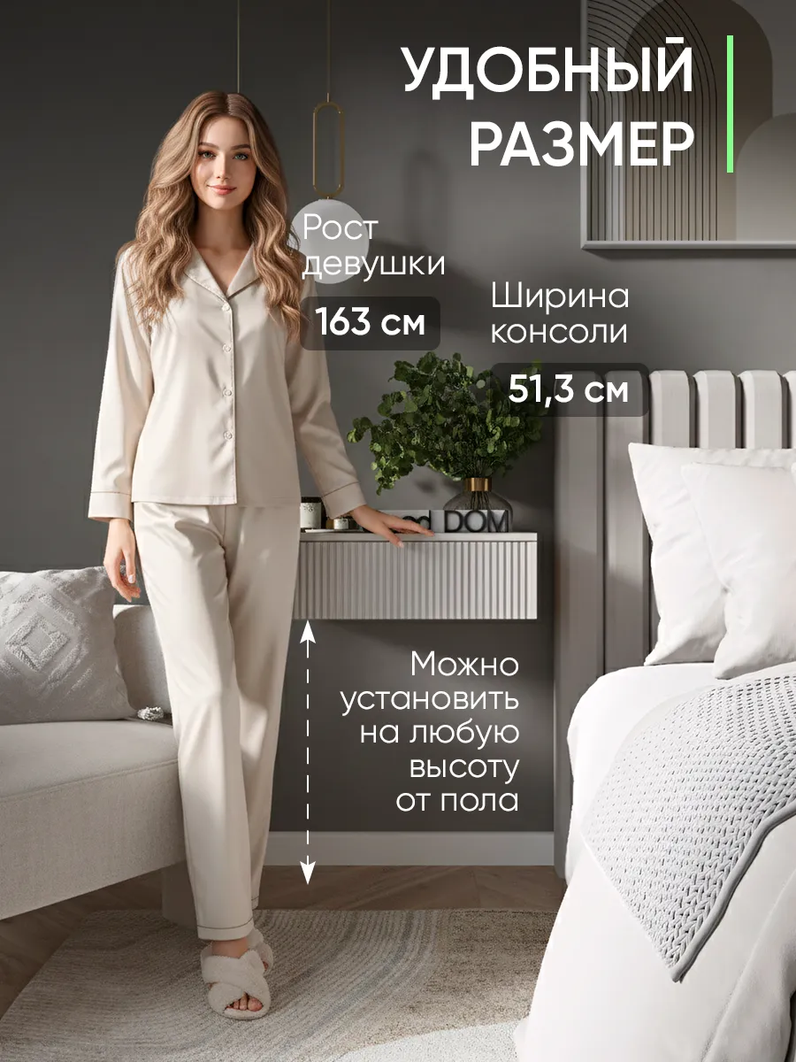 Компактные размеры (51×30×17 см) позволяют разместить модель даже в небольшом пространстве. Вместительный ящик удобен для хранения косметики, парикмахерских аксессуаров или гримерных принадлежностей. Благодаря этому тумбочка превращается в удобный будуарный столик, где всегда под рукой всё необходимое для ежедневных сборов.