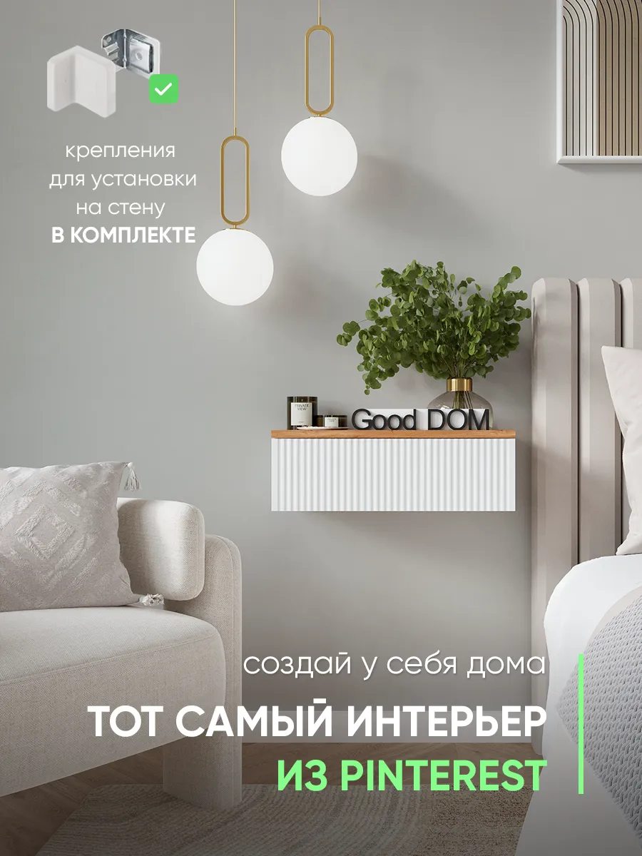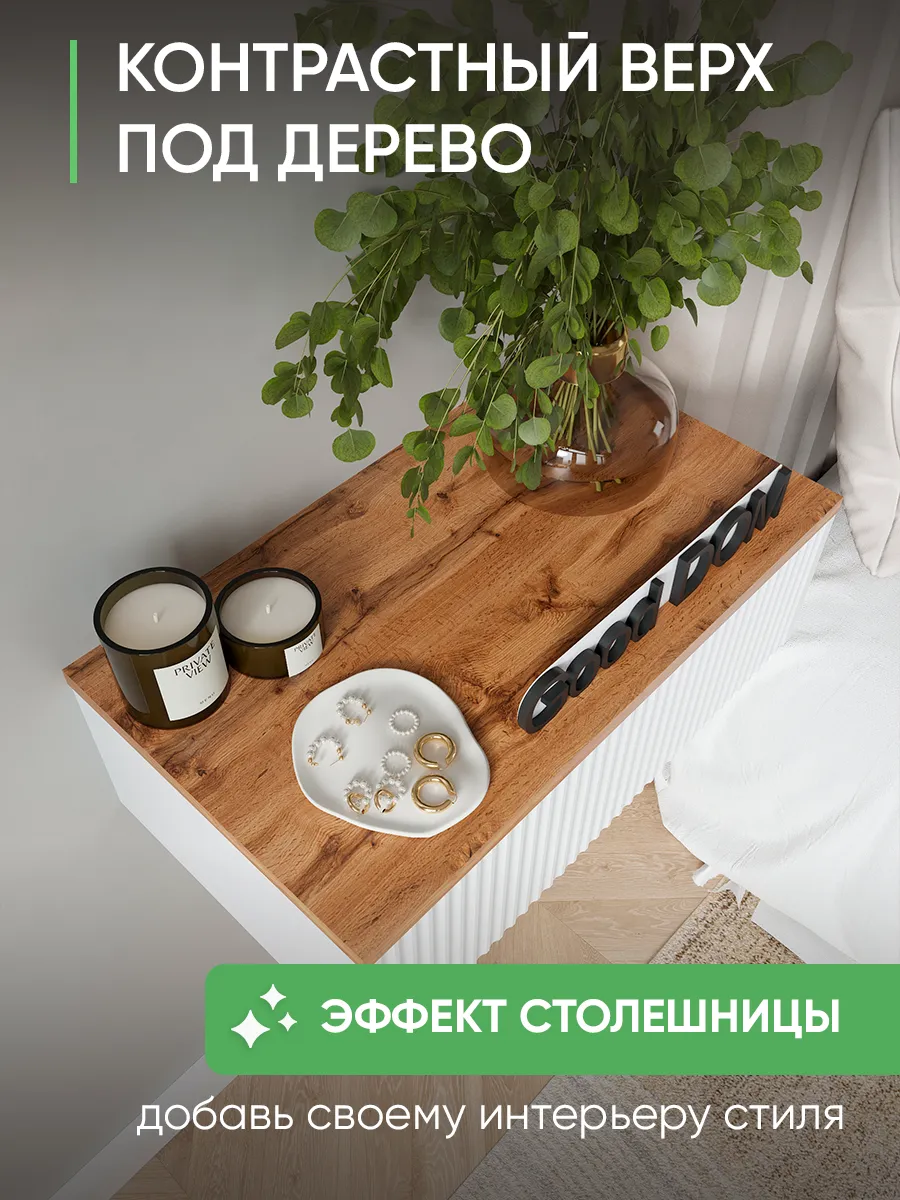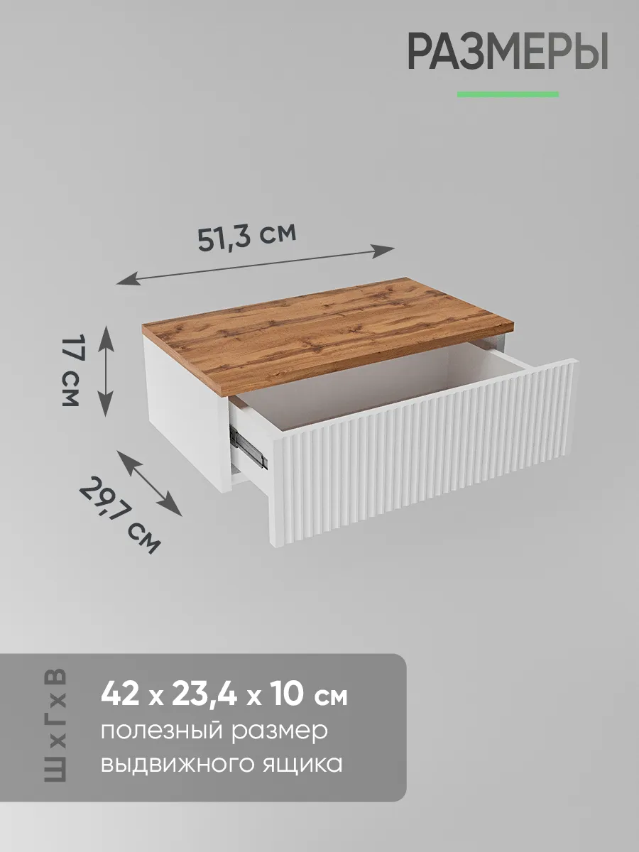 Эта подвесная тумба — универсальный элемент мебели, идеально подходящий для оформления интерьера в стиле лофт, гранд или вотан. Навесной аксессуар обеспечивает удобное хранение и экономит пространство в комнате, будь то гостиная, прихожая, спальня или коридор. Консольный дизайн позволяет разместить тумбочку на стене, создавая эффект парения и визуально облегчая интерьер. Модель выполнена из качественного дуба с рифленым фасадом, что придает изделию выразительность и подчеркивает натуральную текстуру дерева.