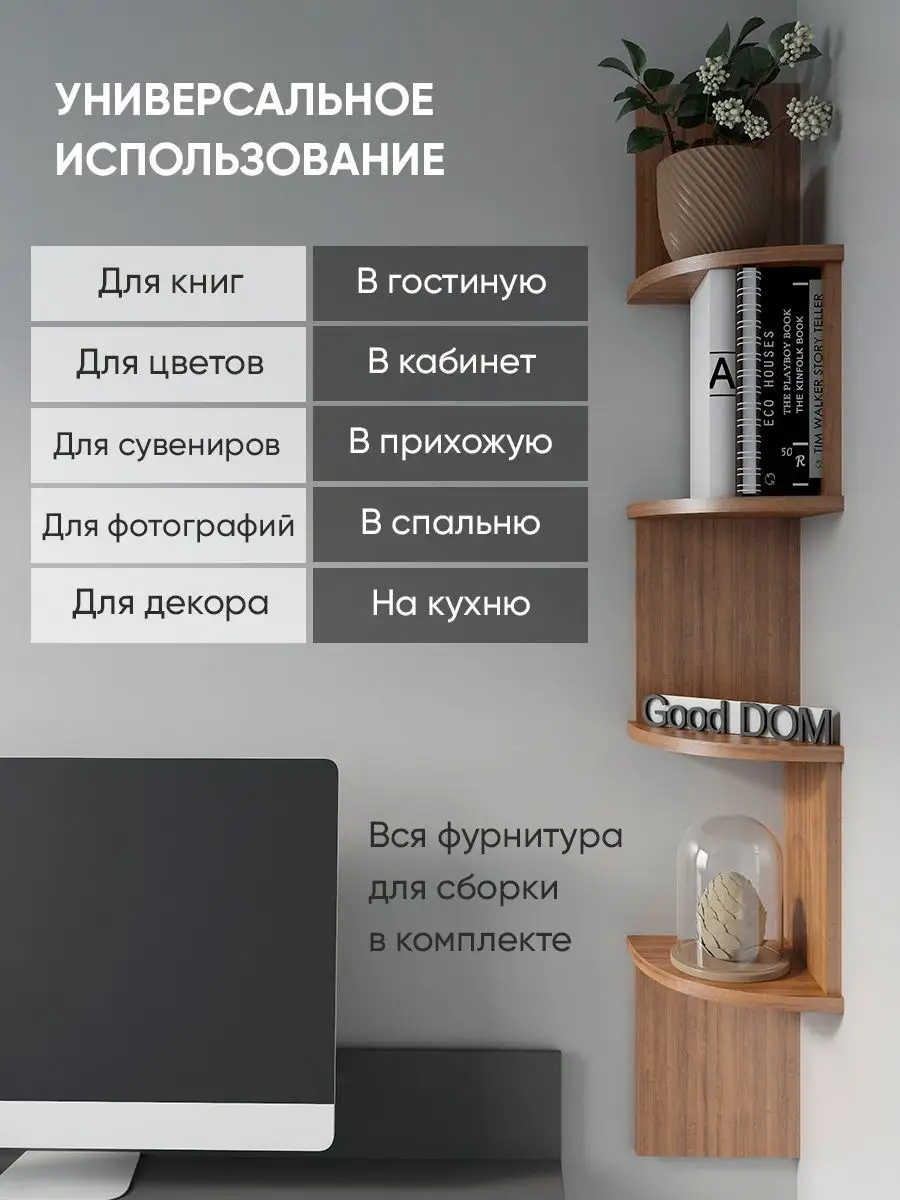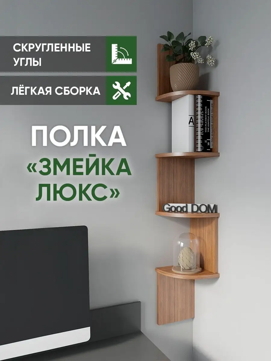 Полка настенная «Змейка Люкс» со скругленными углами – удобный и функциональный предмет мебели. Полка угловая не займёт много места, но уместит множество вещей благодаря открытым полкам. Стильная и нестандартная конструкция подвесной полки в виде змейки, внесет изюминку в любой интерьер и поможет выгодно дополнить его. Настенная угловая деревянная полка стеллаж для дома и гостиной используется как полочка для книг, цветов, растений, роутера, для декора, как полка на стену в детскую для игрушек, фигурок, декора, в спальню для косметики и парфюма и даже для уходовых средств, в туалет для хранения туалетной бумаги. Полка в угол может располагаться на кухне как полка для кухни – для хранения кухонных приборов, икон, специй, посуды и декора для кухни. Полка для книг лаконично впишется и в кабинет для хранения документов. Также полочка может использоваться в качестве садовой мебели для дачи для хранения инструмента, в мастерской. Полка в прихожую настенная для декора и хранения ключей, писем, сумок, зонтика в коридоре. Навесная декоративная полка отличный органайзер, который можно повесить над стиральной машиной или письменным столом. Так же используется для икон, полотенец или медалей. Полка в стиле лофт для квартиры, дачи, офиса, салона, детского центра – подойдёт в любую комнату. Доступные цвета: белая, дуб сонома, венге, орех, дуб атланта. Легкий материал полки ЛДСП практичен, долговечен и прост в уходе. В нашем ассортименте представлена другая мебель интересных и практичных моделей – вы можете легко посмотреть весь ассортимент, щелкнув на значок логотипа. Мы постоянно работаем над качеством нашей продукции, поэтому улучшили упаковку - наша УСИЛЕННАЯ УПАКОВКА ЗАЩИТИТ Вашу Обувницу при доставке ОТ СЛОМАННЫХ УГЛОВ и СКОЛОВ!