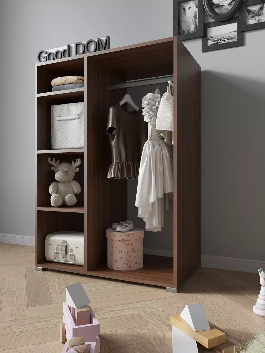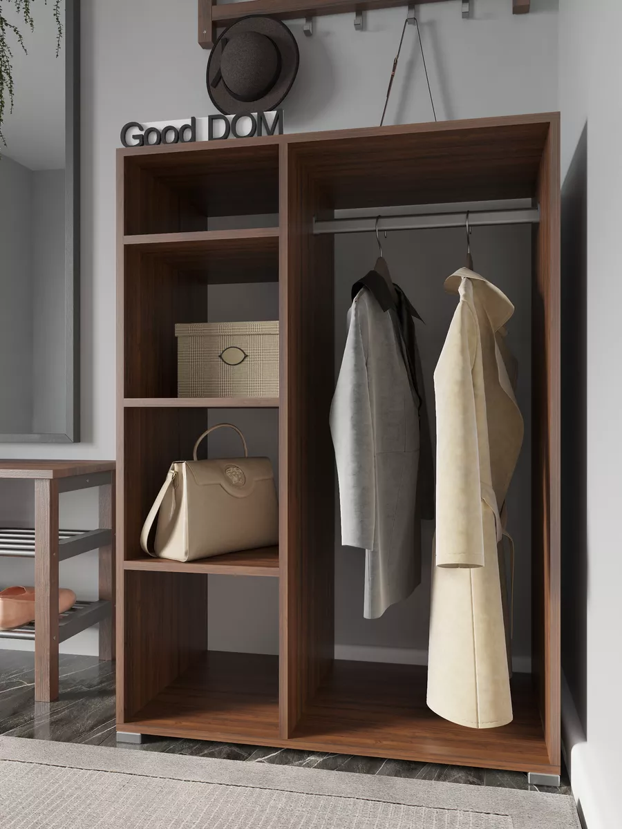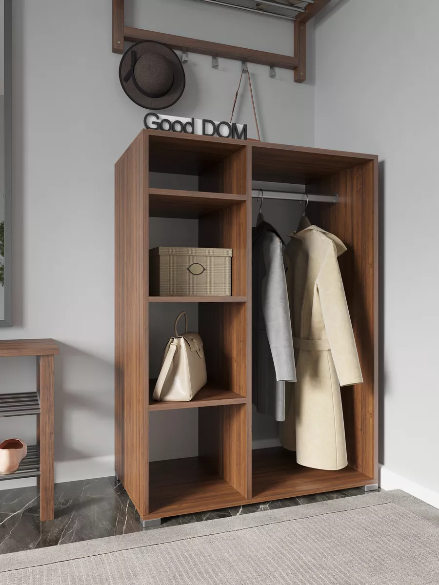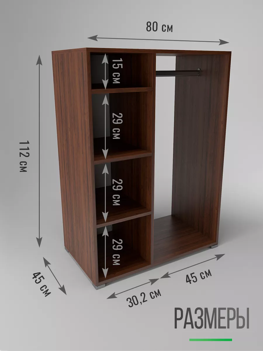 Шкаф мини со штангой и полками. Мини шкаф не займет много места и уместится даже в малогабаритной комнате. Несмотря на компактность, шкаф вместит в себя достаточно много вещей. Четыре вместительные полки и штанга для вешалок - помогут в грамотной организации хранения в прихожей, коридоре, кладовой или гардеробной. В отличие от шкафа пенала - штанга вешалка поможет в компактном и аккуратном хранении верхней одежды. На полках гардеробного шкафа вы сможете расположить сумки, головные уборы, зонты и аксессуары. Открытый шкаф отлично подойдет как для маленькой квартиры, так и для дома, дачи и офиса. Так же шкаф можно разместить в детской для хранения детской одежды как детский шкаф монтессори. Гардероб имеет плательное отделение с хромированной штангой.