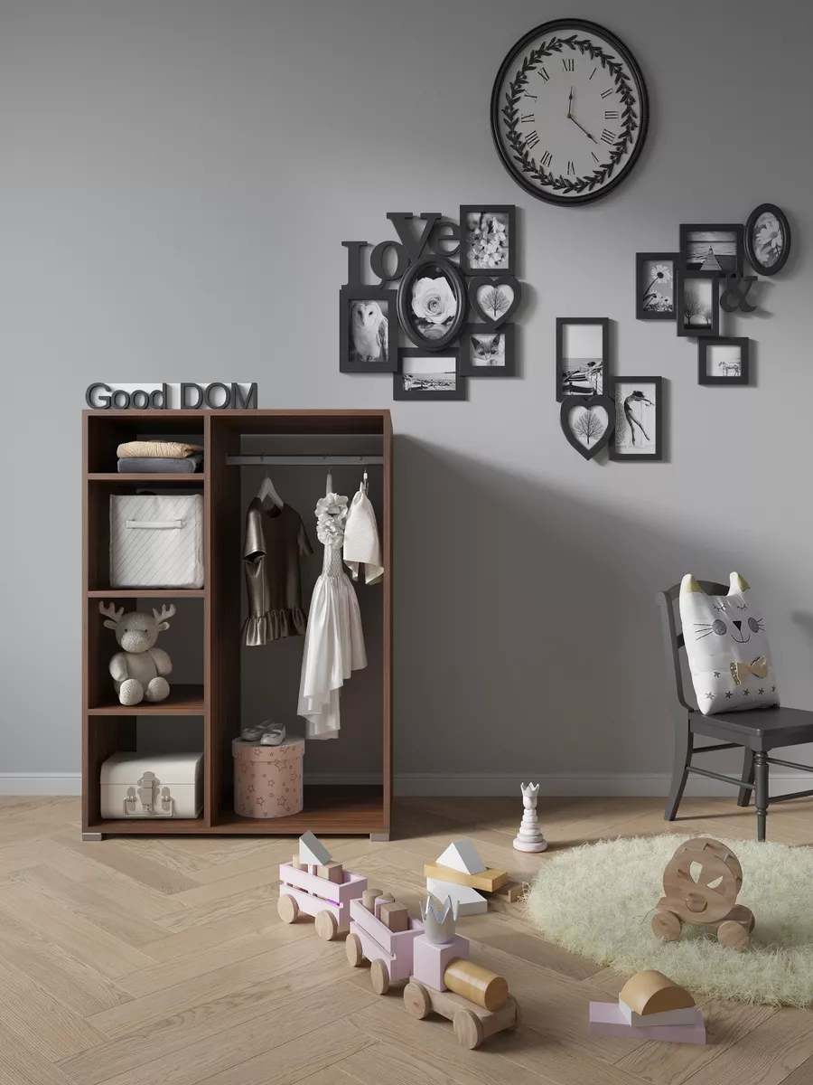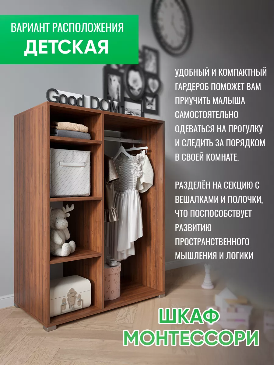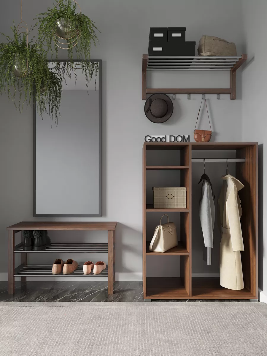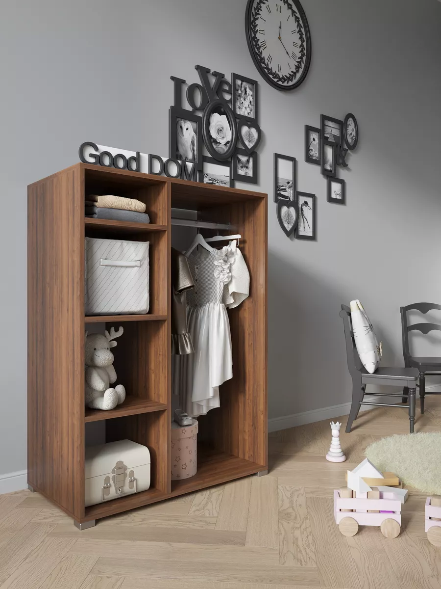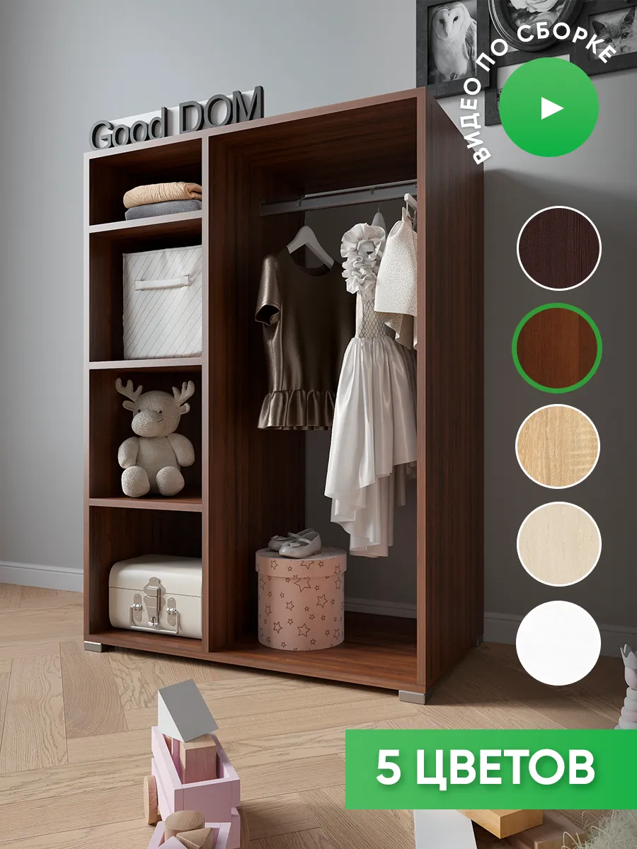 Шкаф мини со штангой и полками. Мини шкаф не займет много места и уместится даже в малогабаритной комнате. Несмотря на компактность, шкаф вместит в себя достаточно много вещей. Четыре вместительные полки и штанга для вешалок - помогут в грамотной организации хранения в прихожей, коридоре, кладовой или гардеробной. В отличие от шкафа пенала - штанга вешалка поможет в компактном и аккуратном хранении верхней одежды. На полках гардеробного шкафа вы сможете расположить сумки, головные уборы, зонты и аксессуары. Открытый шкаф отлично подойдет как для маленькой квартиры, так и для дома, дачи и офиса. Так же шкаф можно разместить в детской для хранения детской одежды как детский шкаф монтессори. Гардероб имеет плательное отделение с хромированной штангой.