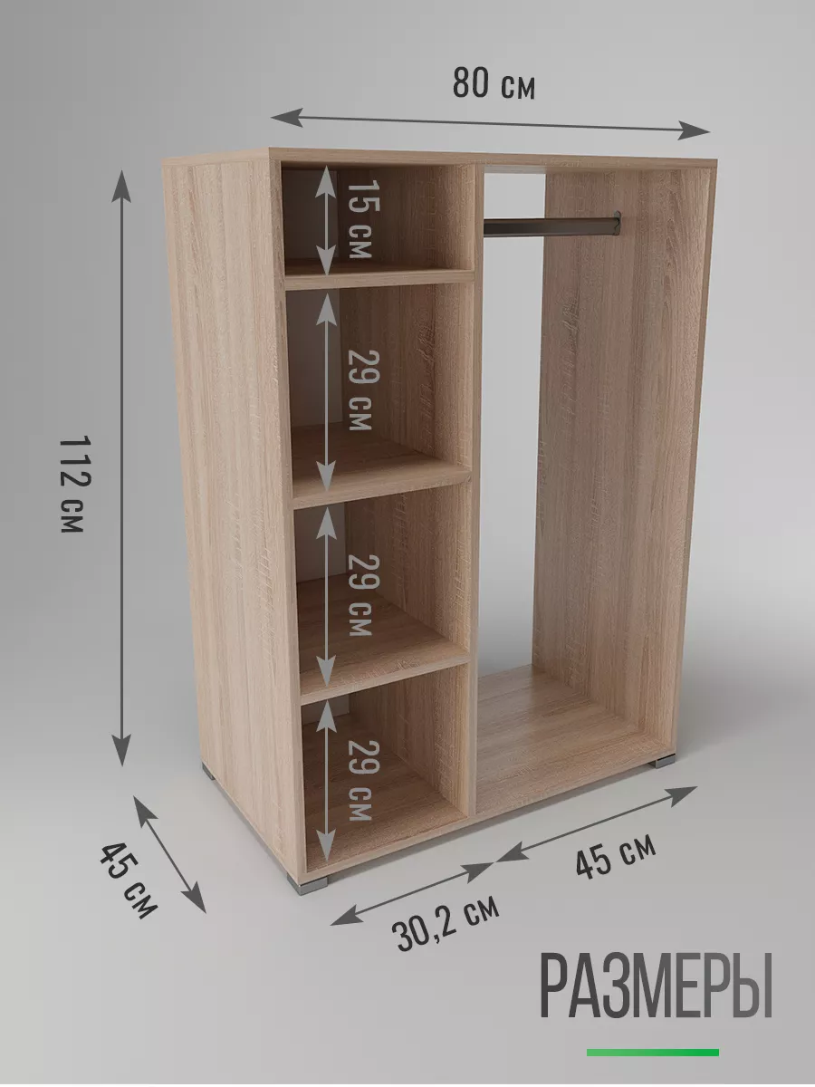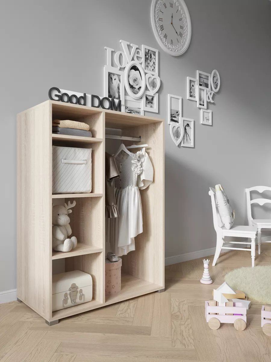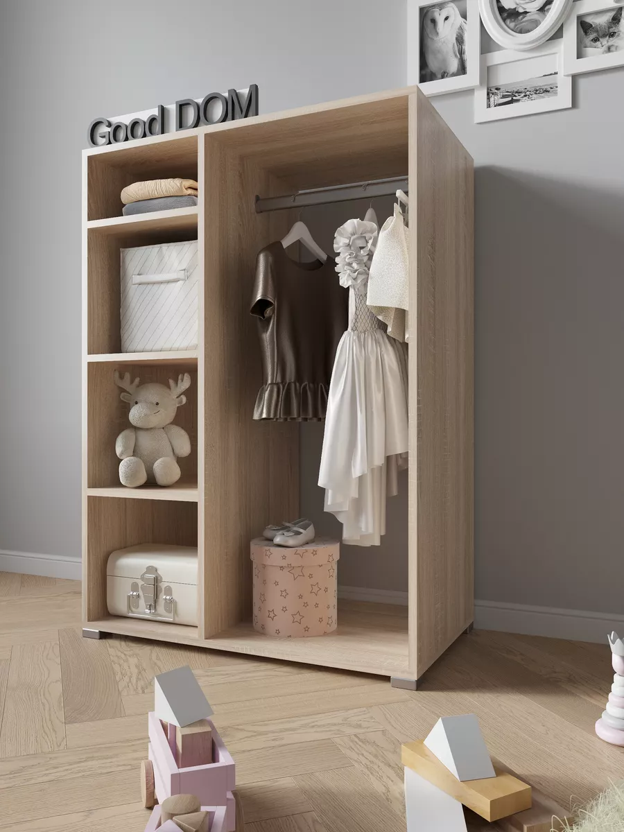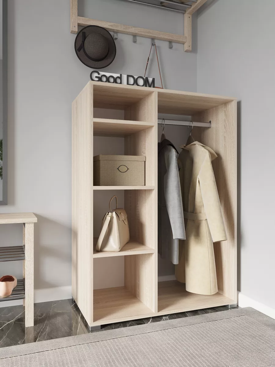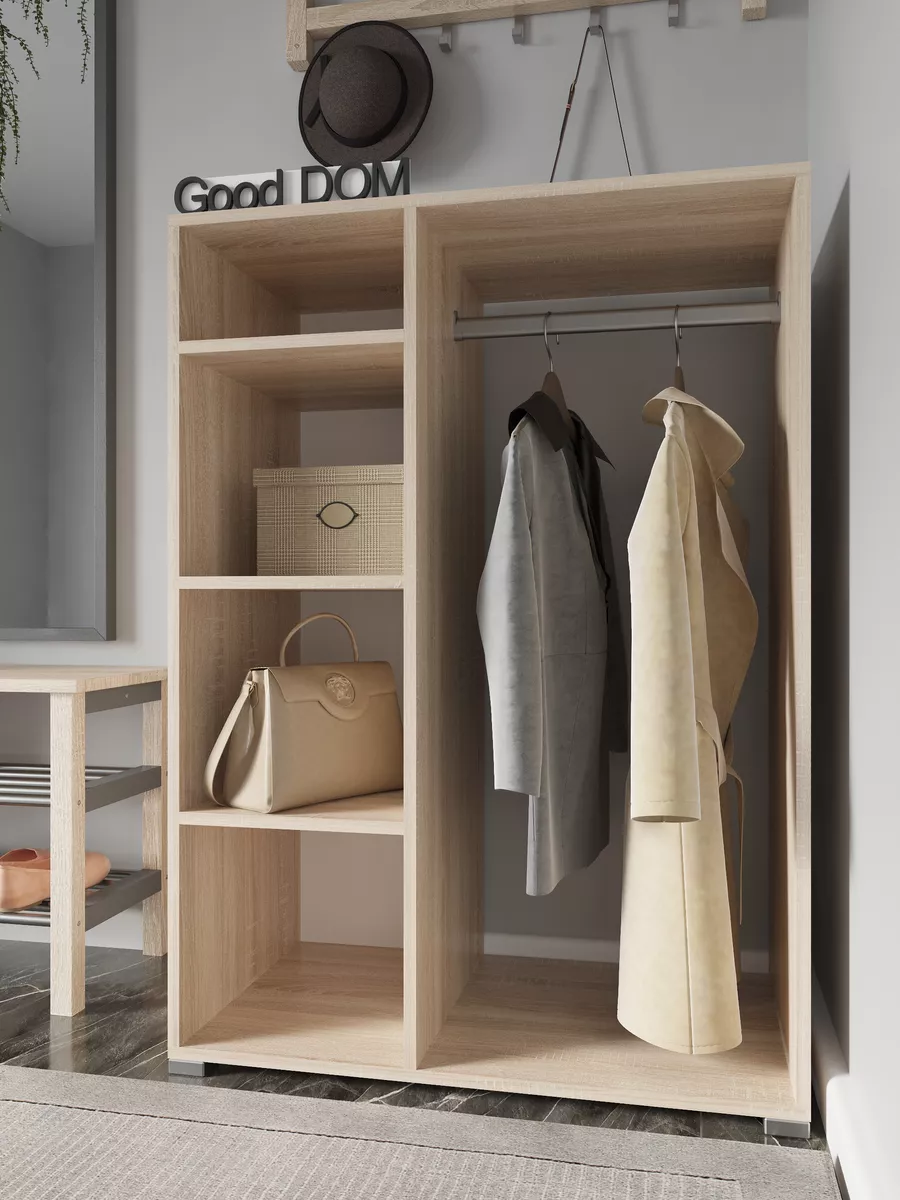 Шкаф мини со штангой и полками. Мини шкаф дуб сонома без дверей не займет много места и уместится даже в малогабаритной комнате. Несмотря на компактность, шкаф для спальни вместит в себя достаточно много вещей. Четыре вместительные полки и штанга для вешалок - помогут в грамотной организации хранения в прихожей, коридоре, кладовой или гардеробной. В отличие от шкафа пенала - штанга вешалка поможет в компактном и аккуратном хранении верхней одежды. На полках гардеробного шкафа вы сможете расположить сумки, головные уборы, зонты и аксессуары. Открытый шкаф для одежды, белья отлично подойдет как для маленькой квартиры, так и для дома, дачи и офиса. Так же шкафчик можно разместить в детской для хранения детской одежды как детский шкаф монтессори. Гардероб имеет плательное отделение с хромированной штангой. Этот маленький шкаф идеальный вариант мебели для игрушек в детскую комнату или в гостиную.