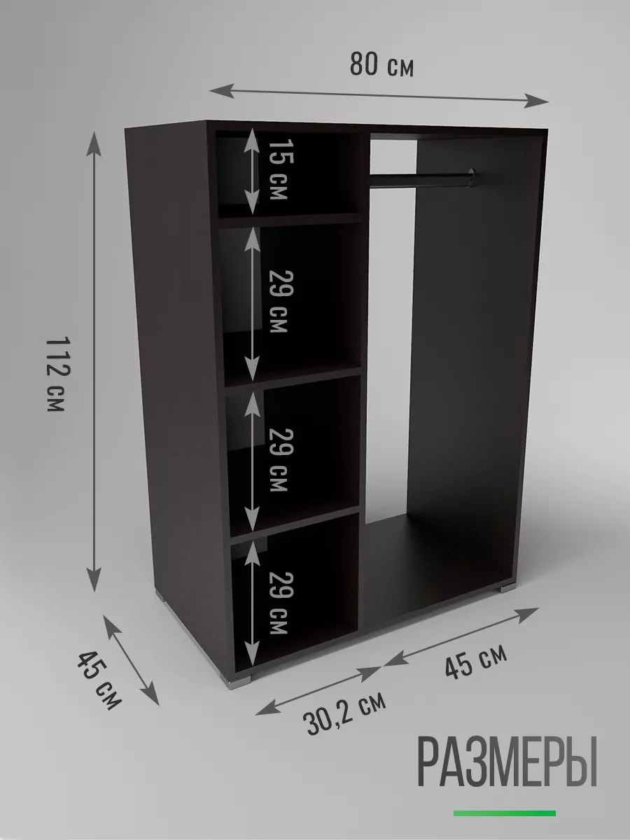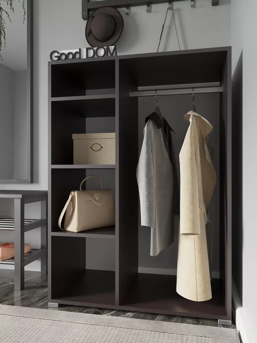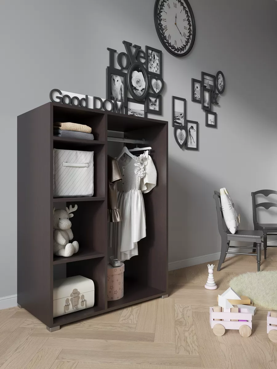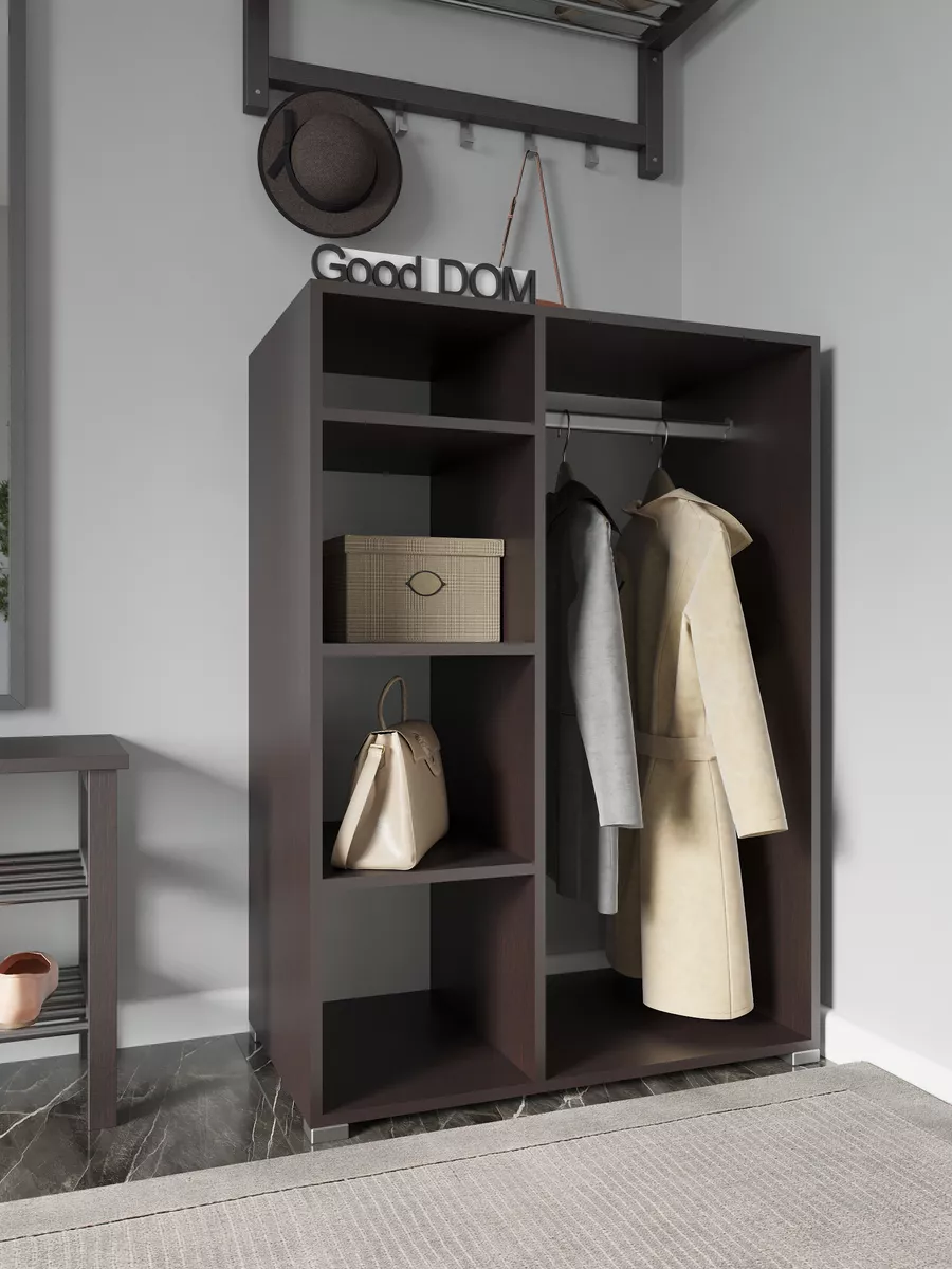 Шкаф мини со штангой и полками. Мини шкаф венге без дверей не займет много места и уместится даже в малогабаритной комнате. Несмотря на компактность, шкаф для спальни вместит в себя достаточно много вещей. Четыре вместительные полки и штанга для вешалок - помогут в грамотной организации хранения в прихожей, коридоре, кладовой или гардеробной. В отличие от шкафа пенала - штанга вешалка поможет в компактном и аккуратном хранении верхней одежды. На полках гардеробного шкафа вы сможете расположить сумки, головные уборы, зонты и аксессуары. Открытый шкаф для одежды, белья отлично подойдет как для маленькой квартиры, так и для дома, дачи и офиса. Так же шкафчик можно разместить в детской для хранения детской одежды как детский шкаф монтессори. Гардероб имеет плательное отделение с хромированной штангой. Этот маленький шкаф идеальный вариант мебели для игрушек в детскую комнату или в гостиную.