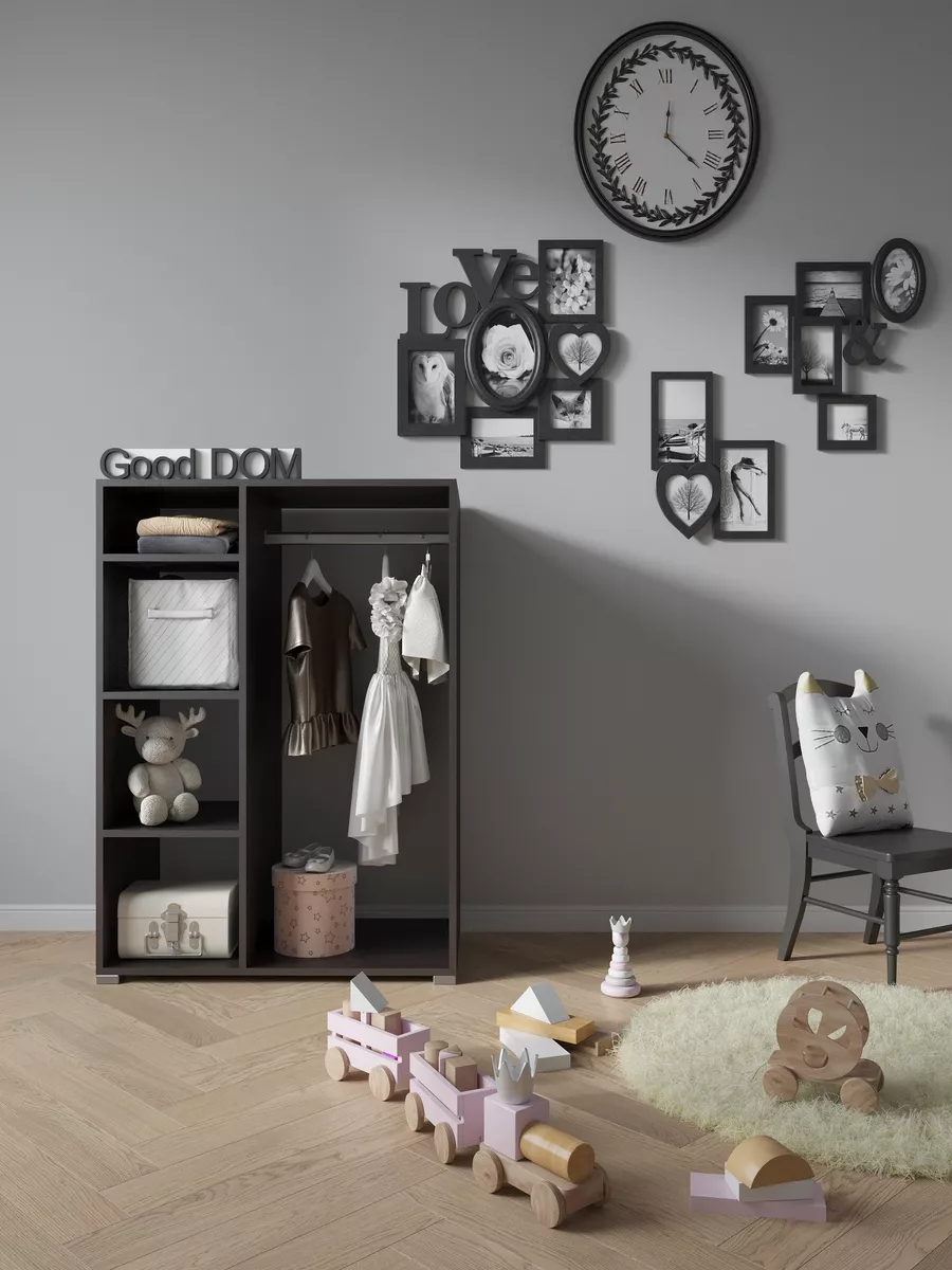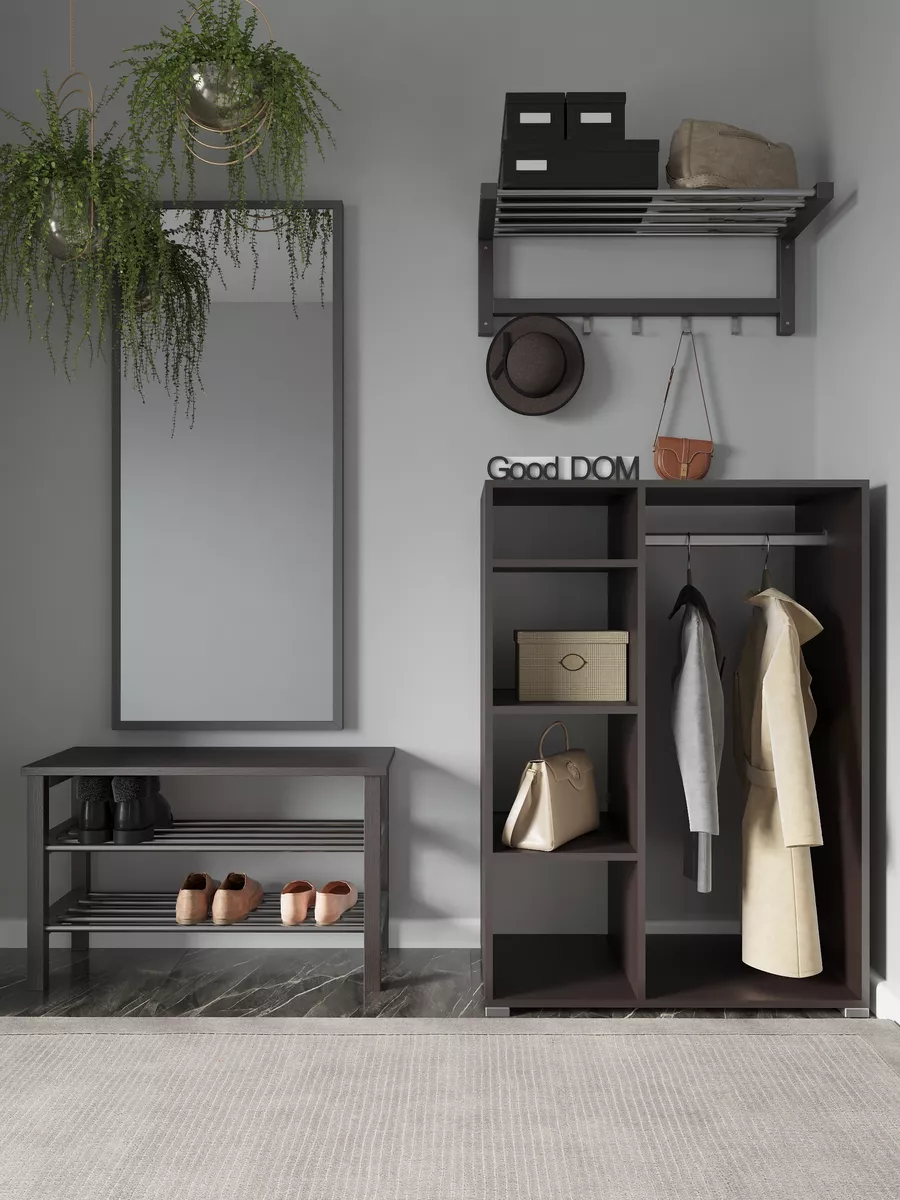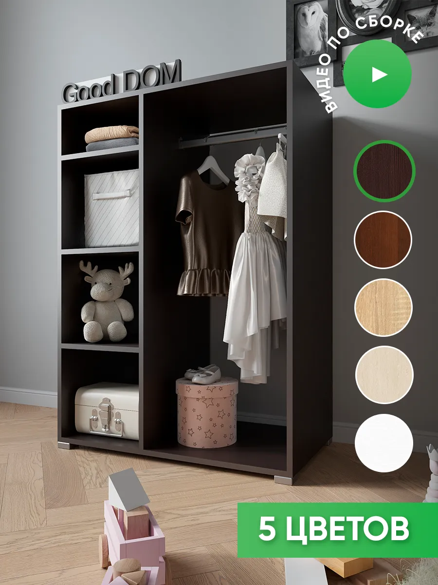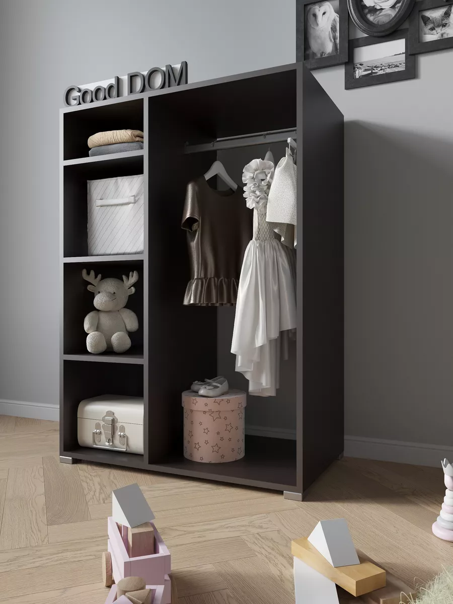 Шкаф мини со штангой и полками. Мини шкаф венге без дверей не займет много места и уместится даже в малогабаритной комнате. Несмотря на компактность, шкаф для спальни вместит в себя достаточно много вещей. Четыре вместительные полки и штанга для вешалок - помогут в грамотной организации хранения в прихожей, коридоре, кладовой или гардеробной. В отличие от шкафа пенала - штанга вешалка поможет в компактном и аккуратном хранении верхней одежды. На полках гардеробного шкафа вы сможете расположить сумки, головные уборы, зонты и аксессуары. Открытый шкаф для одежды, белья отлично подойдет как для маленькой квартиры, так и для дома, дачи и офиса. Так же шкафчик можно разместить в детской для хранения детской одежды как детский шкаф монтессори. Гардероб имеет плательное отделение с хромированной штангой. Этот маленький шкаф идеальный вариант мебели для игрушек в детскую комнату или в гостиную.