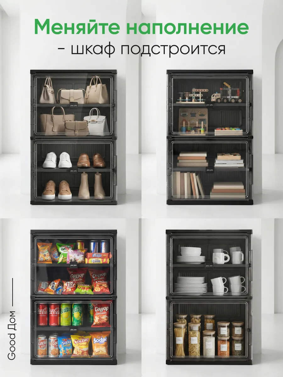 Модульная система позволяет использовать шкаф как стеллаж пластиковый, органайзер для хранения, шкаф для обуви, шкаф для игрушек, шкаф для книг, шкаф для продуктов или систему хранения для дома. Модули можно комбинировать по высоте, устанавливать рядом или друг на друга, создавая индивидуальную систему хранения под свои задачи.