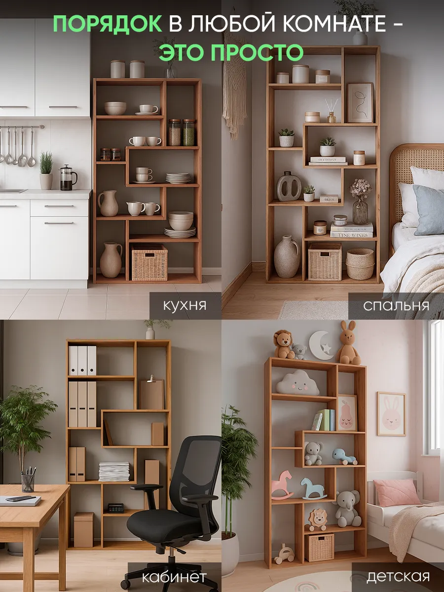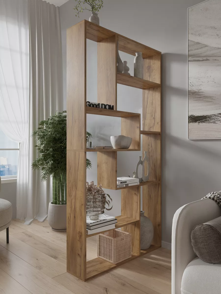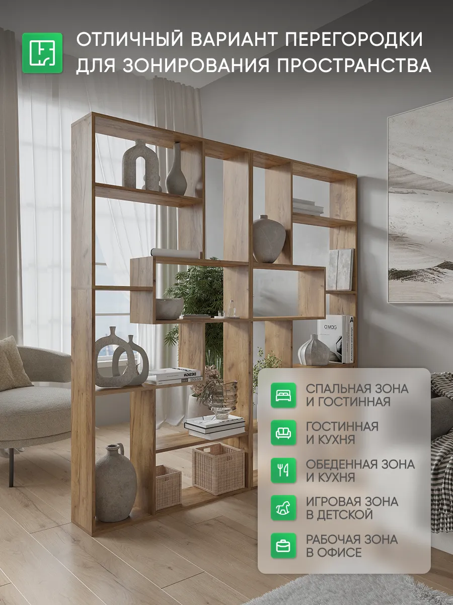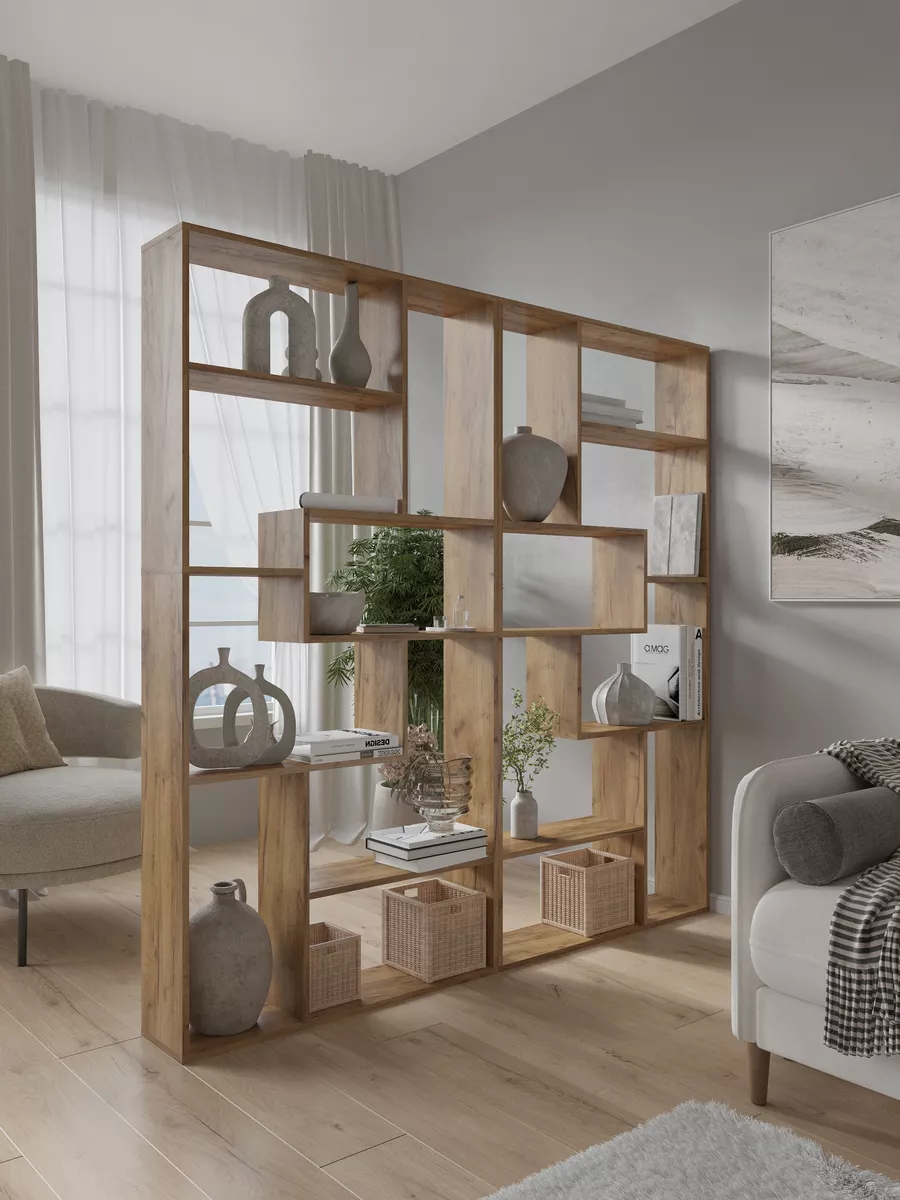 Универсальный стеллаж-перегородка отлично подходит для зонирования пространства в доме, офисе или детской комнате. Мебель сборная и легкая, что упрощает процесс установки и перемещения по полу. Конструкция создана из деревянных элементов и обладает стильным лофт-видом, благодаря чему гармонично вписывается в интерьер гостиной, спальни, кухни или прихожей. Такой стеллаж удобен для хранения книг, игрушек, вещей, мелочей и подходящих аксессуаров. Открытые секции и полки позволяют использовать пространство рационально, а угловой или горизонтальный способ расположения делает систему хранения по-настоящему универсальной.