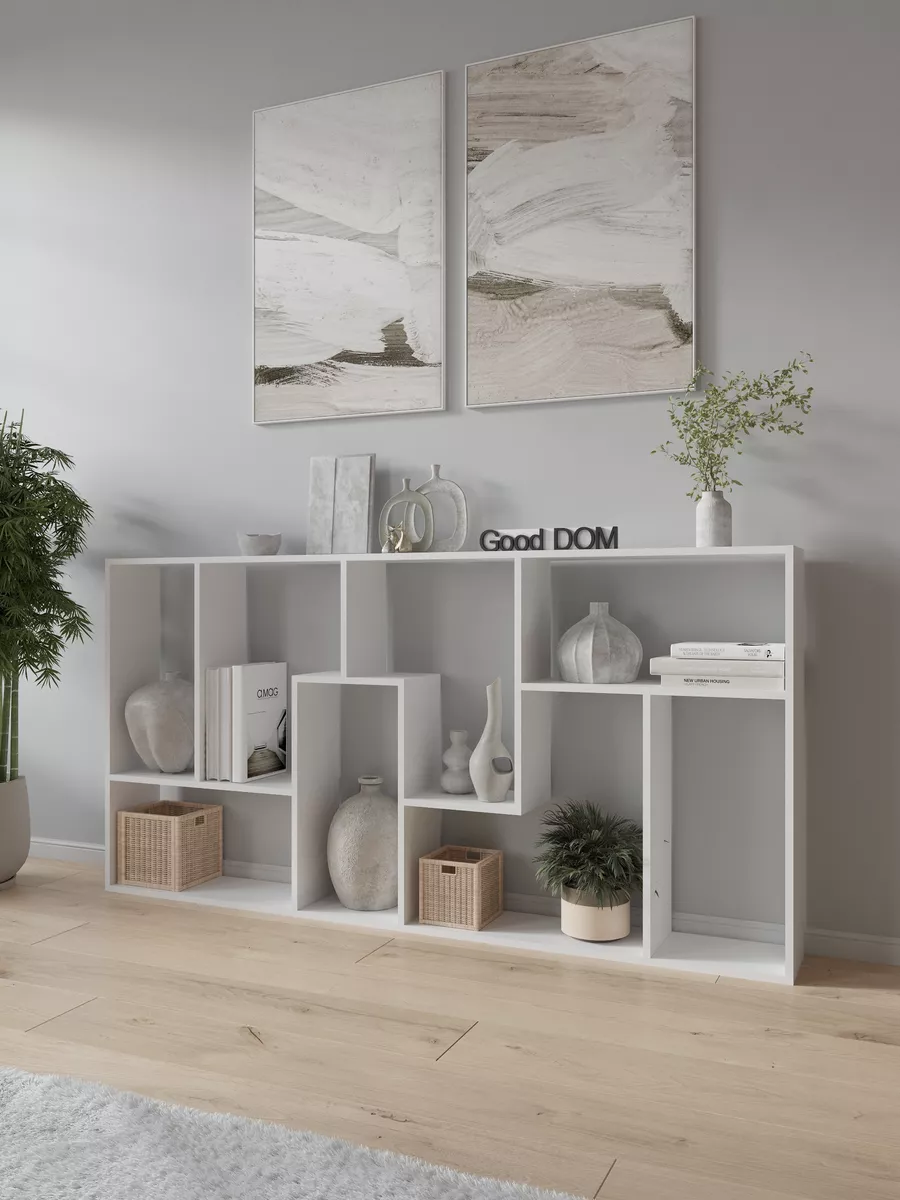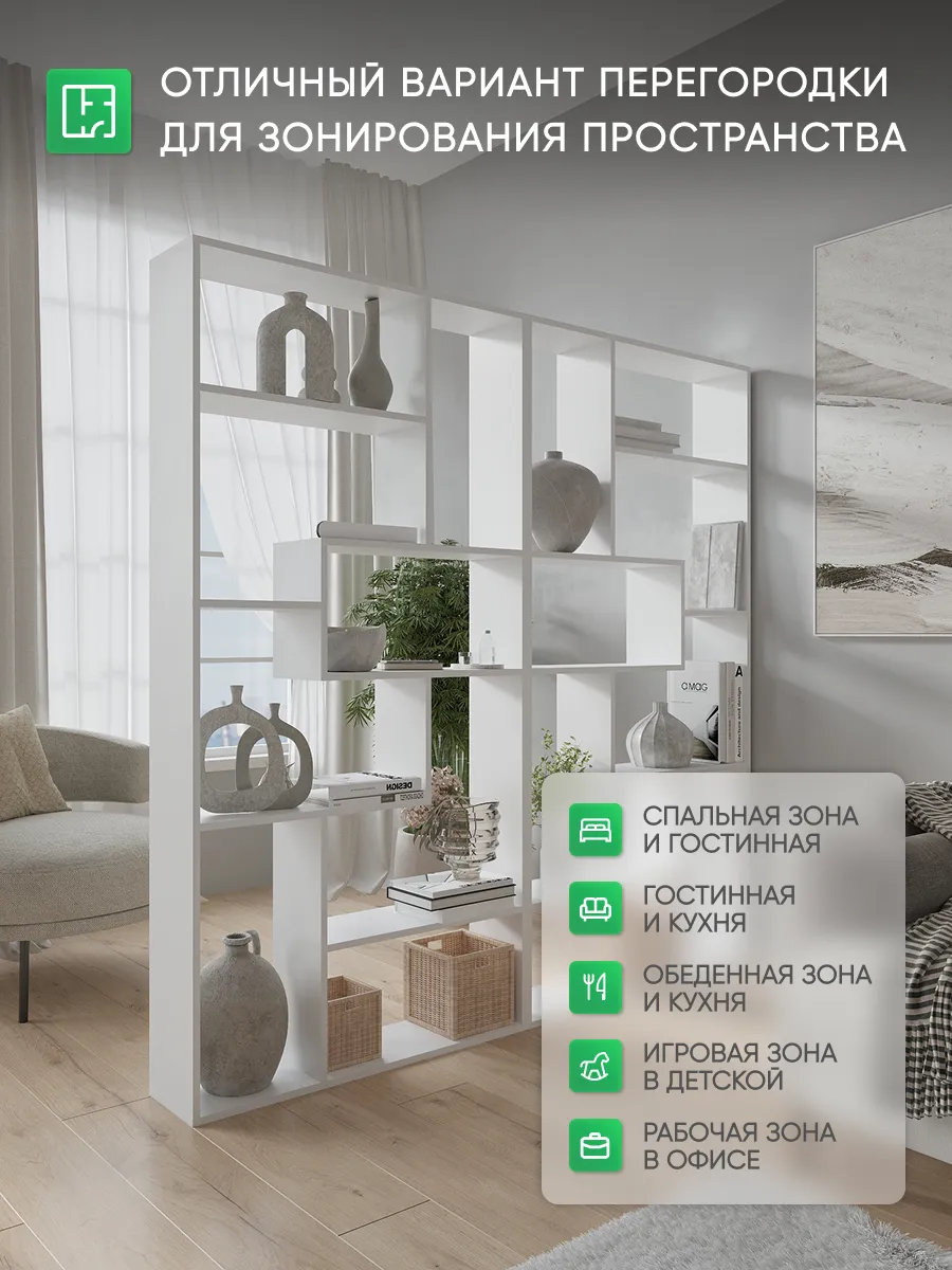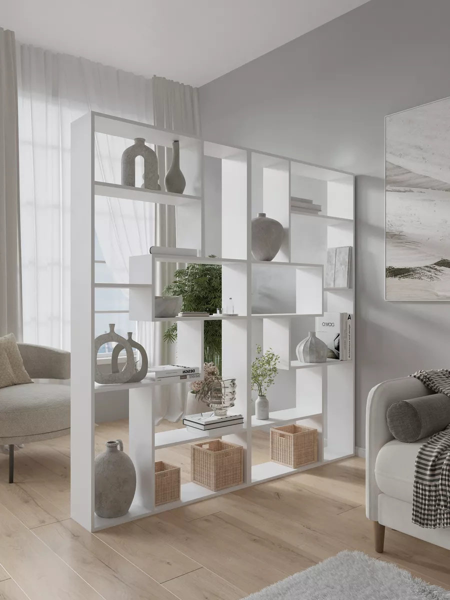 Стеллаж перегородка идеально подойдет для зонирования пространства в доме или офисном помещении. Этот небольшой и узкий шкаф обеспечивает функциональное разделение комнаты, создавая уютный уголок для работы или отдыха. Конструкция включает несколько полок, которые легко разместят книги, декоративные растения, детские игрушки и мелочи. Вертикальный и напольный вариант мебели отлично впишется в интерьер гостиной, кухни, кабинета или прихожей, объединяя стиль и практичность. Благодаря угловой форме и небольшой глубине изделие не занимает много места, но при этом сохраняет высокую функциональность и удобство сборки.