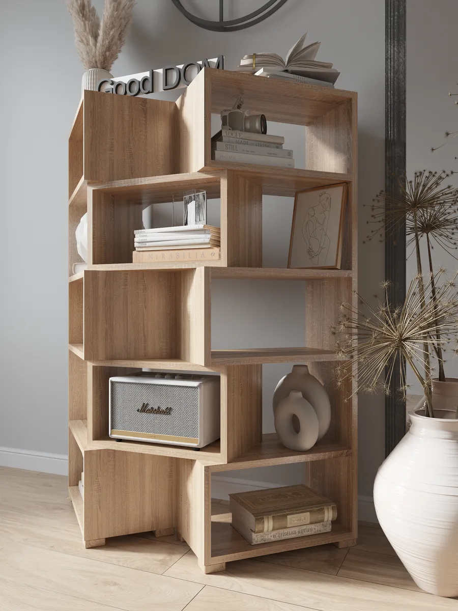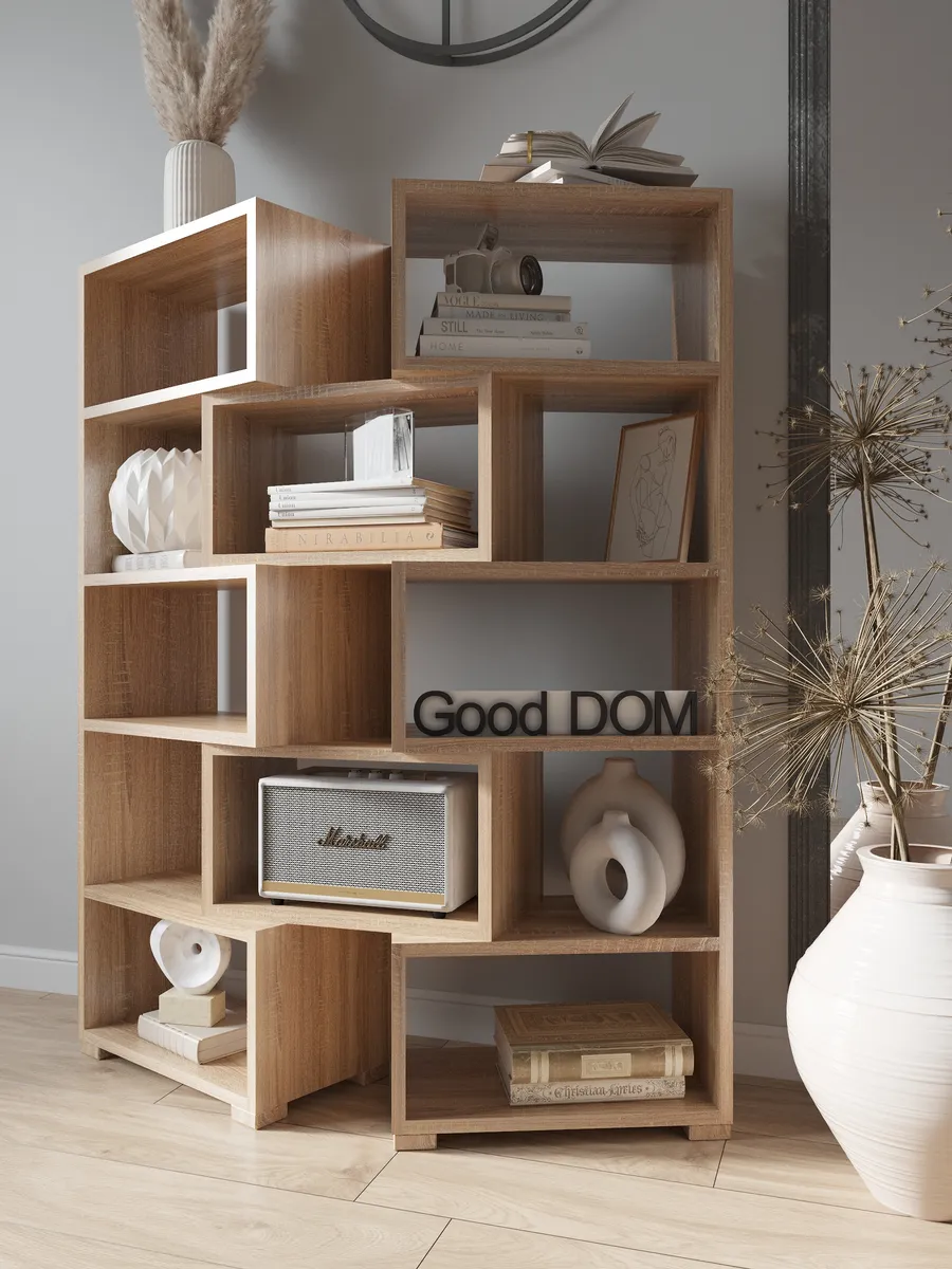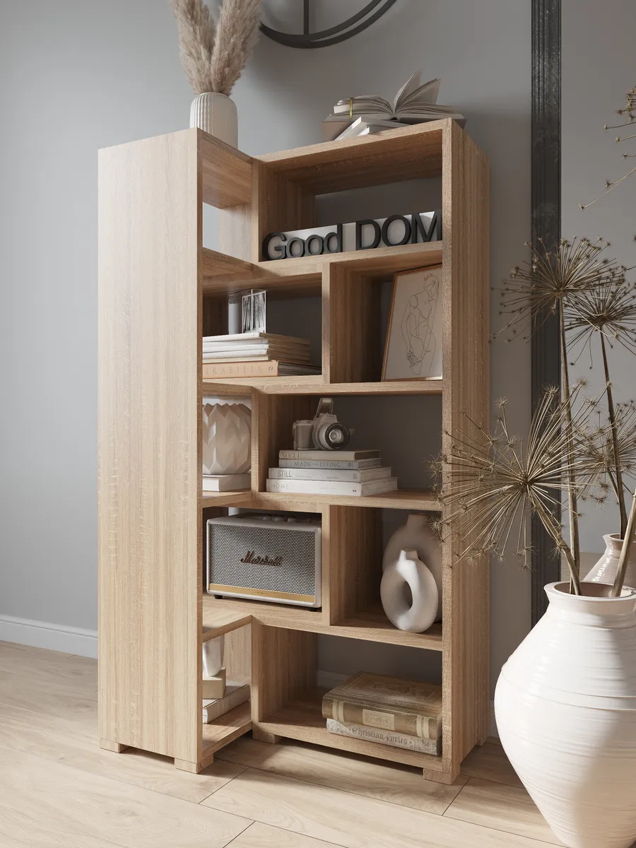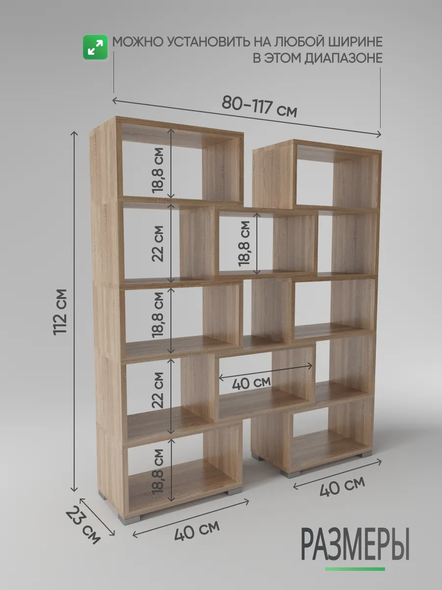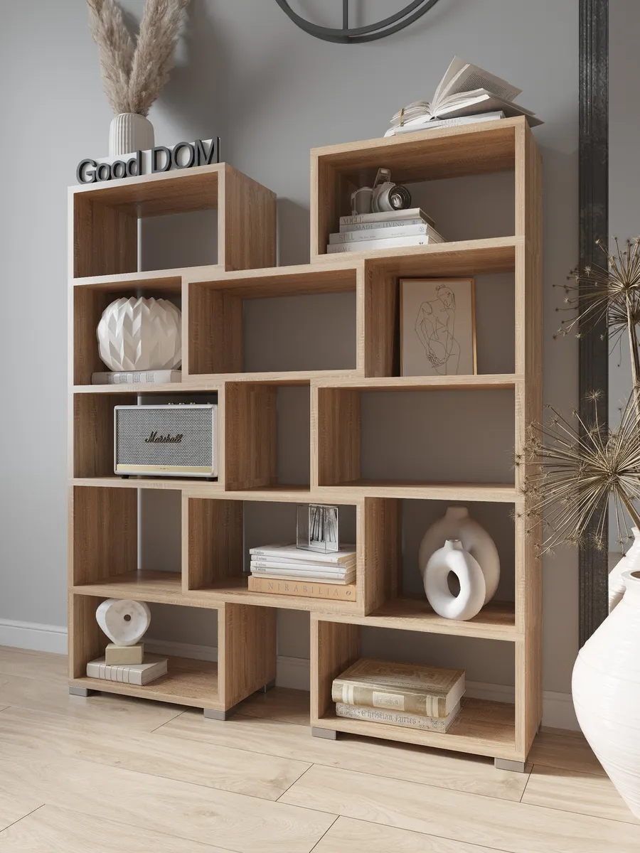 Стеллаж "Тетрис" не зря имеет такое название. Особенность такого стеллажа - это регулируемая ширина и расположение боковых элементов. Стелаж можно собрать под углом или наклоном - так как нравится и подходит именно вам. Стеллаж-трансформер отличное интерьерное решение для гостиной, коридора прихожей, балкона, спальни или детской. Множество открытых полок стеллажика помогут разместить все необходимые вам вещи, а необычная форма напольной полки поможет сделать ваш интерьер интереснее. Шкаф вместительный, но узкий - что позволит с максимальной пользой использовать свободное пространство и уместить его даже в маленькой комнате. Книжный стеллаж будет удобен для зонирования пространства как перегородка между зонами. Его используют в качестве перегородки и эффектного расположения интерьерных украшений: статуэток и гипсовых фигур, свечей и ароматических диффузоров, фотографий в рамках, маленьких горшочков с живыми цветами или искусственных декоративных растений, плетеных корзинок из лозы, книг и журналов, разных аксессуаров. Так же стеллаж может с легкостью стать книжным шкафом для удобного хранения любимых книг. Кроме того, ваши любимые растения и цветы так же могут найти свое место на стеллаже. Нестандартные, разного размера секции для хранения помогут сделать ваш интерьер современным. При своих компактных размерах стеллаж с полками достаточно вместительный. Стеллаж в прихожей найдет свое место под аксессуары или сумки - открытый шкаф в коридор. Наш стеллаж изготовлен на новом оборудовании из высококачественных материалов ЛДСП. Мы дорожим качеством и внешним видом нашей продукции, поэтому вся продукция проверяется перед отправкой отделом контроля и упаковывается в коробки с дополнительной твердой защитой. В нашем ассортименте есть много интересных моделей мебели, что позволяет собрать комплект мебели от бренда Good дом, все в Дом, которая сочетается между собой. Чтобы посмотреть всё - просто нажмите на иконку логотипа.